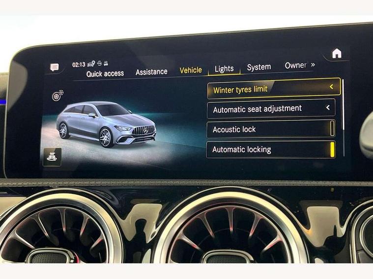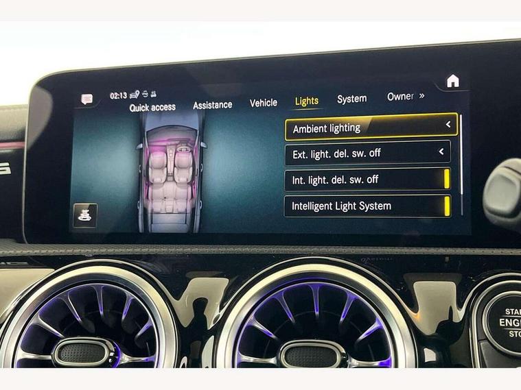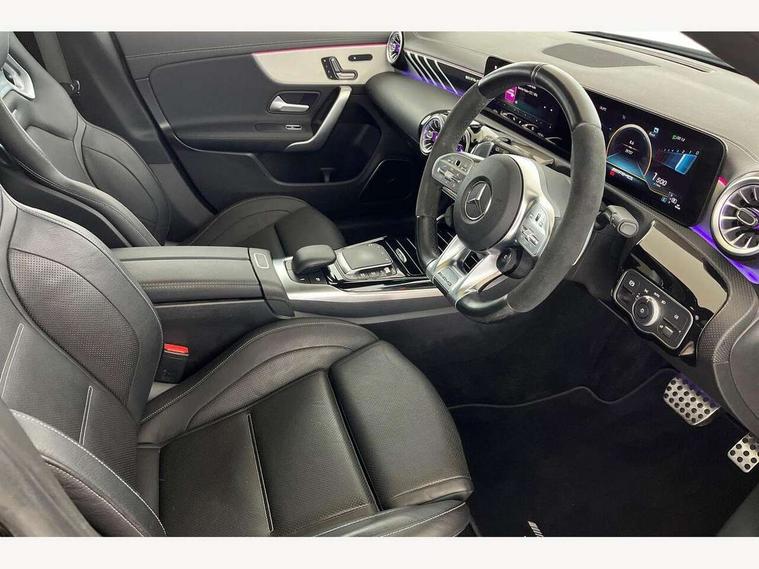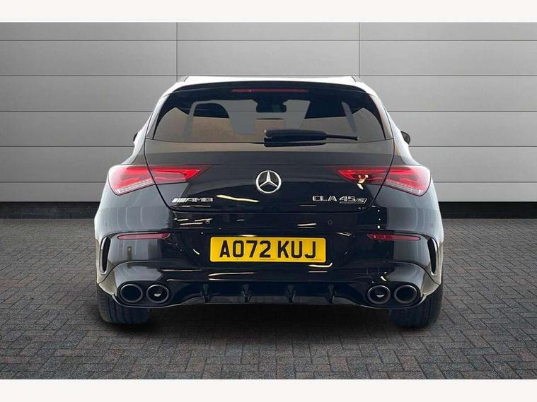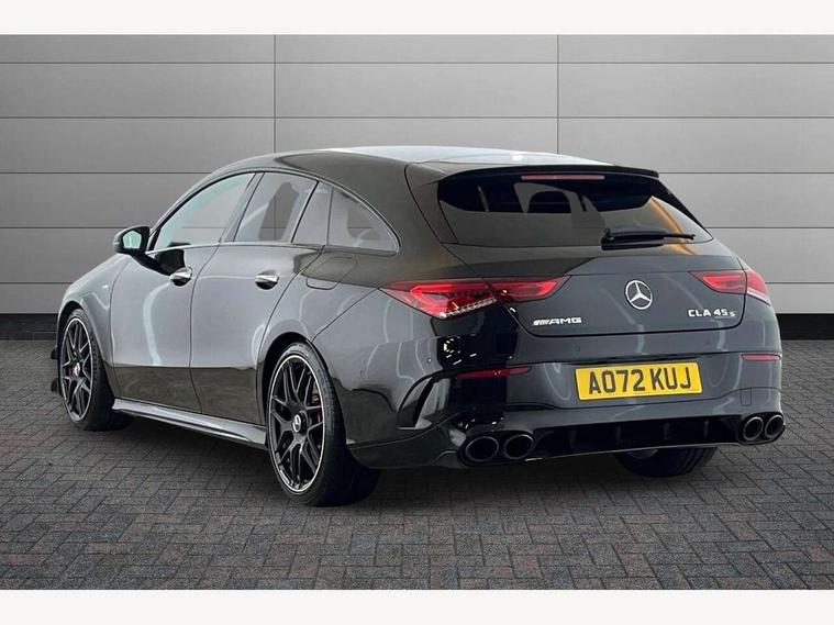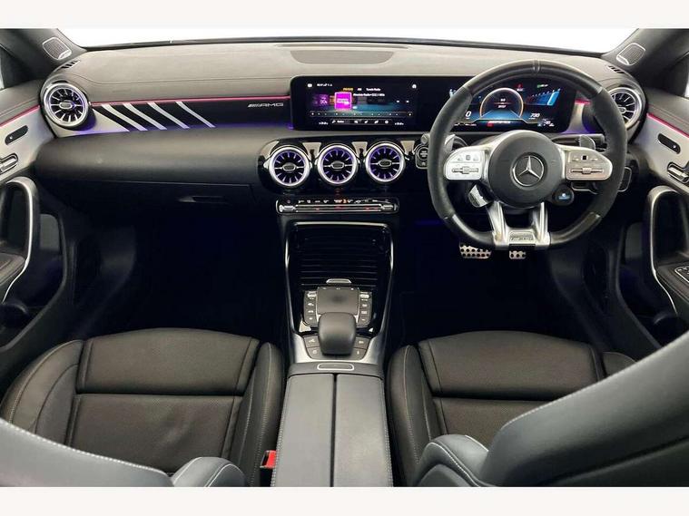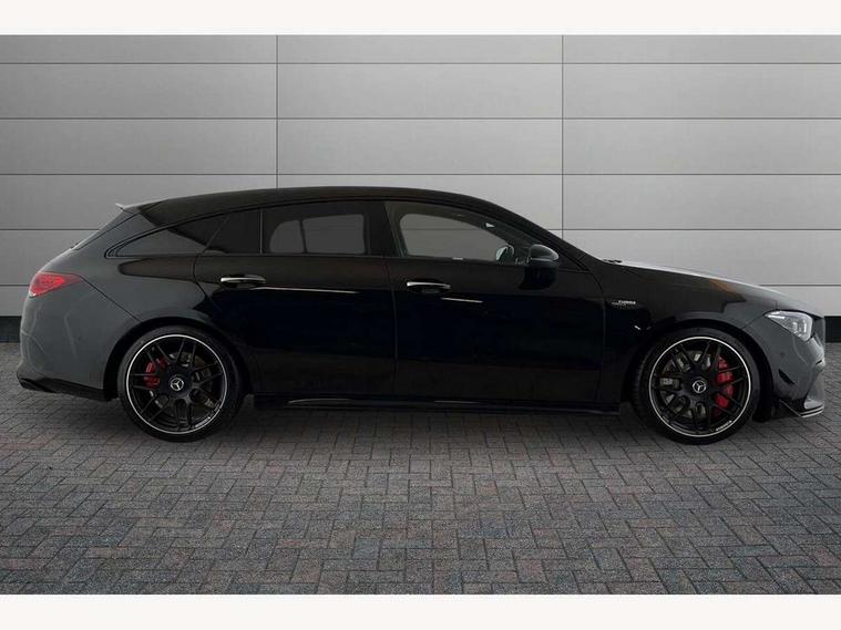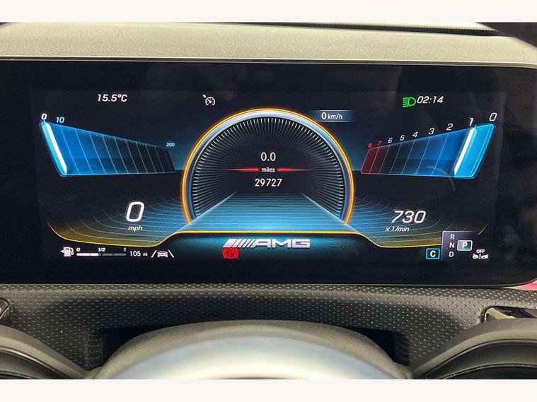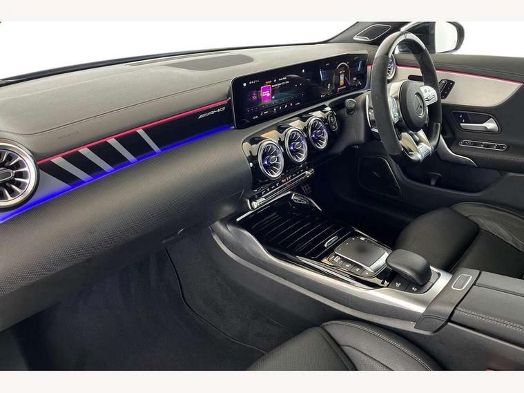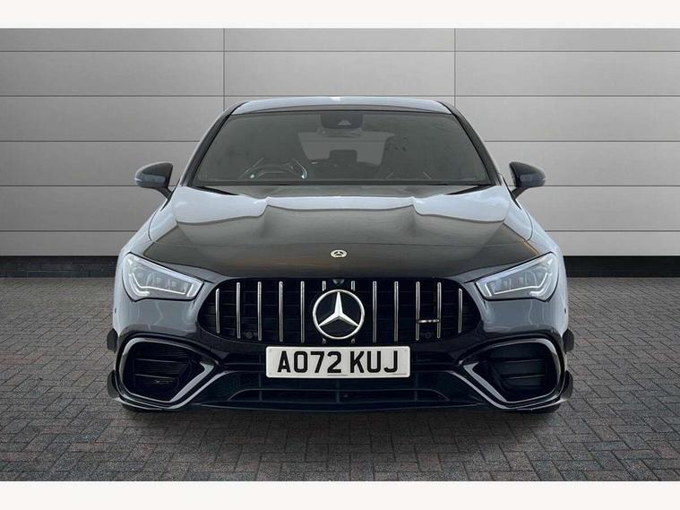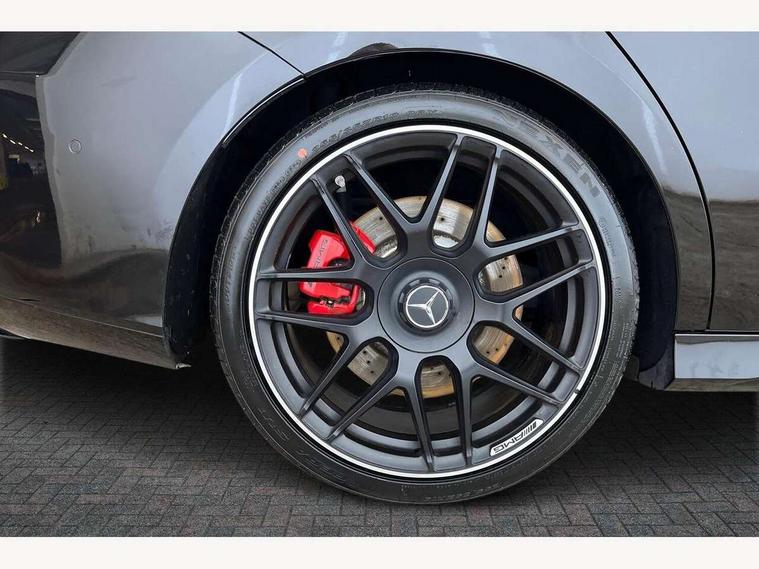 10.25 inch Instrument display with digital cockpit, 10.25 inch touchscreen central media display with AMG specific, AMG start up logo, visualisation of the AMG drive programs, vehicle and engine data, Active lane keeping assist, AMG DYNAMIC SELECT with drive programs Slippery, Comfort, Sport, Sport+, Individual and RACE including Drift mode activated + RACE START function, AMG menu with sporty additional information - Gear indicator with yellow M symbol manual mode, Warm Up menu and Set Up menu, Attention assist - Monitors steering behaviour and long journey fatigue, Blind spot assist, Bluetooth connection, Car wash mode, Cruise control with limiter, Direct steer system with AMG speed sensitive power steering with two sets of steering characteristics, ECO start/stop function, Fluid level warning indicator for fuel, oil, coolant and washer fluid, Hard-disk navigation, Hey Mercedes Voice activation, Lamp failure indicator, Mercedes me connect including emergency call system, accident recovery, breakdown and maintenance management, Mercedes me remote services, Outside temperature gauge, Owners manual and service booklet in English, Pre-installation of private car share, Preinstallation for Mercedes Benz link, Radio aerial integrated into front and rear windshields, Service indicator (ASSYST), Smartphone integration with Apple CarPlay and Android auto, Speed limit assist, Traffic sign assist, Trip computer in multifunction display with current consumption indicator, 4MATIC permanent four wheel drive, AMG performance 4MATIC+ with torque control distribution, Rear axle multi-link, Suspension with adaptive damping system, DAB digital radio tuner, MBUX multimedia system, Mid-range sound system, USB (type C) ports (2) in stowage compartment and 1 in front of centre console, Adaptive brake lights, AMG body styling specific front apron, AMG side sill panels, AMG rear apron, AMG roof spoiler lip, Specific S labelling boot lid + front apron CLA 45, AMG specific radiator grille in high gloss chrome with AMG lettering, AMG specific radiator grille with a wider lower contour and twelve vertical louvres, AMG spoiler lip in body colour, AMG wider side skirts, Automatically controlled exhaust flap, Beltline strips in High gloss Black, Body colour bumpers, Body colour door handles, Chrome weather strip, Diffuser with two vertical twin fins, Electric panoramic sunroof with automatic tilt and convenience closing fuinctions, rain sensor auto closing and electronic roller sunblind, Electric windows, Electrically adjustable and heated door mirrors with integrated LED indicators, Exhaust system with AMG Real Performance Sound (Balanced or Powerful settings), Front apron with horizontal fins in the outer air inlets and stretched lower air inlet, Headlamp assist automatic headlamp activation, Heated glass rear windscreen + timer control, High level LED third brake light, Integrated LED daytime running lights, Interior mirror with black reading lamps and frameless, LED tail lamp, Multibeam LED headlamps with adaptive highbeam assist plus, Privacy glass with dark tinting on rear side windows and rear window, Rain sensing windscreen wipers with two sensitivity settings, Rear fog lamp, Rear side wing doors, Rear wiper, Two round twin tailpipe trim elements each measuring 90 mm in diameter and AMG lettering plus ribbing on the inside of the pipe, Valve control dependent on drive program, Window line trim strip in high gloss black, 3 seat bench in 2nd row, 3 spoke flattened lower sporty design AMG Performance steering wheel with Nappa/DINAMICA microfiber, grip area, 12 clock mark +AMG letter silver chrome, 40:20:40 split folding rear seat backrests, Air conditioning - Two zone thermotronic luxury automatic climate control with display, Air vents with surround in silver chrome, AMG brushed stainless steel sports pedals with rubber studs, AMG centre console decidedly sporty with raised front section, AMG centre console finished with trim in silver chrome, AMG Performance sportily shaped seats with power adjustable front seats, special seat cushions + AMG badge backrests, AMG Steering wheel touch control buttons, Automatic child seat recognition sensor, Black roof lining, Fixed head restraints, Floor mats with stitched AMG lettering, Front centre armrest with stowage, Heated front seats, Illuminated front door sills with changeable cover, Illuminated glove compartment stowage, Interior lighting - 64 colour Ambient lighting, Manually height and reach adjustable steering column, Rear armrest with two integral cup holders for drinks, Silver coloured aluminium gear shift paddles on steering wheel, Single front passenger seat, Stowage compartment in centre console with retractable cover, Sunvisors with illuminated vanity mirrors, Touchpad on center console, Twin front cupholders, Two outer rear seat isofix and top tether child seat fixing points, Aerodynamics pack - CLA, AMG driver's package - CLA, AMG Multi contour seat pack - CLA, AMG Night package - CLA 35/45, AMG performance seat pack (High End) - CLA 45 S 4Matic+ Plus, Keyless go pack - CLA, Light and sight pack - CLA, Mirror pack - CLA, Parking package - CLA, Seat comfort pack - CLA, Active bonnet pedestrain safety measure which detects an impact and raises bonnet by 65mm, Active brake assist includes forward collision warning system with autonomous braking, Adaptive brake assist with hold function and hill start assist, AMG high performance brake system with red painted brake callipers and black AMG lettering at the front, ventilated and perforated brake discs, Anti lock braking system (ABS) with brake assist, Black seat belts, Bonnet with power domes, Brake pad wear warning indicator, Childproof locks manually operated for rear doors and electrically operated for rear power windows, Crash responsive emergency lighting, Driver and front passenger head and sidebags, Driver and front passenger windowbags, Drivers knee airbag, Dual stage driver and front passenger airbags, E