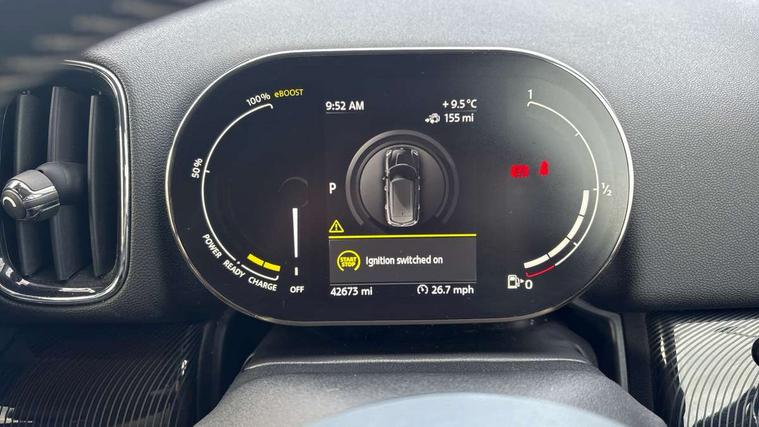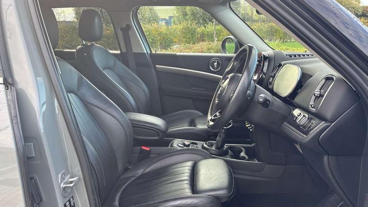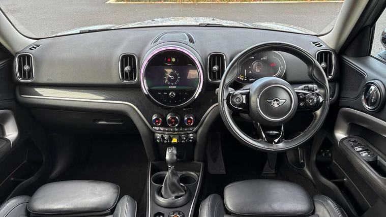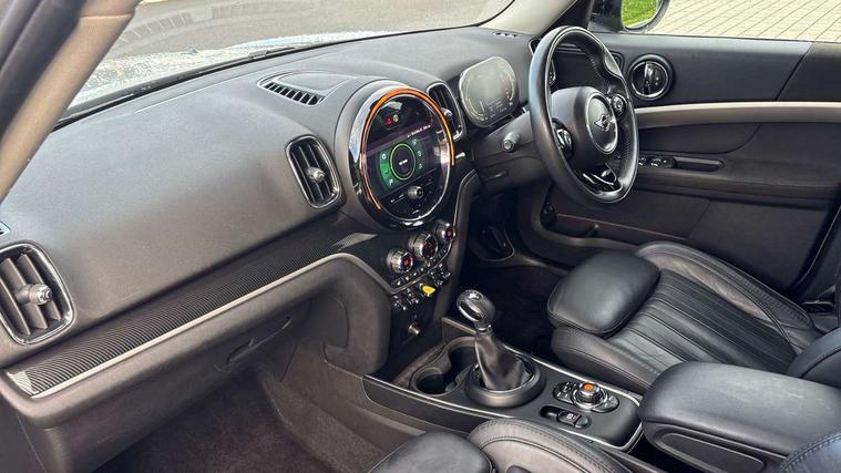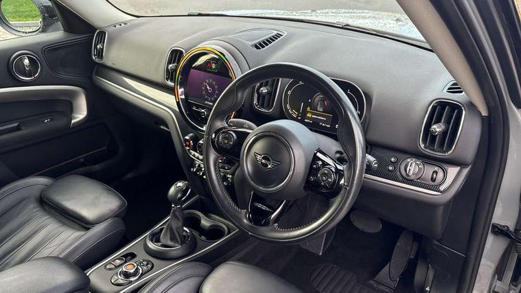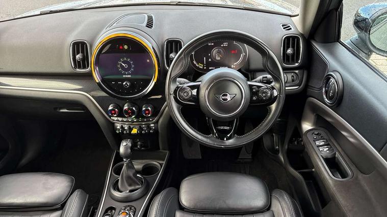 Active Guard incl speed limiting and lane departure functions with auto steering, and front collision warning with brake intervention, Automatic start/stop function with brake energy recuperation, Digital cockpit, eDrive button, Electro-mechanical speed dependant steering assistance, Instrument cluster, MINI Driving Modes - centre toggle switch to control driving setting (sport, mid and green), Mini E-call, MINI TeleServices, On board computer, Rear parking distance control, Automatic transmission, Charging flap on front left lower A-panel, Double Vanos system, Fully variable valve control, High precision injection, Home charging cable, Performance Control, Public charging cable, FM tuner and DAB digital radio, Bonnet scoop, Chrome border honeycomb structure radiator grille with S badge, Chrome fuel filler cap, Chrome line exterior, Day time driving lights, Dynamic brake lights, Electric windows, Heated rear window, Heated windscreen washer jets, LED fog lights, LED Headlights, Metal door sill strips with Cooper S imprint, Model logo, Model logo on Tailgate, Rain sensor with auto headlights, Rear fog lights, Rear window wiper, Side scuttle panel with integrated indicator, Split rear doors, Sun/heat protection glass, Twin exhaust tailpipe, White indicator lenses, 12V Accessory socket in centre console, 360L luggage compartment capacity, 4 lashing eyes in luggage compartment, 40:20:40 split folding rear seats, Chrome interior highlights, Colour line - Carbon black, Cupholders, English handbook, Front headrests, Glove compartment, Height and length steering column adjustment, Interior lighting with 12 basic colours selectable via toggle switch in roof, Isofix rear child seat preparation, Leather gearshift lever and handbrake gaiters, LED reading lights, vanity mirror lights, front foot well light and spotlight on front seats, Manual air conditioning, MINI Yours fine walk nappa leather steering wheel with contrast stitching in silver and MINI Yours badge, Multifunction steering wheel, Passenger seat height adjuster, Rear headrests, Storage compartments in doors, Sunvisors with vanity mirrors, Tool kit, Excitement pack - Countryman, Navigation pack - Countryman, 2 tone horn, 3 point seatbelts on all seats, 6 Airbags - front, side, head and seat belt tensioners, Acoustic pedestrian protection, Anti-lock braking system (ABS), DSC - Dynamic Stability Control, Electronic handbrake, Front and rear disc brakes, Hill start assist, Tyre pressure monitoring system, Alarm system with tilt sensor, monitoring doors, bonnet interior and tailgate, Auto drive away locking, Deadlocking function, Electronic vehicle immobiliser, Locking wheel bolts, Start/stop toggle with keyless go, Chrome line interior,