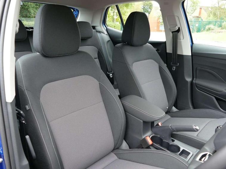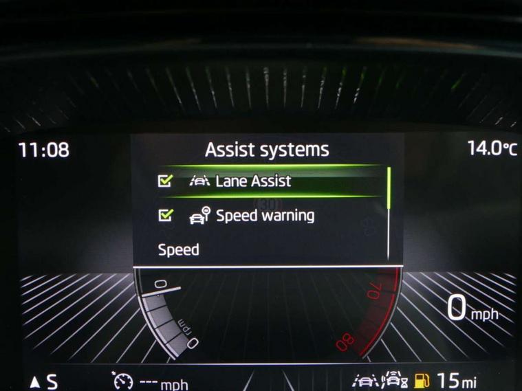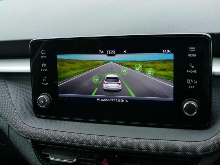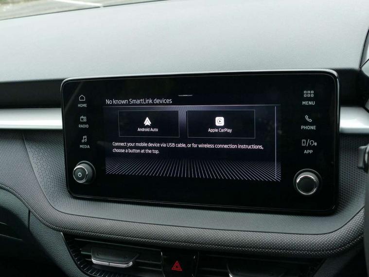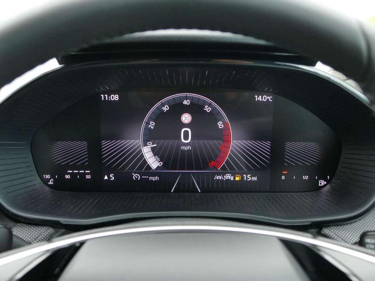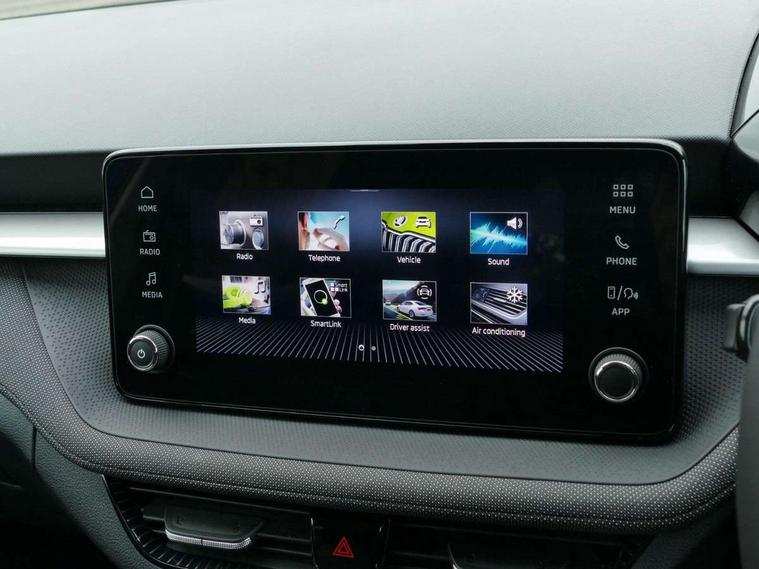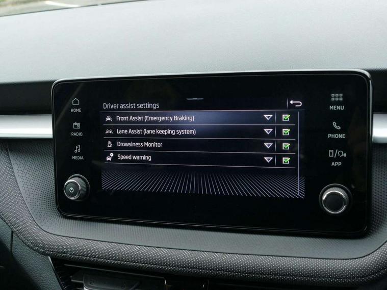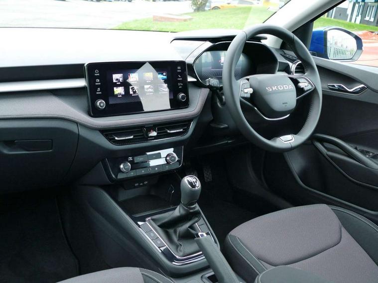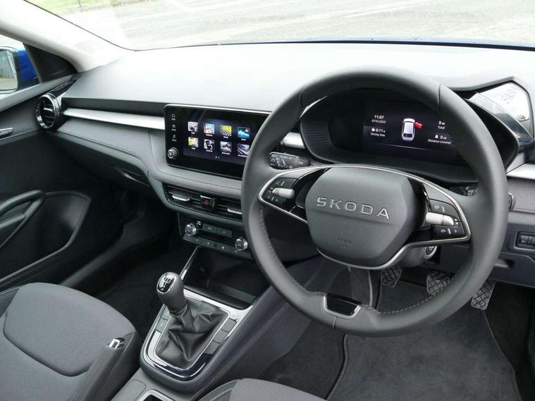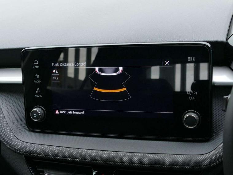 8" Digital instrument display, Advanced driver attention and drowsiness monitor, Bluetooth connection, Cruise control with speed limiter, Driver alert system, Electromechanical power steering, Exterior temperature gauge, Lane assist including road edge detection, Rear parking sensors, Service interval indicator, Traffic sign recognition, Wireless SmartLink for Apple CarPlay and Android Auto, 6 Speakers (4 in front and 2 in rear), 8.25" Skoda infotainment touchscreen display, Auxiliary socket for external MP3 player, DAB digital radio reception, Auto dimming rear view mirror, Body colour door mirrors, Body coloured bumpers, Door mirror integrated indicators, Front and rear electric windows, Front window wiper intermittent control, Headlight range control - Automatic, Ice scraper in fuel cap, LED 3rd brake light, LED daytime running lights with coming and leaving home feature, LED rear lights, Rear LED fog light, Rear side wing doors, Rear window wiper with washing nozzles, Roof mounted spoiler, SKODA tailgate lettering in chrome, Unique dark chrome design logo on alloy wheels, 2 reading lights in front and 2 reading lights in rear, 3 rear headrests, Backrest split and folding, Central console with removable cup holder and storage box, Chrome handbrake release button, Dual zone air conditioning with climatronic electronic control, Fabric upholstery, Front centre armrest, Gearshift knob/handle in leather, Grain satin black interior door handles, Hand brake lever handle in leather, Height adjustable front headrests, Height adjustable front seats, Height adjustable steering wheel, ISOFIX and TopTether anchorage points to the outer rear seats, ISOFIX and TopTether on the front passenger seat, Luggage compartment lighting, Manually adjustable lumbar support in front seats, Pollen filter, Rear seat bench unsplit, Single front passenger seat, Skoda lettering on steering wheel, Storm grey headlining, Sun visors with mirror and airbag label on passenger side, Textile floor mats, Ticket holder, Umbrella in drivers door, Ambient lighting pack - Fabia Hatchback, 3-point height adjustable front seats belts with pretensioner and force limiter, Automatic warning lights in case of crash, Driver and passengers airbag with switch off function, e-Call+, ESC including ABS, MSR, ASR, EDS, HBA and XDS, Front and rear seat belt warning, FRONT ASSIST (AEB City and AEB Inter Urban), Front side airbags, Head airbags, One tone horn, Pedestrian protection, Three rear 3-points safety seat belts with pretensioner and force limiter including stop function for outer rear seat belts, Tyre pressure monitoring system, Anti-theft alarm system including immobiliser, interior monitoring, backup horn, and towing protection, Central locking with radio remote control, interior controls, SAFE function and 2 foldable keys, KESSY - Keyless engine start/stop, Black painted air vents, Grain satin black central console cover, Metallic grey upper decorative trim, Satin black door and side trim panel in front, Textile Kota grey lower decorative inserts, Anti-theft wheel bolts protection, Super-low rolling resistance tyres,