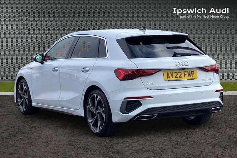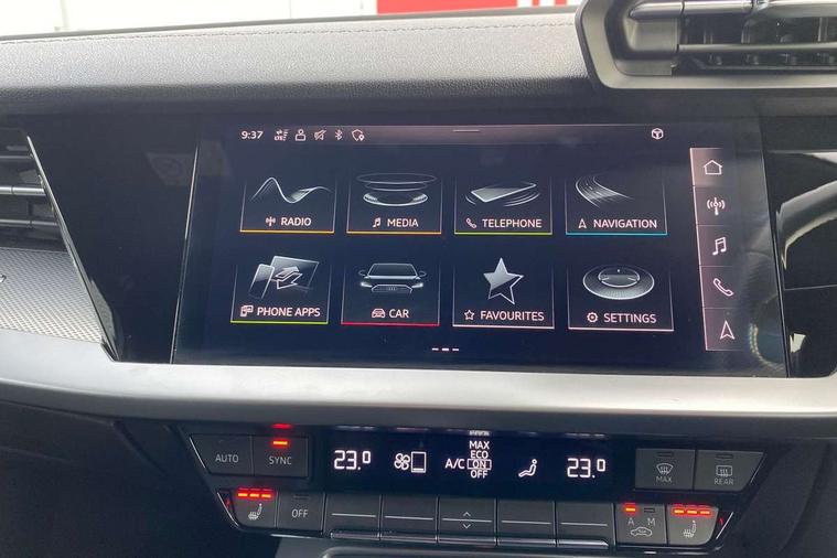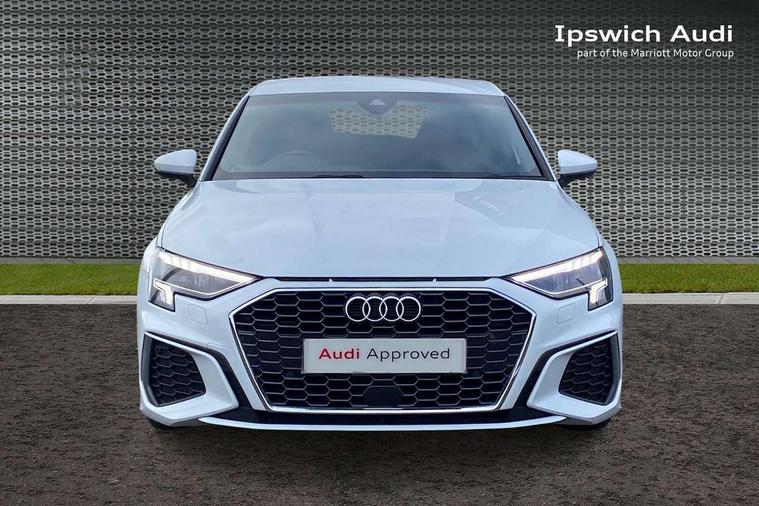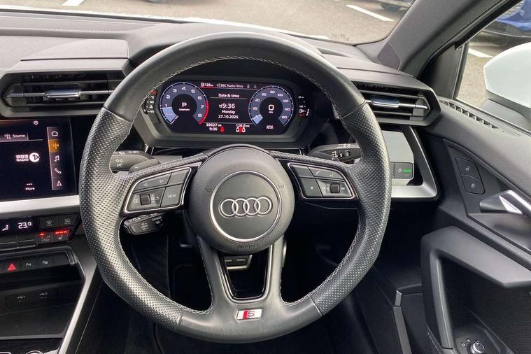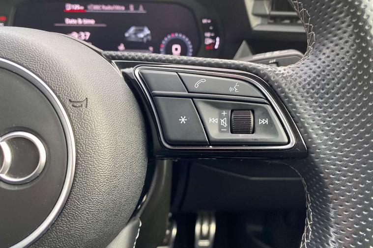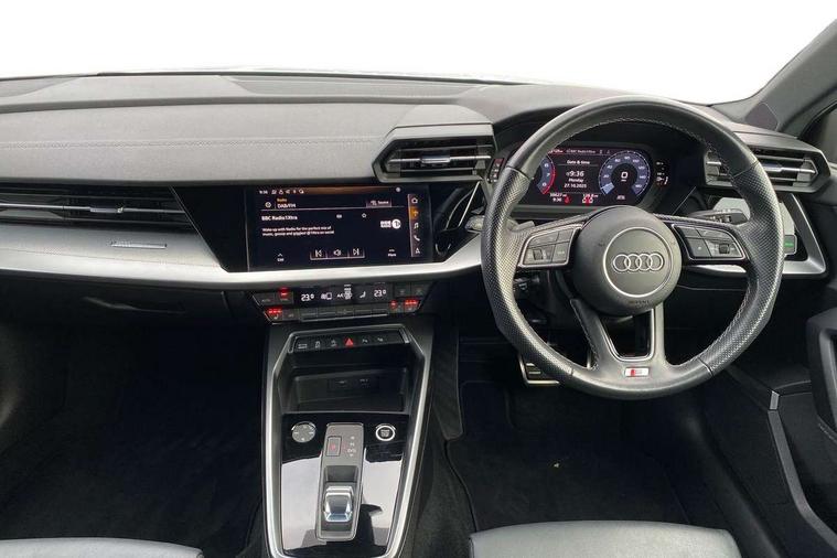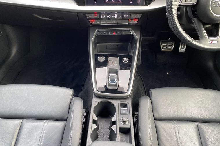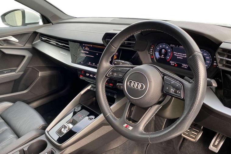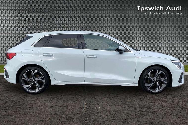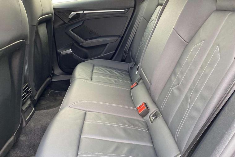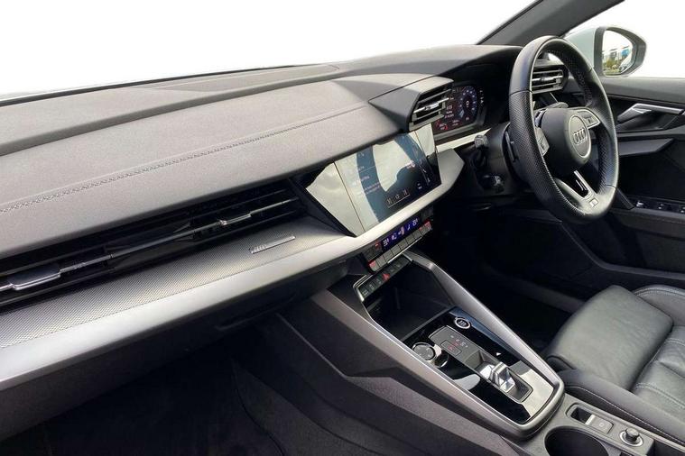 Audi connect emergency call and service, Audi drive select (Auto, Comfort, Dynamic, Efficiency and Individual), Audi smartphone interface, Audi Virtual Cockpit - 10.25" digital and colour instrument cluster, Automatic start/stop system with recuperation, Bluetooth interface, Collision avoidance assistant, Electromechanical power speed sensitive steering, Lane departure warning system, MMI Navigation Plus with high resolution 10.1" colour touch screen display, Service indicator, Trip computer, Voice control system with natural language interaction, 2xUSB-C connection with data and charging functions, 6 passive loudspeakers, DAB Digital radio, 3rd brake light, Acoustic glass windscreen, Aluminium window trim, Auto dimming frameless rear view mirror, Electrically adjustable/heated/folding/auto dimming door mirrors with integrated LED indications + kerb view function for passenger side, Front electric windows, Illuminated aluminium inserts front door sills with S logo, LED daytime running lights, LED headlights with LED rear lights and dynamic rear indicators, Light and rain sensors, Privacy glass - dark tinted rear window, rear door and side windows, Rear electric windows, Rear side air outlets in grained matt black, Rear side wing doors, Rear wiper, S line bumpers, S roof spoiler, 12V socket and storage compartment in front centre console, 3 seat bench in 2nd row, 40/20/40 split folding rear seat bench with cupholder, Black cloth headlining, Dual zone electronic climate control, Front and rear centre armrest in leather, Front and rear headrests, Front/rear floor mats, Height and reach adjustable steering wheel, Illuminated vanity mirror, Interior lighting - glove compartment light and right hand side, Luggage compartment floor covering, Manual boot compartment lid, Manually adjustable front seats, Seat side bolsters, Single front passenger seat, Stainless steel pedals and front footrest in black, Twin leather upholstery with front sports seats S embossed logo, Aluminium interior elements pack - A3 Sportback, S line styling pack - A3 Sportback, 3x3 point rear seat belts, Driver and front passenger airbag with passenger airbag deactivation, Electronic Stabilisation Control (ESC) including ABS, ASR and EDL, First aid kit with warning triangle and 2 safety vests, Front side airbags with head airbags and interaction airbag, Pre-sense front with pedestrian and cyclist detection, Seatbelt monitoring, Tyre pressure loss indicator, Anti theft alarm, Anti-theft wheel bolts, Immobiliser, Manual child locks, Remote control central locking, Accent surfaces in the dashboard and centre console in platinum grey silk effect paint finish, Dark spectrum aluminium inlays,