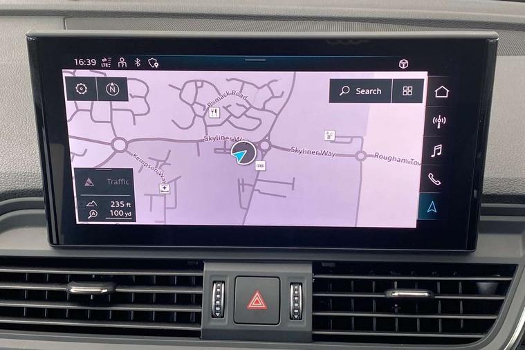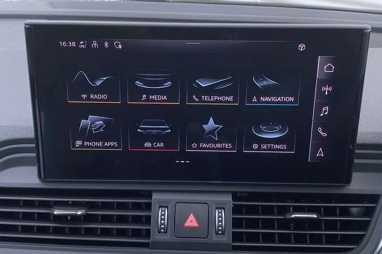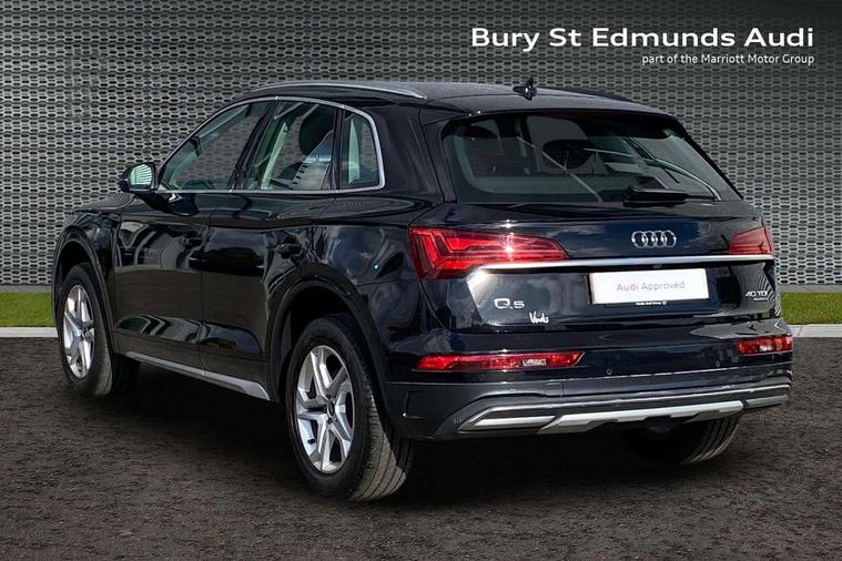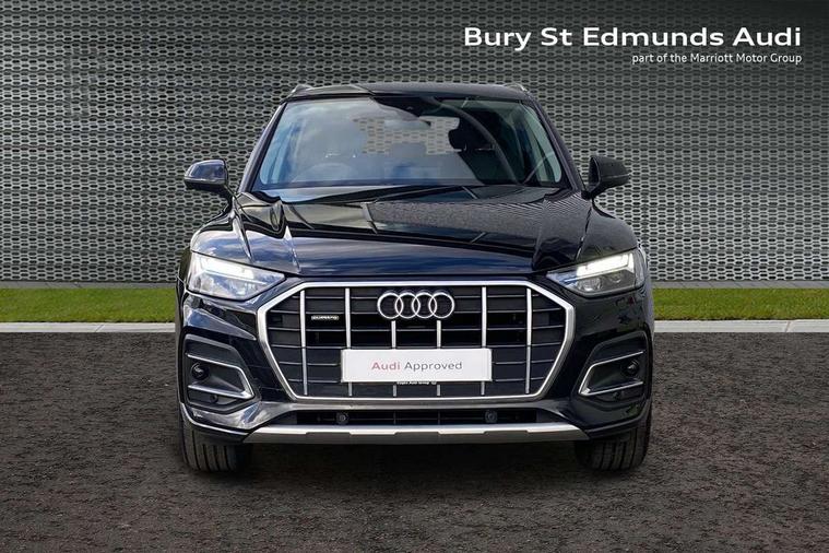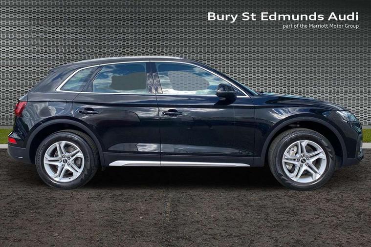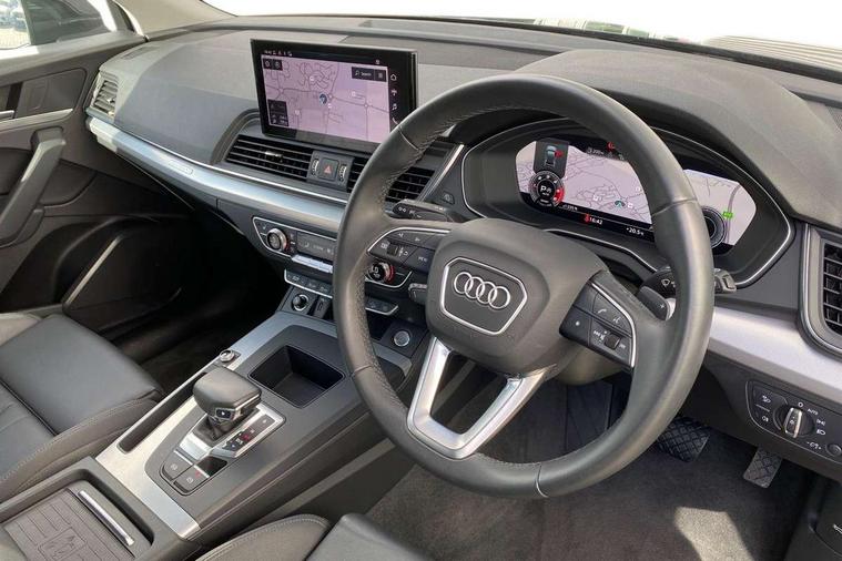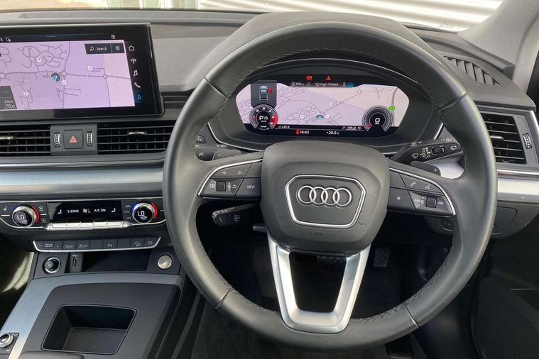 Audi connect safety and service (e-call), Audi connect with Amazon Alexa Integration, Audi drive select, Audi virtual cockpit plus with 12.3" screen and three different layout designs, Audi wireless smartphone interface, Automatic start-stop system with coasting functionality and efficiency programme, Bluetooth interface, Cruise control + speed limiter, Electro - mechanical power assisted steering, MMI navigation plus with 10.1" touch screen, Power tailgate, Reversing camera, Service interval indicator, Voice control system with Audi hotword activation "Hey Audi", Diesel particulate filter, Dynamic suspension, Quattro on demand, DAB Digital radio, Acoustic windscreen, Air inlets in matt titanium black with blades in matt aluminium silver, Aluminium roof rails, Auto dimming rear view mirror, Automatic headlights and windscreen wipers, Body colour bumpers, Body colour door mirrors, Chrome plated exhaust trims, Door sills in Selenite silver, Electric adjustable/heated/folding door mirrors, Front and rear electric windows, LED headlights and LED tail lights, Lower bumpers painted in contrast Manhattan grey, Matt selenite silver underbody protection, Matt twilight grey radiator grille with chrome vertical struts, Rear chrome trim strip below lights, Rear diffuser strip in selenite silver, Rear spoiler, Rear wiper, Roof bars, 2 x USB charging port with aux input socket, 3 rear headrests, 3 spoke multifunction leather steering wheel with shift paddles, 40:20:40 split folding rear seat with rear centre armrest, Comfort front centre armrest, Deluxe 3 zone electronic climate control, Door sills trims with aluminium inlays, Front/rear floor mats, Heated front seats, Height adjustable front head restraints, Height/reach adjustable steering column, ISOFIX child seat mounting and top tether, Luggage compartment cover, Manual seat adjustment with 4-way electric lumbar support, Removable luggage compartment floor, Silver cloth headlining, Sunvisors with vanity mirrors, Twin leather upholstery + front sports seats, High gloss pack - Q5, LED interior light pack - Q5, 3 point seatbelts on all seats, 6 airbags - Driver, front passenger, curtain and side airbags, Electrically operated child locks on rear doors, Electromechanical parking brake, Electronic stabilisation control including ABS, ASR and EDL, Front passenger airbag deactivation, Hill descent control, Hill hold assist, Multi collision brake assist, Pop-up bonnet for pedestrian protection, Pre sense city, Seat belt force limiter, Seatbelt monitoring, Tyre pressure warning, Warning triangle and first aid kit, Anti theft alarm, Anti-theft wheel bolts, Keyless Go access/ignition system, Aluminium rhombus inlay,