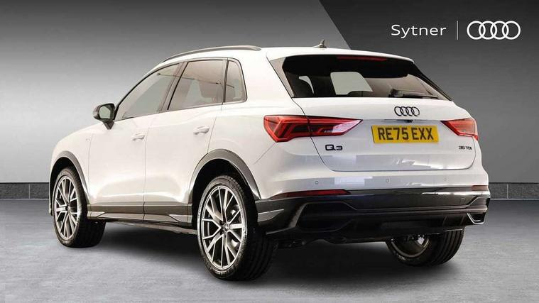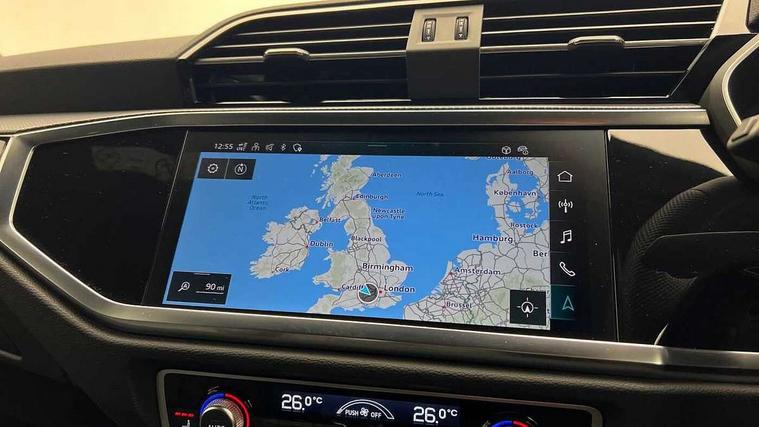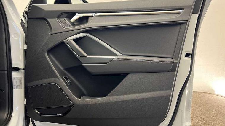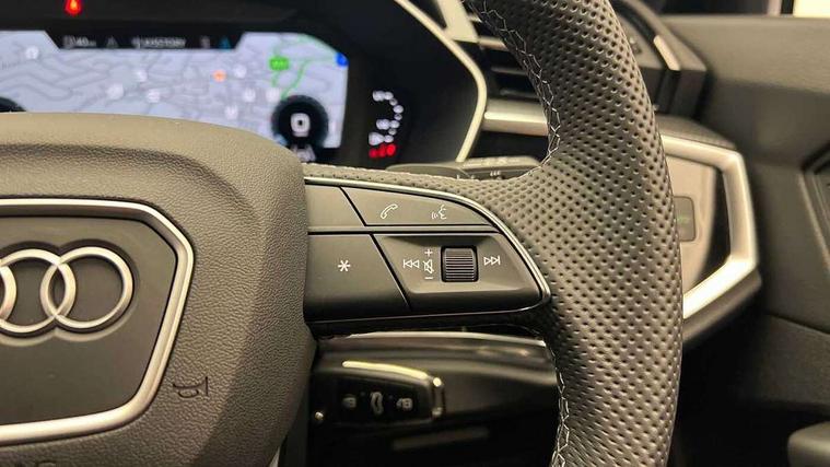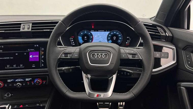 Amazon alexa Integration, Audi connect safety and service, Audi drive select, Audi lane departure warning, Audi Virtual Cockpit - 10.25" display, Bluetooth interface, Camera based traffic sign recognition, Distraction and Fatigue warning, Legal emergency call, MMI Navigation Plus with high resolution 10.1 inch touchscreen colour display, Power operated tailgate, Progressive steering, Service interval indicator, Smartphone interface includes wireless Apple carplay/Android Auto, Start stop system with recuperation, Voice control system with natural language interaction, Diesel particulate filter, Sports suspension, 2 USB-C ports with charge and data functions, 6 passive loudspeakers, DAB digital radio module, Acoustic windscreen, Anthracite black radiator grille, Audi Beam uses LEDs to project the Audi logo onto the ground as you exit your Q3, Auto dimming door mirrors, Auto dimming frameless rear view mirror, Black roof rails, Electrically folding, adjustable and heated door mirrors with integrated LED side indicators and kerb view function for passenger side, Front and rear electric windows, Front fog lights, Grille vertical bars in aluminium silver/Matt, High gloss black finish B and C pillars, LED Dynamic rear indicators, LED headlights with LED daytime running lights, LED rear lights, LED third brake light, Privacy glass dark tinted rear and rear-side windows (from B-pillar backwards), Rain and light sensors, Rear diffuser grille in grained matt black, Rear diffuser strip in matt anthracite black, Rear side wing doors, Rear wiper, S line bumpers in contrasting Manhattan grey, Variable front intermittent wipers, 12V socket in rear centre console, 3 seat bench in 2nd row, 40:20:40 folding with manual adjustment for 60:40 forwards/backwards position and backrest angle, Adjustable rear seat bench/backrest with centre armrest and cupholder, Black carpet mats, Black cloth headlining, Dual zone electronic climate control, Electric lumbar support, Front and rear black floor mats with contrast stitching in rock grey, Front and rear headrests, Front centre armrest, Height and reach adjustable steering wheel, Illuminated door sill trims with S logo, ISOFIX child seat mounting for front passenger with airbag deactivation and outer rear seat including top tether attachment point for outer rear seats, Luggage compartment sill protection in stainless steel, Manual front seats with height adjustment, Perforated leather gearknob, Single front passenger seat, Stainless steel pedals, Twin leather upholstery with front sport seats + S embossing, Black styling pack - Q3, Non smoking pack - Q3, 3x3 point rear seatbelts, 6 airbags - Driver, front passenger, curtain and side windows, Audi pre-sense front with pedestrain and cyclist recognition, Electrically operated child locks on rear doors, Electromechanical parking brake, Electronic stabilisation control including ABS, ASR and EDL, Front seatbelt reminder, Hill descent control, Hill hold assist, Pre sense basic, Seatbelt monitoring, Tyre pressure warning, Warning triangle and first aid kit, Anti theft wheel bolts, Immobiliser, Remote central locking, Thatcham approved category 1 anti theft alarm, Aluminium look interior elements, Detail dashboard around MMI touch colour display in glass look, black with surround in aluminium look, Leatherette door armrest, Piano black inlay,