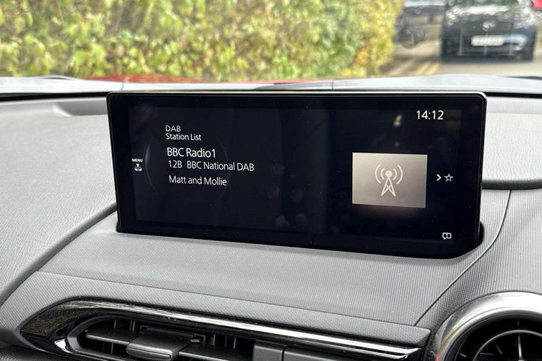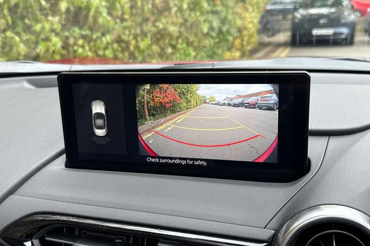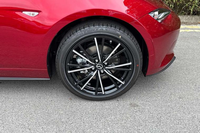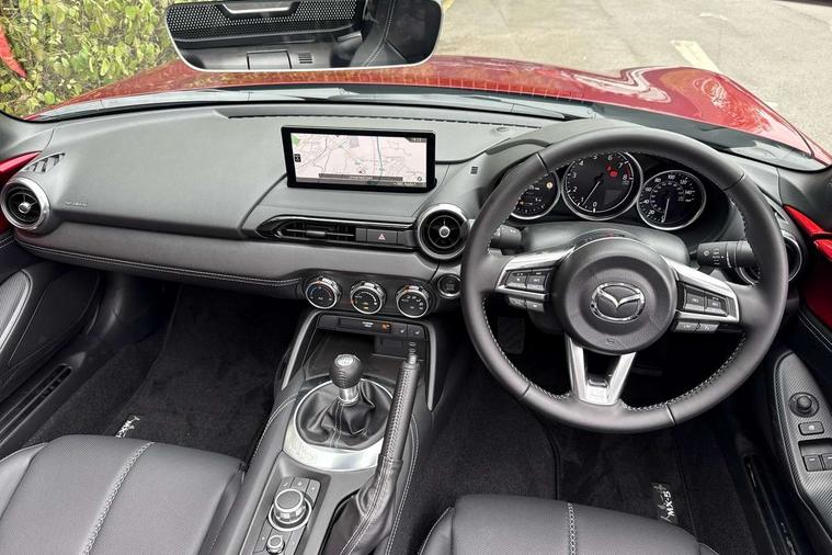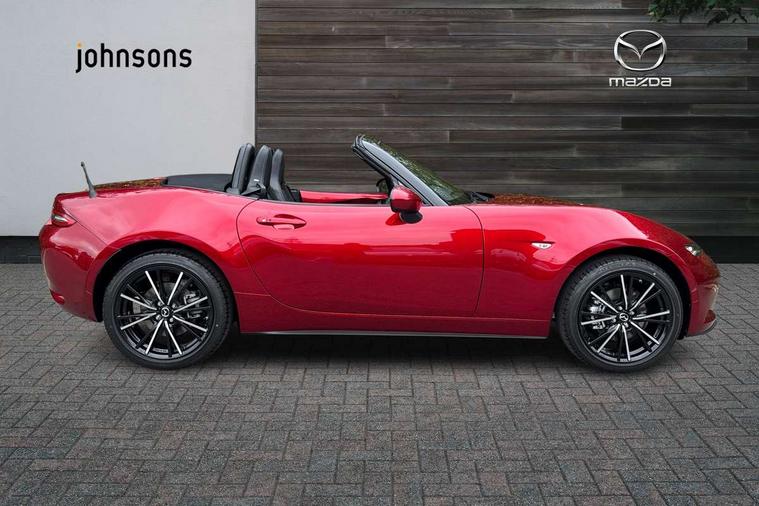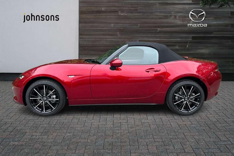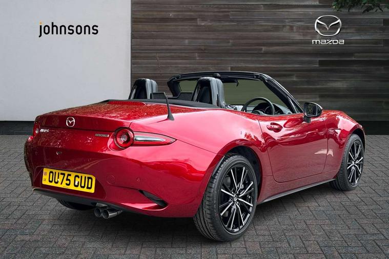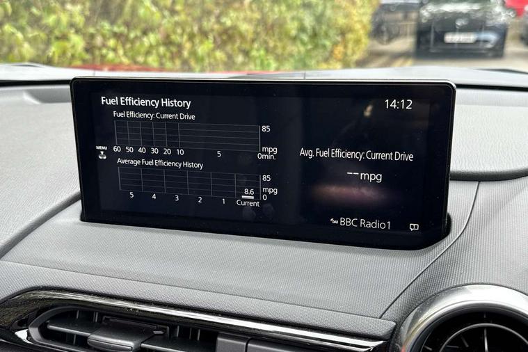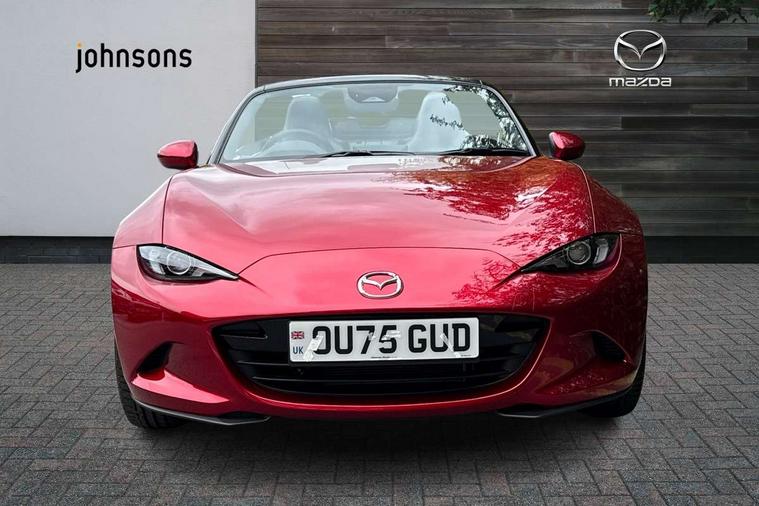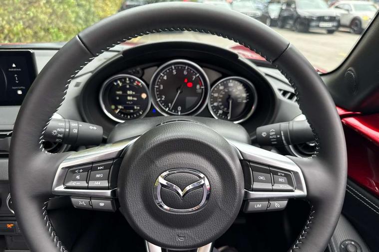 8.8" Colour centre touch screen display with Mazda Connect infotainment, Aha and stitcher app, Analogue speedometer, Apple car play/Android Auto, Blind spot monitoring with rear cross traffic alert, Cruise control with Intelligent speed assist, Driver alert system, eCall emergency call system, Emergency stop signalling system, Engine start/stop button, Hands free phone preparation, Integrated bluetooth with hands-free calling, bluetooth audio and easy access to phone contacts, Integrated navigation system, Kinematic posture control, Lane departure warning system, Lane keep assist, Multi dot display tachometer and electric odometer, PAS, Rear parking sensor, Reversing camera, Service indicator, Traffic sign recognition, Trip computer, Water temperature gauge, Asymmetric limited slip differential, I-ELOOP, i-stop, Sports suspension featuring Bilstein dampers, 2 x USB Type-C inputs, Multimedia Commander including separate volume dial, Premium Bose sound system with 9 speakers with 2 in each front headrest, AM/FM/DAB radio and MP3, Steering wheel mounted audio/bluetooth controls, Adaptive LED Headlights, Automatic headlamp levelling, Black scuff plates with stainless steel insert, Body colour bumpers, Body colour co ordinated interior upper door trim, Body coloured electric/heated door mirrors, Coming/leaving home lighting function, Dual exhaust pipes, Dusk sensitive headlamps, Electric front windows/one touch facility, Exterior body colour co ordinated upper door panel trim with black vinyl and silver stitching, Frameless auto dimming rear view mirror, Front intermittent wipers, LED 3rd brake light, LED daytime running lights, LED indicator lights, LED rear lights, Manually operated black premium cloth soft top with heated rear glass window, Piano Black fashion bars, Rain sensing front wipers, Rear boot, 12V socket, Centre console storage box, Chrome Air conditioning dials, Climate control air conditioning, Coin Box, Driver and front passenger sunvisors with covered vanity mirror and driver ticket holder, Driver seat manual slide, recline and tilt adjustment, Front centre armrest, Front head restraints, Gear shift indicator, Heated front seats, in 3 heat levels, Interior courtesy light, ISOFIX front passenger seat child seat compliance, Leather gear knob, Leather handbrake lever, Leather steering wheel, Lockable rear centre box with lid, Passenger seat + manual slide/recline adjust, Perforated leather upholstery, Single front passenger seat, Strut brace, Tilt/telescopic steering column, Two cupholders, Windblocker, 3 point ELR front seatbelts with pretensioners, ABS+Electronic Brake force Distribution, Deployable Hood System (DHS), Driver and passenger seatbelt reminder audible warning, Dynamic stability control with track mode, Exit warning, Front dual stage driver and single stage front passenger airbags, Front smart city brake support with autonomous emergency braking (SCBS), Hill hold assist, Passenger airbag deactivate switch, Side airbags, Smart city brake support - Rear (SCBS-R), Traction control, Tyre pressure monitor, Remote central locking with deadlocking and remote boot release, Smart keyless entry, Superlocking, Thatcham category 1 alarm + immobiliser, Centre Console - Vinyl leather, Chrome air vent surrounds, Dashboard panel - Black Vinyl, 17" Black machined alloy wheels, Tyre puncture repair kit,