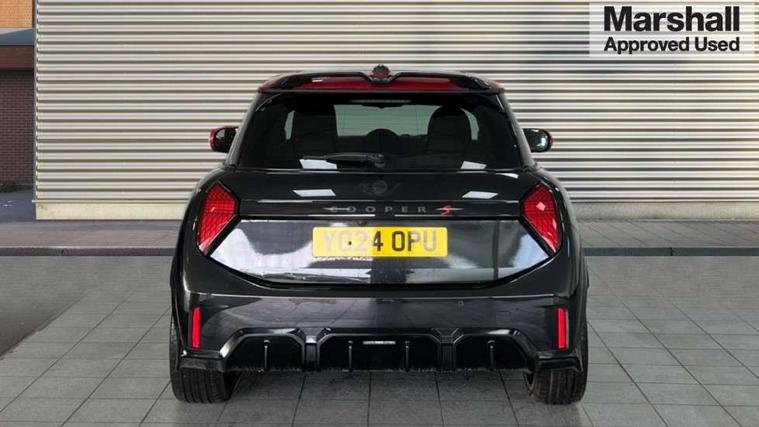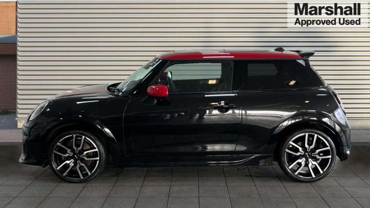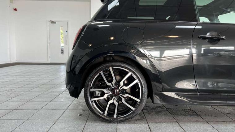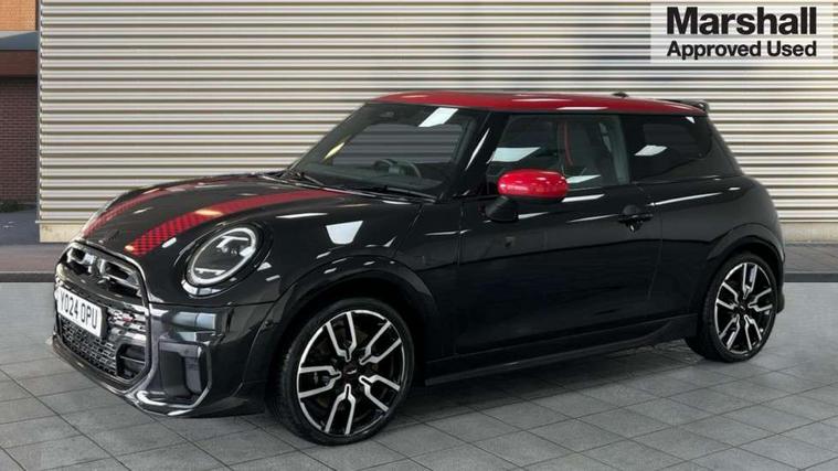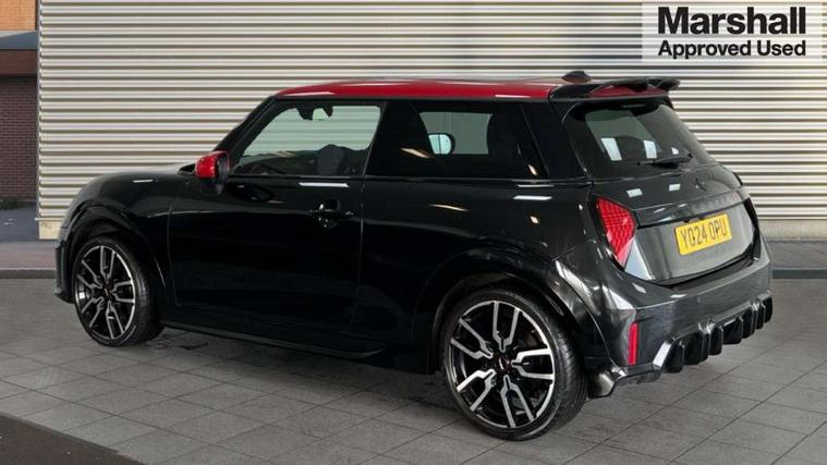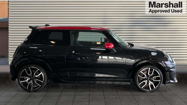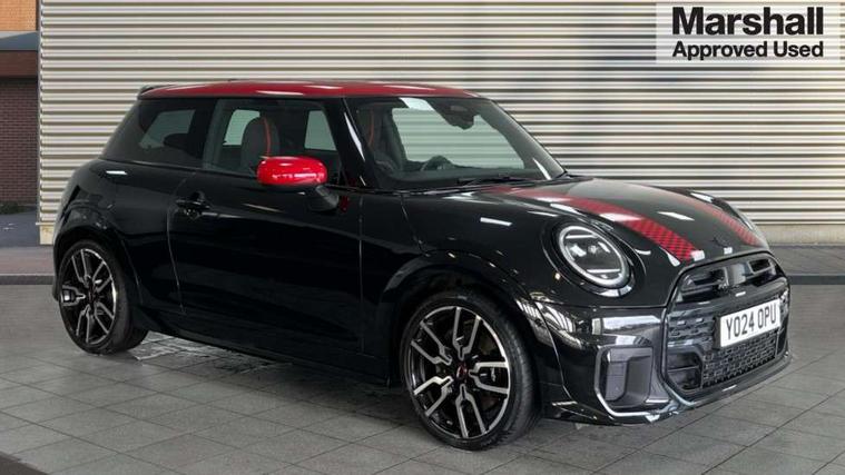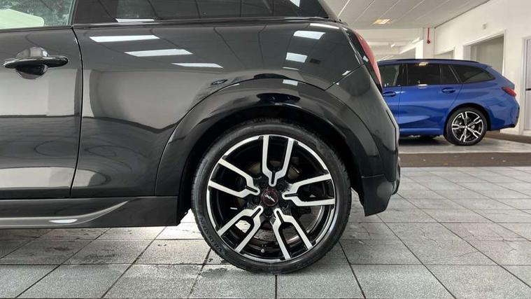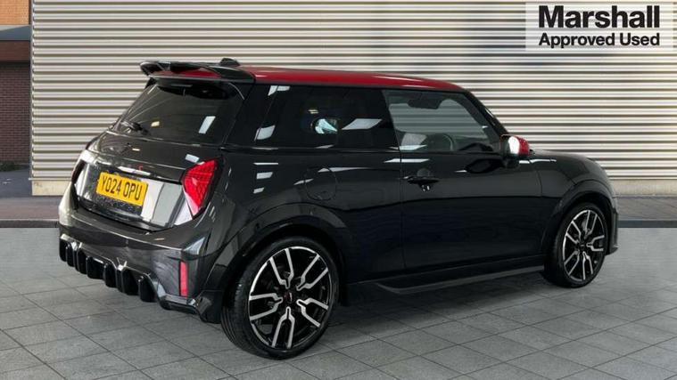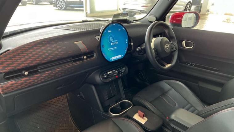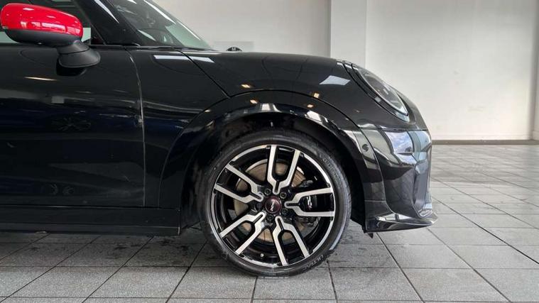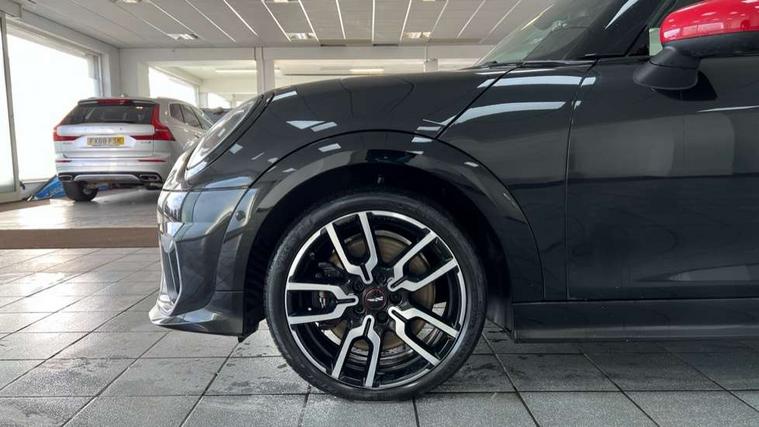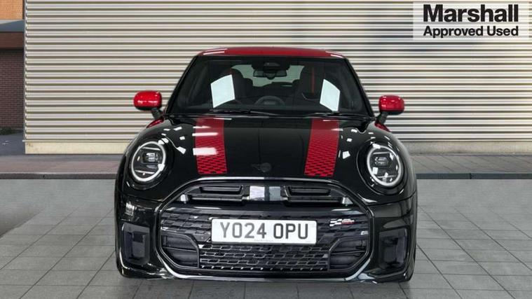 Central toggle bar, Circular OLED Screen, Compatible mobile phone bluetooth with audio streaming, Cruise control, Digital instrument cluster, Electro-mechanical speed dependant steering assistance, Emergency call service, MINI Experience Modes, Mini navigation system, On board computer, Service interval indicator, 7 speed steptronic sport transmission with double clutch, Adaptive suspension, DAB Digital radio, Personal eSim, Auto headlights, Electric adjustable heated door mirrors, Electric front windows, Front and rear apron, Heated rear window, Heated windscreen washer jets, High gloss black wheel arches, High gloss hexagonal patterned grille surround, JCW body kit, LED daytime running lights, LED indicator lights, LED rear lights, Rain sensor window wipers, Rear fog lights, Rear roof spoiler with airblades, Rear window wiper, 2 seat bench in second row, 2 zone automatic air conditioning, 60/40 rear seat bench, Ambient lighting, Cupholders, Dark headliner, Floor mats, Front and rear head restraints, Front compact armrest, Heated steering wheel, Height adjustable passenger seat, Lidded storage box in Black/Red knit, Luggage compartment lighting, Perforated Vescin steering wheel, Single front passenger seat, Steering wheel paddle shift, Sunvisors with vanity mirrors, Vescin/Cord upholstery, Driving assistant pack - Cooper Hatchback, Level 1 pack - Mini Hatchback, Park assistant pack - Cooper Hatchback, 3 point seatbelts on all four seats, 6 Airbags - front, side, head and seat belt tensioners, Acoustic pedestrian protection, Anti-lock braking system (ABS), Brake caliper in Black with JCW badge, DSC - Dynamic Stability Control, Electronic parking brake, Front and rear disc brakes, Front ISOFIX (iSize), Front passenger airbag deactivation, JCW Sport Brakes, Traction control, Tyre pressure monitoring system, Alarm, Immobiliser, Remote central locking, Black/Red decorative dash strap, JCW Black/Red dashboard knit, 18" JCW Lap spoke 2-tone alloy wheels, Tyre repair kit,