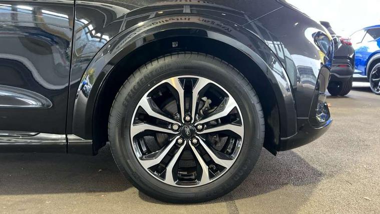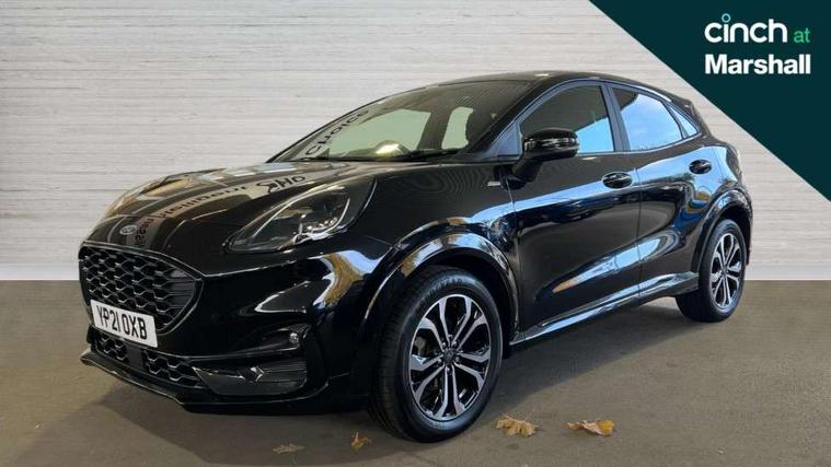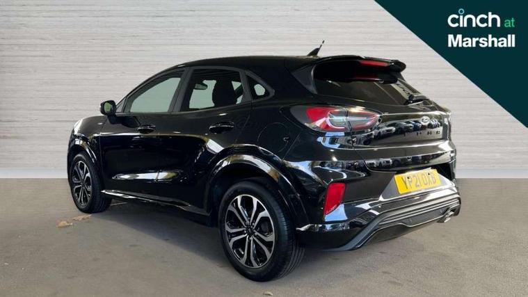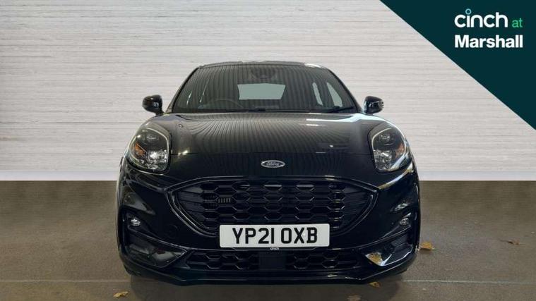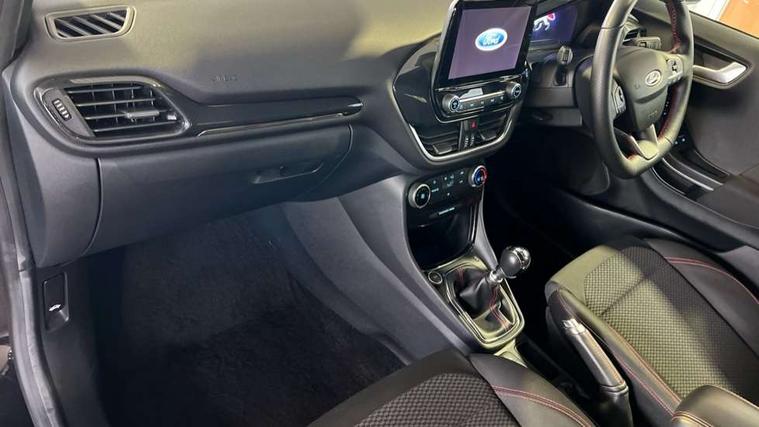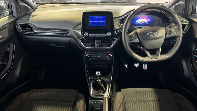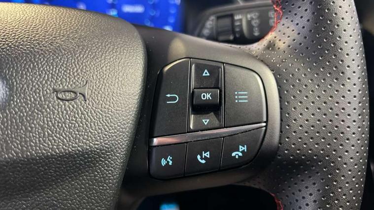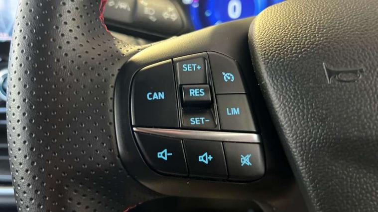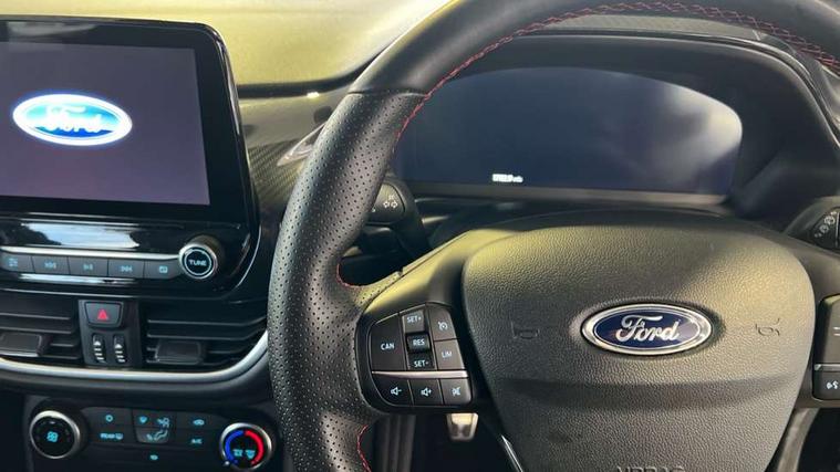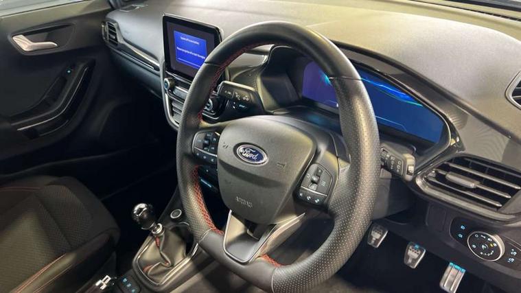 Ford easy fuel, Full digital 12.3" instrument cluster, Lane keeping aid with lane departure warning, Power assist steering, Power start button, Rear parking sensor, Selectable drive modes(Normal, sport, Eco, trail, slippery), Automatic headlights with rain sensing wipers and auto high beam, Body coloured door mirrors, Front fog lights with cornering lights and LED rear lamps, Power foldable heated door mirrors with puddle lamps, Projector headlamps with LED day time running lights, Quickclear heated windscreen, Rear wiper, ST-Line body kit with large rear spoiler wth sports suspension, Centre console with armrest and stowage, Cloth upholstery, Driver seat height/lumbar adjust, Ford megabox extended bootspace, Front and rear floor mats, Front and rear head restraints, Manual air conditioning, ST-Line flat bottomed sensico leather steering wheel with leather handbrake and aluminium gear knob, Ford SYNC 3 navigation pack - Puma, 3 rear seatbelts, Electronic stability control (ESC) and hill start assist, Pre-collision assist with autonomous emergency braking, pedestrian/cyclist detection & post-collision braking, Tyre pressure monitoring system (TPMS), Thatcham alarm,