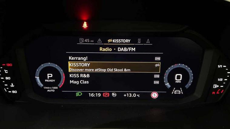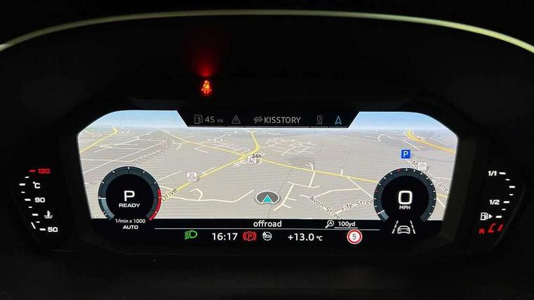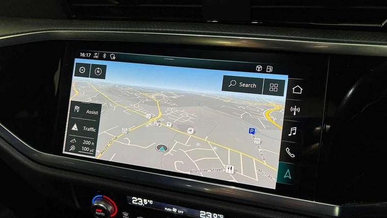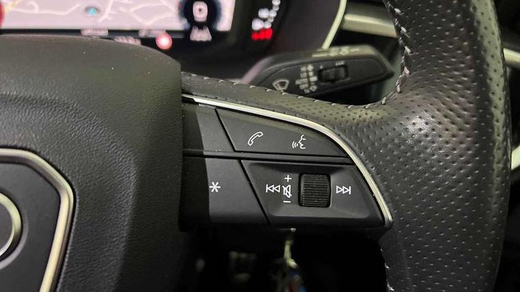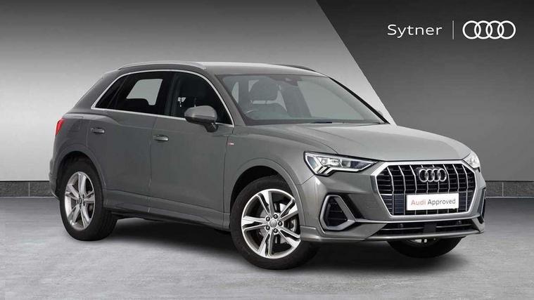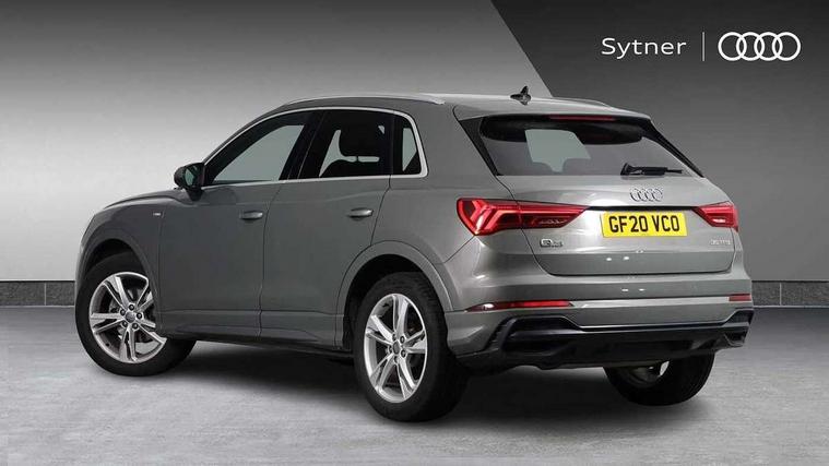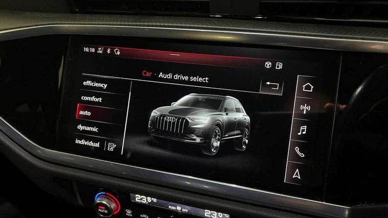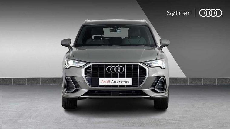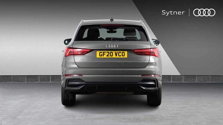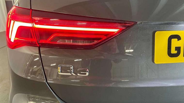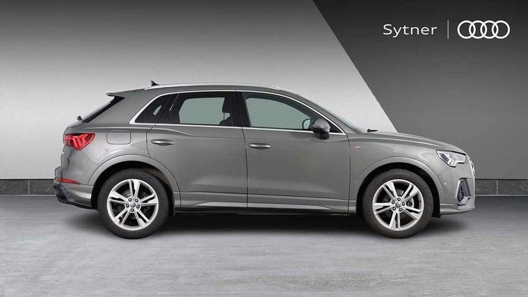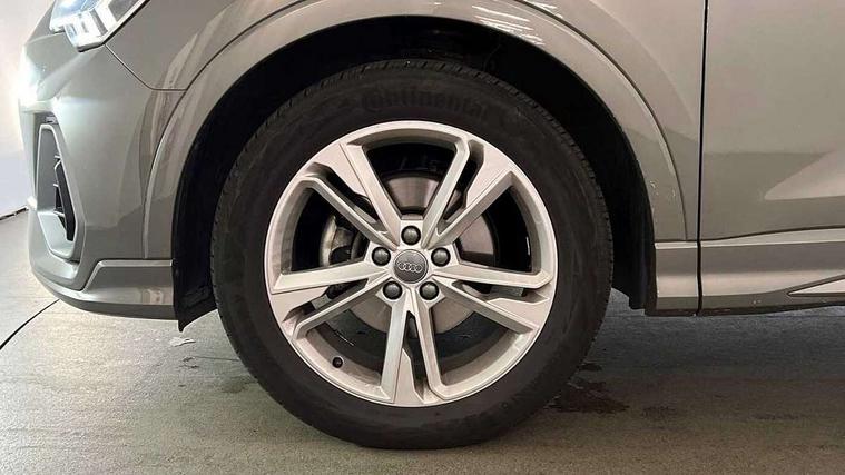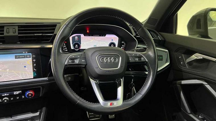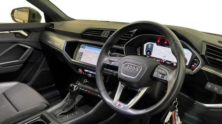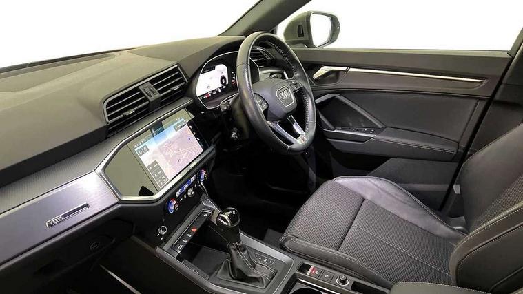 Audi connect safety and service (e-call), Audi drive select, Audi lane departure warning, Audi side assist, Audi Virtual Cockpit - 10.25" display, Bluetooth interface, Camera based traffic sign recognition, MMI Navigation Plus with high resolution 10.1 inch touchscreen colour display, Power operated tailgate, Progressive steering, Service interval indicator, Smartphone interface includes wireless Apple carplay/Android Auto, Start stop system with recuperation, Voice control system with natural language interaction, 48V Mild hybrid technology, Sports suspension, 1 x USB type C and 1 USB type A charging points, 6 passive loudspeakers, DAB digital radio module, Acoustic windscreen, Aluminium roof rails, Aluminium window trim, Auto dimming frameless rear view mirror, Body coloured bumpers, Electrically folding, adjustable and heated door mirrors with integrated LED side indicators and kerb view function for passenger side, Front and rear electric windows, Front fog lights, Front side air inlets in matt platinum grey, Front spoiler blade in matt platinum grey, Grille vertical bars in aluminium silver/Matt, High gloss black finish B and C pillars, LED headlights with LED daytime running lights and dynamic rear indicator, LED rear lights, Privacy glass dark tinted rear and rear-side windows (from B-pillar backwards), Rain and light sensors, Rear diffuser strip in matt titanium black, S line badges on front wings, S Line front and rear bumpers, Side skirt insert in matt Platinium grey, Silver chrome grille surround, Titanium black radiator grille, 12V socket in rear centre console, 40:20:40 folding with manual adjustment for 60:40 forwards/backwards position and backrest angle, Adjustable rear seat bench/backrest with centre armrest and cupholder, Black cloth headlining, Dual zone electronic climate control, Front and rear black floor mats with contrast stitching in rock grey, Front and rear headrests, Front and rear roof module including reading lights, Front centre armrest, Glove compartment lighting, Height and reach adjustable steering wheel, Illuminated door sill trims with S logo, ISOFIX child seat mounting for front passenger with airbag deactivation and outer rear seat including top tether attachment point for outer rear seats, Luggage compartment light, Manual front seats with height adjustment, Perforated leather gearknob, Stainless steel luggage compartment sill finisher, Stainless steel pedals, Non smoking pack - Q3, 3x3 point rear seatbelts, 6 airbags - Driver, front passenger, curtain and side windows, Audi pre-sense front with pedestrain and cyclist recognition, Electrically operated child locks on rear doors, Electromechanical parking brake, Electronic stabilisation control including ABS, ASR and EDL, Hill descent control, Hill hold assist, Pre sense basic, Seatbelt monitoring, Tyre pressure warning, Warning triangle and first aid kit, Anti theft alarm, Anti theft wheel bolts, Remote central locking, Dark matt brushed aluminium inlay, Detail dashboard around MMI touch colour display in glass look, black with surround in aluminium look, Leatherette door armrest, Tool kit, Tyre repair kit,