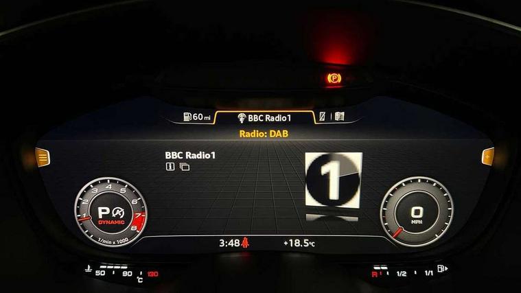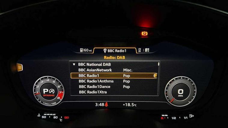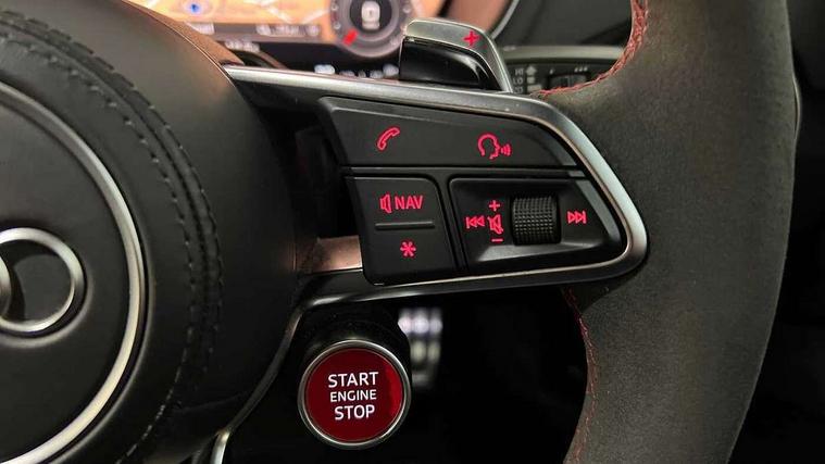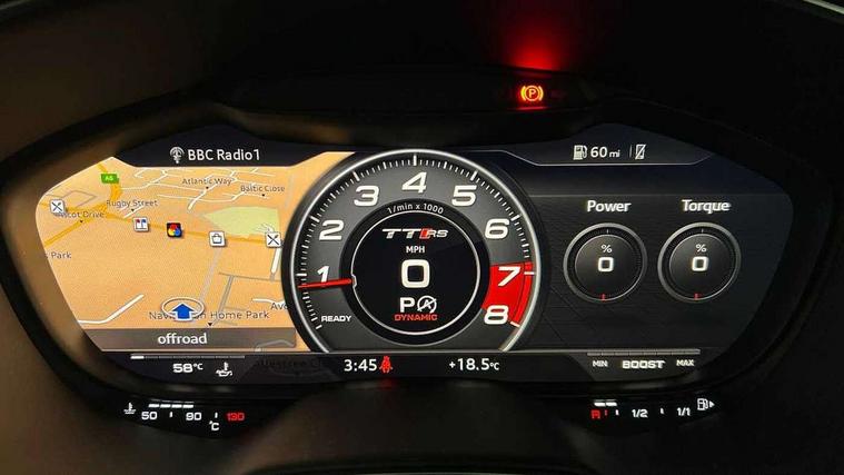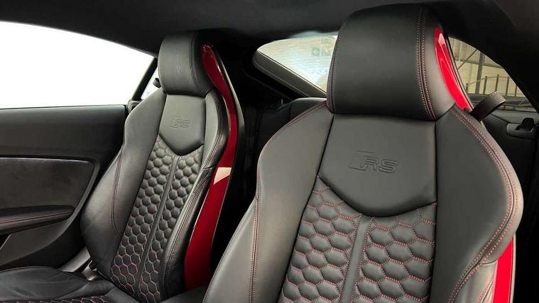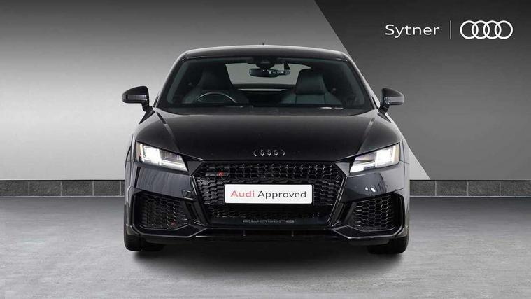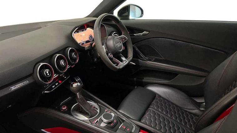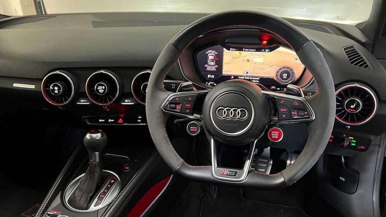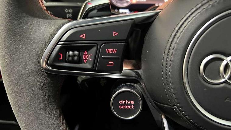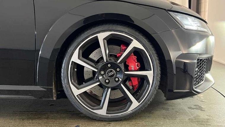 Audi drive select, Audi parking system plus with front and rear sensors, Audi smartphone interface, Audi Virtual Cockpit with sport gauge, Cruise control + speed limiter, MMI touch panel, Mobile phone preparation with bluetooth interface, Progressive power assisted steering, Service interval indicator, Start/stop system, TT RS specification sports suspension, Audi sound system, Auxiliary input socket, Bluetooth audio streaming, DAB Digital radio, MMI Radio with CD player and SD/XC card slot, All weather LED headlights, Auto dimming rear view mirror, Auto headlight range control, Black door mirrors, Electric front windows, Electrically adjustable, foldable and heated auto dimming on driver side and automatic kerb view dipping function on the passenger side, Front spoiler, Green tinted heat insulating glass, High beam assist, LED daytime running lights, LED rear lights, Light and rain sensors, Privacy glass, RS sport exhaust system, Sunband for windscreen, TTRS fixed rear wing, Twin oval tailpipes, 3 spoke alcantara sports leather multifunction plus steering wheel, Alcantara gear knob gaiter, Aluminium door sill trims, Black headlining, Deluxe auto air conditioning with integrated digital display, Front centre armrest, Front head restraints, Front passenger seat isofix location point, Heated front seats, Height/reach adjust steering wheel, Interior elements in slate grey, ISOFIX child seat mounting for front passenger seat with airbag deactivation, Rear head restraints, Rear top tether child seat ISOFIX attachment, Split folding rear seat, Stainless steel pedals and footrest, TTRS badge on the steering wheel, TTRS exhaust sound button in centre console, Black styling pack - TT RS Sport, Extended leather package - TT RS, LED interior light pack - TT/TT RS, Non smoking pack - TT/TT RS, Technology pack - TT with MMI Navigation, 3 point front seat belts, ABS, ASR traction control, Curtain airbags, Driver and front passenger airbag with front passenger airbag deactivation, EBD - Electronic brakeforce distribution, EDL traction control, Electromechanical parking brake, ESP, First aid kit, Front side airbags, Head airbags, Hill hold assist, RS brake system, Seatbelt warning, Warning triangle, Anti theft alarm, Anti theft wheel bolts, Immobiliser, Keyless Go, Remote central locking, Carbon inlays, 20" 7-spoke rotor design alloy wheels in gloss anthracite black, diamond cut finish, Tool kit, Tyre repair kit,