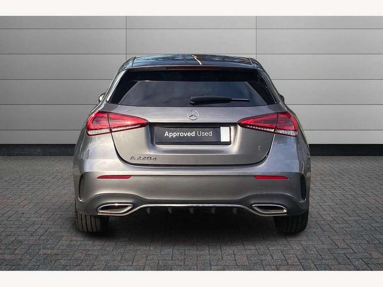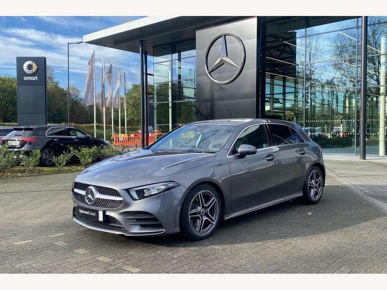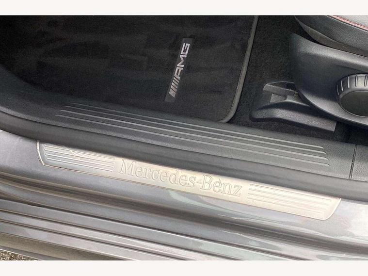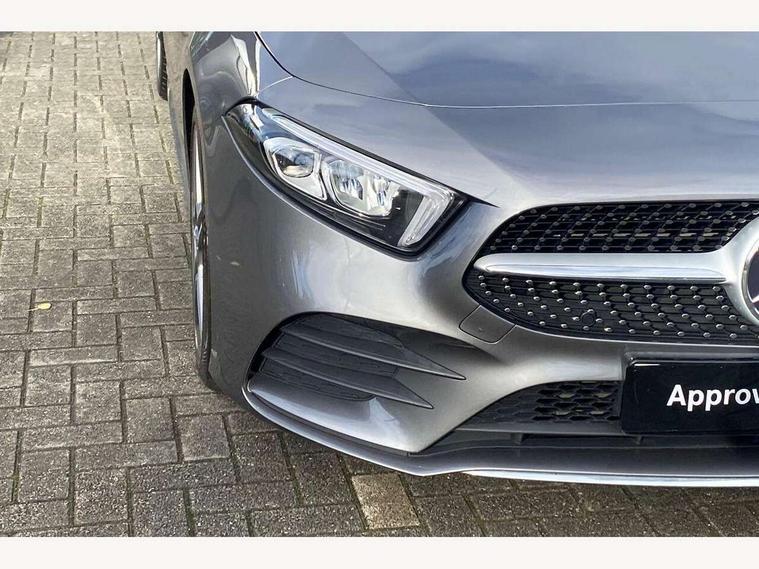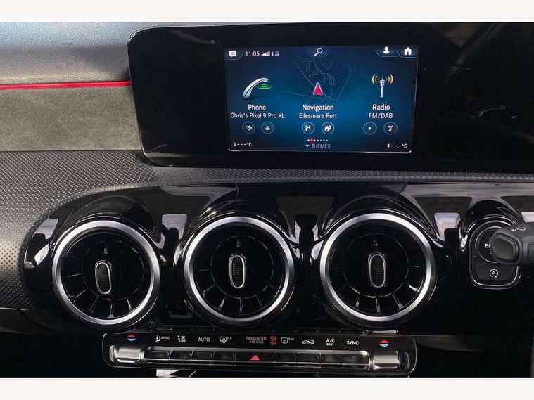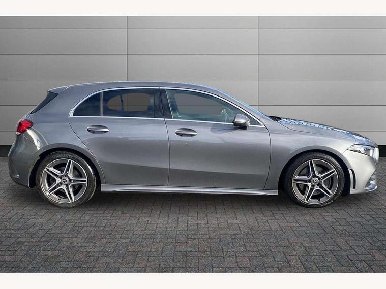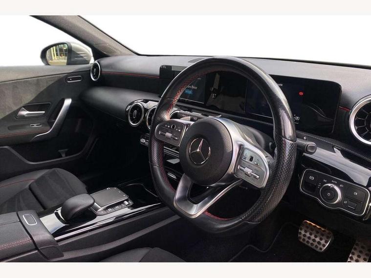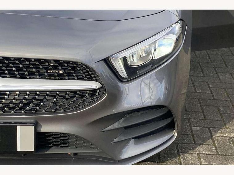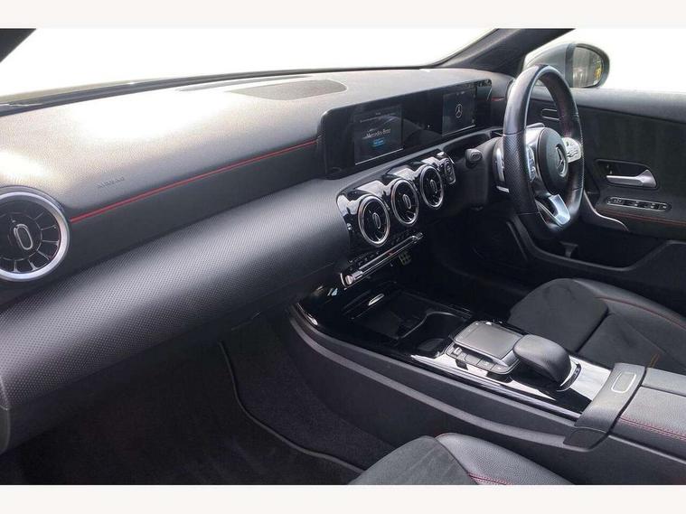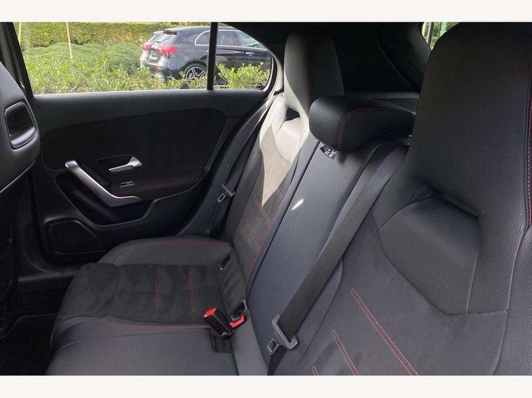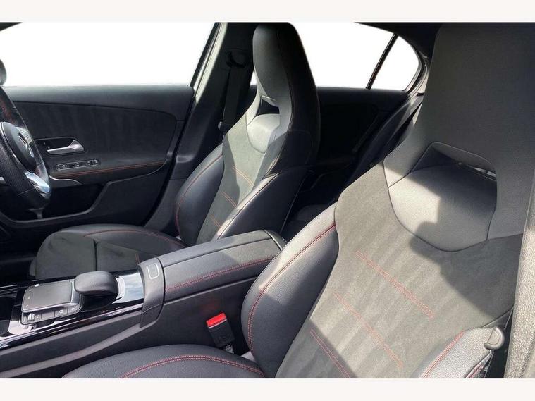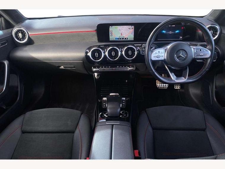 180 degree rear view camera with parking guidelines, 7" colour screen in instrument panel, 7" touchscreen media display, Attention assist, Brake pad wear indicator warning light, Car wash mode, Cruise control + speed limiter, Direct steering, Dual bluetooth interfaces, DYNAMIC SELECT with a choice of driving modes (ECO, Comfort, Sport and Individual), ECO start/stop function, Fluid level warning indicator for fuel, oil, coolant and washer fluid, Hard-disk navigation, Hey Mercedes Voice activation, Lamp failure indicator, Mercedes me connect including emergency call system, accident recovery, breakdown and maintenance management, Mercedes me remote services, Outside temperature gauge, Owners manual in English, Pre-installation for private car sharing, Preinstallation for Mercedes Benz link, Service indicator (ASSYST), Speed sensitive power steering, Trip computer, Lowered comfort suspension, Rear axle multi-link, 2 USB ports (type C) in rear stowage compartment and one in front of center console, 6 speakers, DAB Digital radio, MBUX multimedia system with DAB digital radio and touchpad including satellite navigation, Mercedes-Benz sound system - 100W, 4 Electric Front and Rear windows, Adaptive brake lights, AMG bodystyling - Front apron with splitter in chrome, rear apron with chrome trim and chrome visible trim elements in tailpipe, Black weather strip, Body colour bumpers, Body colour door handles, Body colour side skirt, Body coloured door mirrors, Chrome beltline trim, Diamond radiator grille with chrome pins and silver louvre + chrome insert, Electric adjustable and heated door mirrors with integrated LED side indicators, Exhaust system - Twin visible tailpipes in polished stainless steel, Headlamp assist automatic headlamp activation, Heated glass rear windscreen + timer control, LED high performance headlamps with integrated LED daytime running lights, LED tail lamp, LED third brake light, Privacy glass, Radio aerial, Rain sensing windscreen wipers with two sensitivity settings, Rear fog lights, Rear wiper, Window line trim strip in chrome, 3 Spoke flat bottom leather multi function steering wheel with perforated leather in grip area, 40:20:40 split folding rear seats, Artico man-made leather/Microfibre Dinamica upholstery with red contrast stitching, Auto Mercedes-Benz child seat recognition sensor, Black air vents with surround in silver chrome, Black roof lining, Brushed stainless steel sports pedals with rubber studs, Controller on centre console with chrome surround, Floor mats with stitched edging and AMG lettering, Front centre armrest with storage compartment, Front door sills with Mercedes Benz lettering, Front seat backs luggage nets, Front seat cushion length adjustment, Galvanished gear shift paddles on steering wheel, Heated front seats, Height/reach adjustable steering column, Interior mirror with reading lamps in black and frameless, Manual height adjustable front seats, Rear head restraints, Seat occupancy sensor for front passenger seat, Sports seats with integrated headrests, Stowage compartment in centre console with retractable cover, Sunvisors with illuminated vanity mirrors, Touchpad on center console, Twin front cupholders, Two zone thermotronic luxury automatic climate control, Light and sight pack - A Class, Seat comfort pack - A Class, 3 rear 3 point seatbelts, ABS with Brake Assist, Active bonnet, Active brake assist includes forward collision warning system with autonomous braking, Adaptive brake assist with hold function and hill start assist, Black seatbelts, Childproof locks manually operated for rear doors and electrically operated for rear power windows, Crash responsive emergency lighting, Driver and passenger head and side airbags, Drivers knee airbag, Dual stage driver/passenger airbags, Electronic parking brake, ESP curve dynamic assist, ESP with ASR, Front and rear seatbelt reminder, Front brake callipers with Mercedes Benz lettering, ISOFIX and top tether child seat fixing points in two outer rear seats, Tyre pressure monitoring system, Warning triangle and first aid kit, Window airbags, Alarm system/interior protection/immobiliser, Keyless Go, Remote central locking and crash sensor with emergency opening function, Urban guard vehicle protection system with immobiliser and interior protection, Dinamica microfibre trim in black, 18" AMG 5 twin spoke light alloy wheels in titanium grey with highsheen finish, Summer tyres, Tirefit sealant kit,