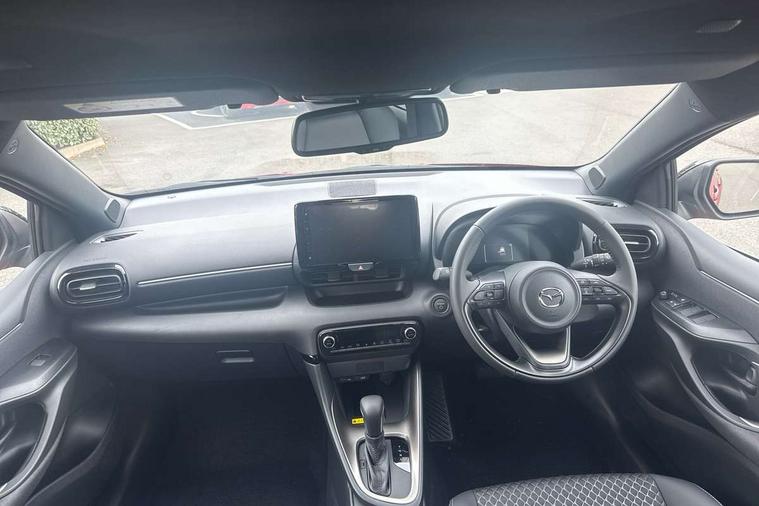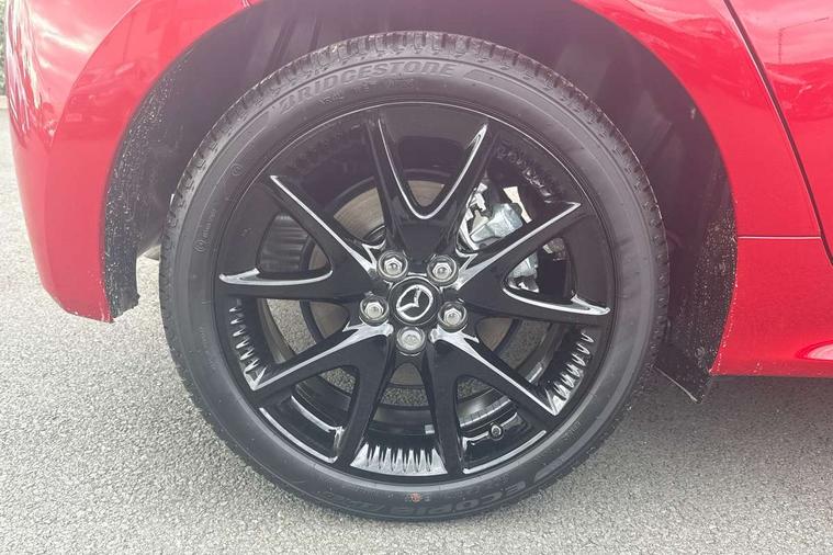 7" Digital instrument cluster with speedometer and hybrid system indicator, Adjustable speed limiter, Drive mode selector (Eco, Normal and Power), Driver attention alert system, Dynamic radar cruise control, E-call with GPS, EV drive mode, Front and rear parking sensors, Integrated bluetooth, Lane tracing assist includes Lane centering, Lane departure alert, Steering assist and Vehicle sway warning, Multi-information display, PAS, Push button start and stop, Qi wireless charging, Rear cross traffic alert with auto braking, Reversing camera, Road sign assist - RSA, Service indicator, Tailgate, Trip computer, Wireless Apple CarPlay and wired Android Auto, i-stop, 6 speaker audio system and 9" colour screen centre display, DAB Digital radio, Steering wheel mounted audio/bluetooth controls, USB type C port, Auto dimming rear view mirror, Auto folding door mirrors, Automatic high beam - AHB, Body coloured front bumper, Body coloured rear bumper with gloss black lower mouldings, Coming home function, Dusk sensing headlights, Front and rear electric windows, Gloss black electric adjustable/heated door mirrors, Gloss black front grille, Gloss black rear roof spoiler, Hybrid badge, LED front fog lights, LED headlights with manual headlight levelling and LED daytime running lights, LED rear combination light with LED turn signals, LED third brake light, Mazda unique tailgate garnish, Piano black lower window garnish, Privacy glass in rear side and rear windows, Rain sensing front wipers with adjustable sensitivity and speed, Rear side wing doors, Rear wash wiper, Shark fin antenna, Welcome lighting, 12V power outlet, 3 seat bench in 2nd row, 60/40 split fold down rear seats, Ambient lighting, Black roof lining in pillar and ceiling, Cloth/Synthetic leather upholstery, Driver, front passenger and two rear door storage, Driver, Front passenger and two rear grab handles with coathooks, Drivers seat manual slide recline and height adjustment, Drivers/front passengers with covered vanity mirrors and light, Dual zone climate control, Front centre armrest with console storage, Front head restraints, Front passenger seat manual slide, recline and height adjust, Front sport seats, Glovebox, Interior courtesy light with LED illumination, ISOFIX child seat anchorage points attached on outer rear seats, Leather handbrake, Leather wrapped gearshift, Leather wrapped steering wheel with telescopic and tilt adjustment, Luggage compartment light, Seatback pocket at rear of the front passenger seat, Single front passenger seat, Three height adjustable rear head restraints, 2x3 point front seatbelts with pre-tensioners, 3 point seatbelts on all rear seats, Airbags - driver and front passenger, Anti-lock braking system (ABS), Blind spot monitoring with rear cross parking support brake function, Collision mitigation braking system, Driver and passenger central airbags, Dynamic stability control + Traction control, Electronic parking brake with auto-hold and auto-disengage function, Emergency brake light signal (EBS), ESP, Front and rear curtain airbags, Front passenger airbag cut-off switch, Front side airbags, Hill start assist control (HAC), Manual child lock in rear doors, Pre-crash safety system - PCS, Rear parking support brake, Regenerative braking system, Seatbelt reminder audible warning, Tyre pressure monitoring system, Deadlocking system, Remote central locking, Smart keyless entry, Thatcham approved immobiliser and alarm, 17" Alloy wheels, Emergency tyre repair kit,