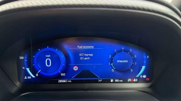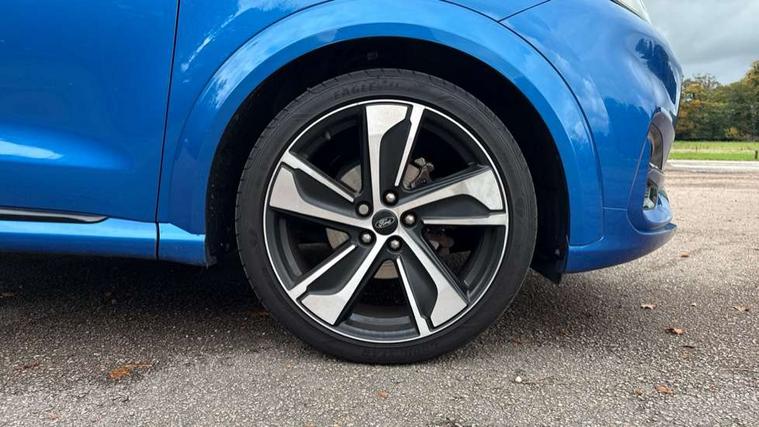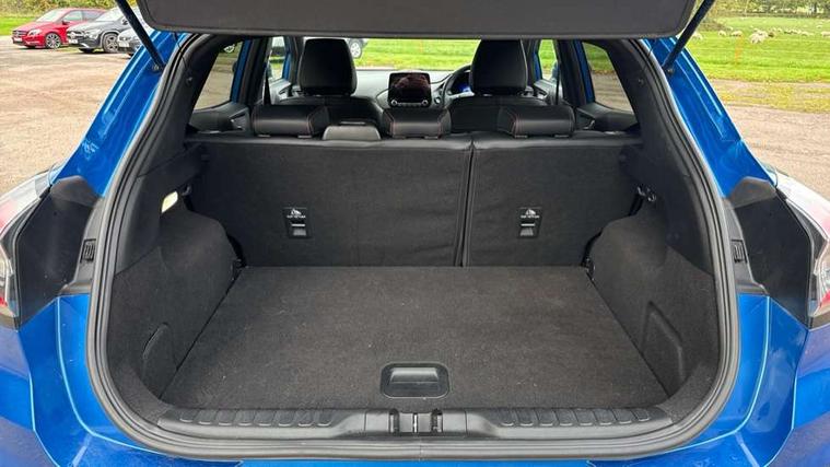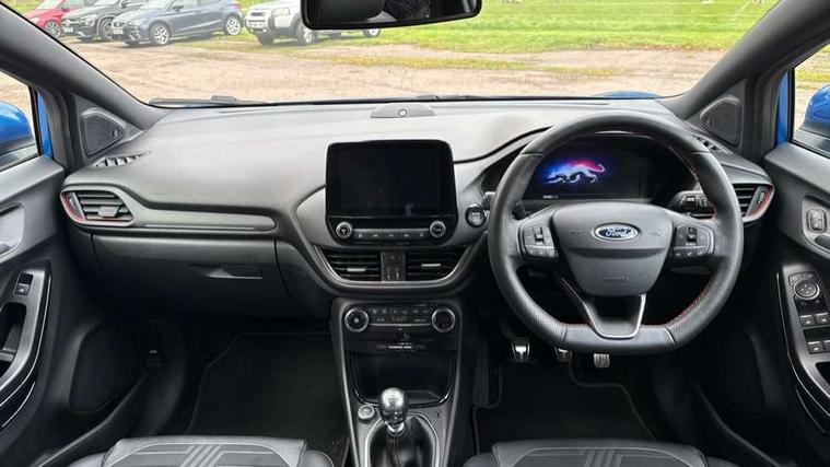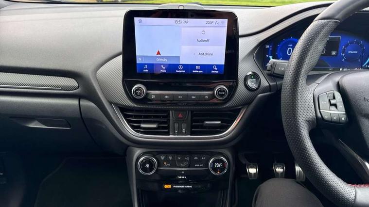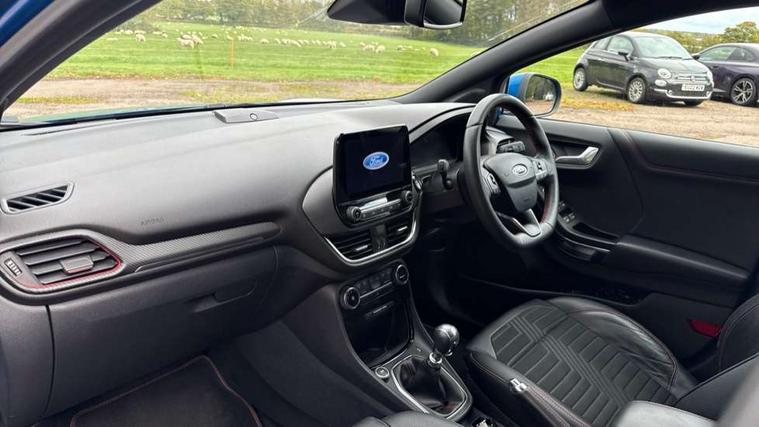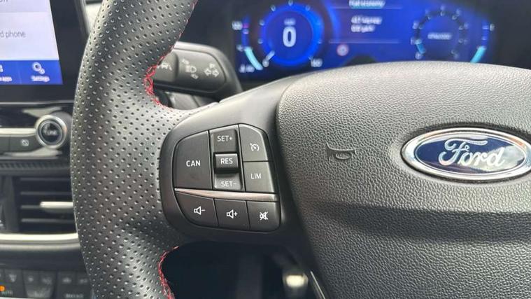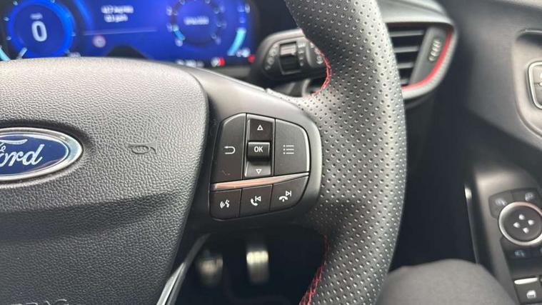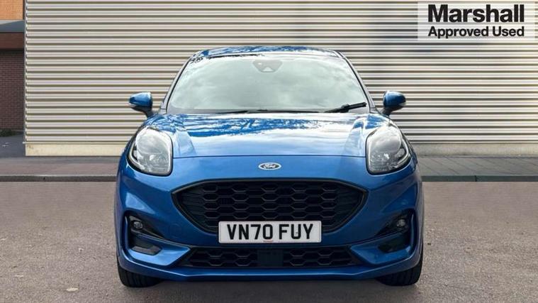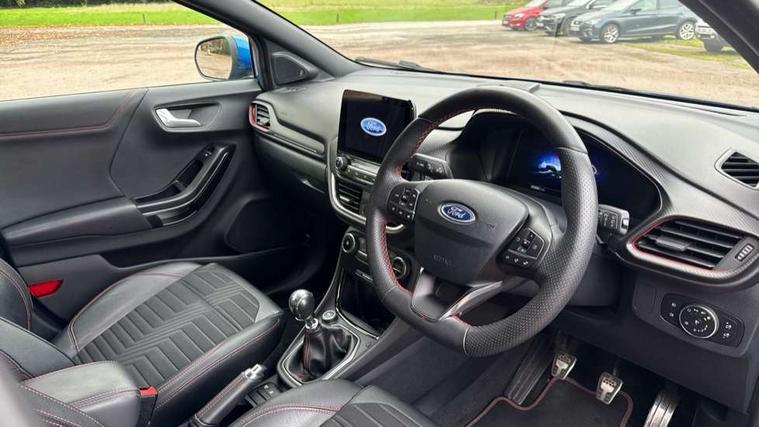 Ford easy fuel, Full digital 12.3" instrument cluster, Lane keeping aid with lane departure warning, Power assist steering, Rear parking sensor, Selectable drive modes(Normal, sport, Eco, trail, slippery), Wireless charging pad, Automatic headlights with rain sensing wipers and auto high beam, Body coloured door mirrors, Front fog lights with cornering lights and LED rear lamps, Power foldable heated door mirrors with puddle lamps, Privacy glass to side rear windows and tailgate glass, Quickclear heated windscreen, Rear wiper, ST-Line body kit with large rear spoiler wth sports suspension, Alloy sports pedals, Centre console with armrest and stowage, Driver and passenger seat lumbar and height adjust, Ford megabox extended bootspace, Front and rear floor mats, Front and rear head restraints, Manual air conditioning, Sensico partial premium upholstery, ST-Line flat bottomed sensico leather steering wheel with leather handbrake and aluminium gear knob, B&O Premium Audio system + Ford SYNC 3 navigation pack - Puma, 3 rear seatbelts, Electronic stability control (ESC) and hill start assist, Pre-collision assist with autonomous emergency braking, pedestrian/cyclist detection & post-collision braking, Tyre pressure monitoring system (TPMS), Thatcham alarm, Carbon look interior deco spears,