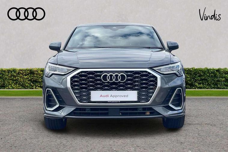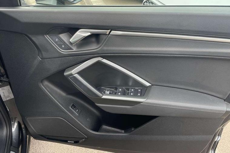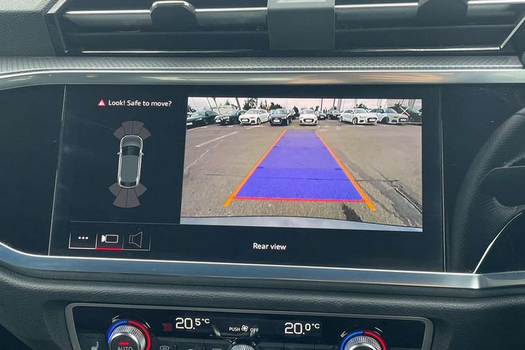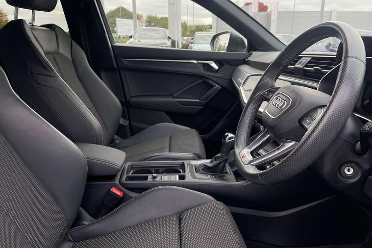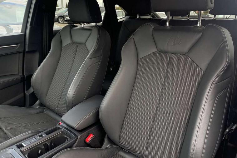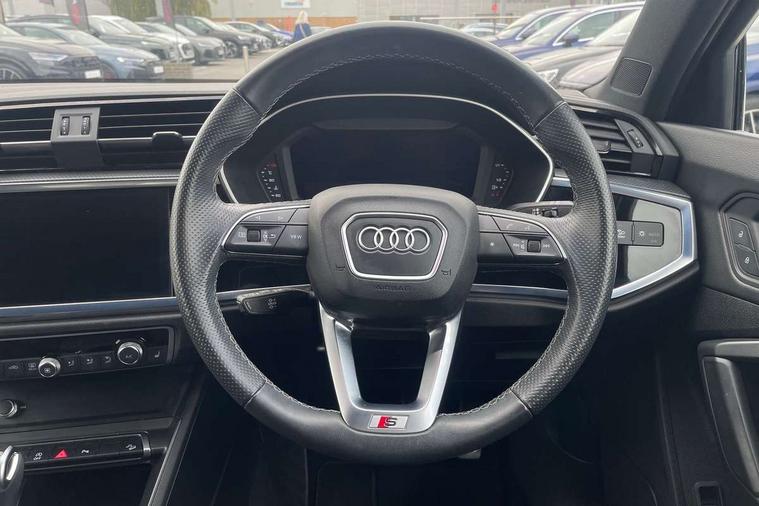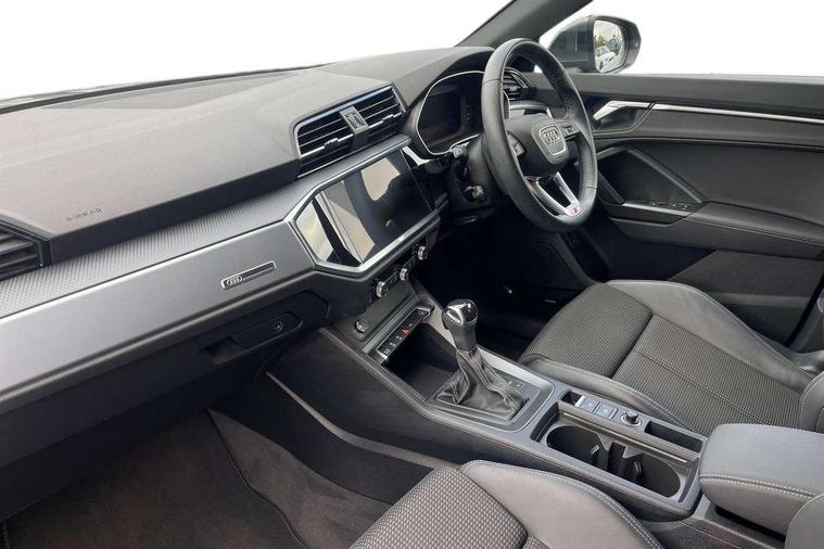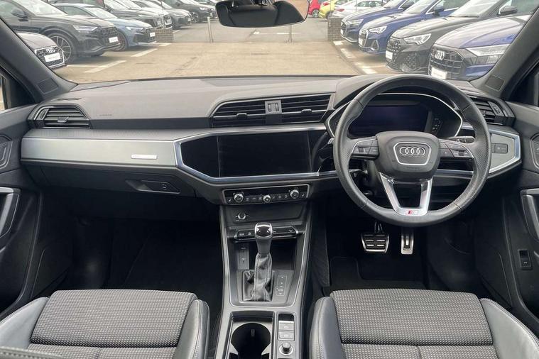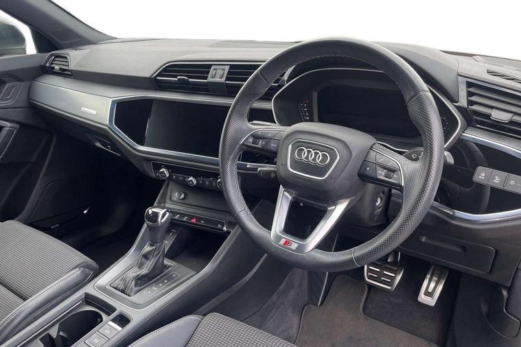 Audi drive select, Audi lane departure warning, Audi Virtual Cockpit - 10.25" display, Bluetooth interface, Camera based traffic sign recognition, Legal emergency call, MMI Navigation Plus with high resolution 10.1 inch touchscreen colour display, Power operated tailgate, Progressive steering, Service interval indicator, Smartphone interface includes wireless Apple carplay/Android Auto, Start stop system with recuperation, Voice control system with natural language interaction, Sports suspension, 2 USB-C ports with charge and data functions, 6 passive loudspeakers, DAB digital radio module, Acoustic windscreen, Aluminium window trim, Auto dimming frameless rear view mirror, Diffuser grille in grained matt black, Diffuser trim in selenite silver, Electrically folding, adjustable and heated door mirrors with integrated LED side indicators and kerb view function for passenger side, Front and rear electric windows, Front fog lights, Front side air inlets in selenite silver, Front underbody protection in manhattan grey paint finish, Grille surround in aluminium silver matt, High gloss black finish B and C pillars, LED Dynamic rear indicators, LED headlights with LED daytime running lights, LED rear lights, LED third brake light, Privacy glass dark tinted rear and rear-side windows (from B-pillar backwards), Radiator grille in anthracite black with inlay in matt aluminium silver, Rain and light sensors, Rear side wing doors, Rear underbody protection in matt black, Rear wiper, S line badges on front wings, S line front and rear bumpers and side skirts in contrasting Manhattan grey paint finish, Side skirt insert in matt Platinium grey, Variable front intermittent wipers, 12V socket in rear centre console, 3 seat bench in 2nd row, 3 spoke leather multifunction steering wheel features S badging and grips in perforated leather with contrast stitching, 40:20:40 folding with manual adjustment for 60:40 forwards/backwards position and backrest angle, Adjustable rear seat bench/backrest with centre armrest and cupholder, Black cloth headlining, Dual zone electronic climate control, Front and rear black floor mats with contrast stitching, Front and rear headrests, Front and rear roof module including reading lights, Front centre armrest, Glove compartment lighting, Height and reach adjustable steering wheel, Illuminated door sill trims with S logo, ISOFIX child seat mounting for front passenger with airbag deactivation and outer rear seat including top tether attachment point for outer rear seats, Luggage compartment light right in white, Luggage compartment sill protection in stainless steel, Manual front seats with height adjustment, Perforated leather gearknob, Single front passenger seat, Stainless steel pedals, Ambient lighting pack - Q3, Non smoking pack - Q3, 3x3 point rear seatbelts, 6 airbags - Driver, front passenger, curtain and side windows, Audi pre-sense front with pedestrain and cyclist recognition, Electrically operated child locks on rear doors, Electromechanical parking brake, Electronic stabilisation control including ABS, ASR and EDL, Front seatbelt reminder, Hill descent control, Hill hold assist, Pre sense basic, Seatbelt monitoring, Tyre pressure warning, Warning triangle and first aid kit, Anti theft alarm, Anti theft wheel bolts, Immobiliser, Remote central locking, Aluminium look interior elements, Black dashboard, Dark matt brushed aluminium inlay, Detail dashboard around MMI touch colour display in glass look, black with surround in aluminium look, Leatherette door armrest,