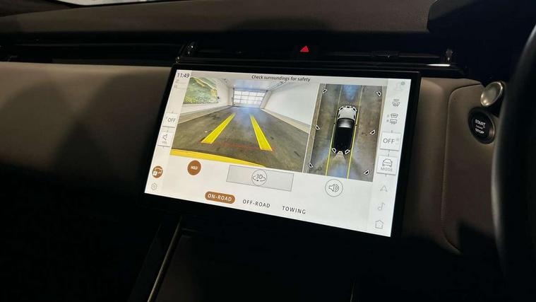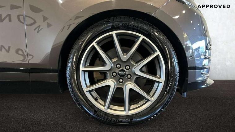 Adaptive cruise control with steering assist, Android Auto, Apple CarPlay, Blind spot assist, Bluetooth connectivity, Brake pad wear indicator warning light, Driver condition monitor, eCall emergency call system, Front and rear parking aid, InControl remote, Land Rover InControl apps, Lane keep assist, Pivi pro with connected navigation, Rear collision monitor, Rear traffic monitor, Service indicator, Speed proportional electronic power assisted steering (EPAS), Traffic sign recognition with adaptive speed limiter, Trip computer, Voice control system, Wireless device charging, 8 speed automatic transmission, Adaptive dynamics, All terrain progress control, Electronic air suspension, Open differential with torque vectoring by braking, Single speed transfer box, DAB radio, Steering wheel mounted controls, 3rd brake light, Acoustic laminated windscreen, Auto dimming interior rear view mirror, Automatic headlamp levelling, Automatic headlights, Body coloured bumpers, Boot protection plate, Electric windows with one touch open/close and anti trap, Flush deployable exterior door handles, Follow me home headlights, Heated rear window with timer, Heated washer jets, Metal front tread plates, Metal load space scuff plates, Pixel LED headlights with signature DRL, Power fold, auto-dimming, heated door mirrors with memory and approach lights, Rain sensor windscreen wipers, Rear animated directional indicators, Rear fog lights, Rear side wing doors, Rear wash/wipe, Tailgate/boot lid spoiler, Trailer stability assist, Velar badge, 3 seat bench in 2nd row, Ambient lighting, Bright metal pedals, Carpet mats, Driver/passenger sunvisors with illuminated vanity mirrors, Ebony morzine headlining, Electrically adjustable steering column, Extended leather upgrade, Heated steering wheel, Isofix system on outer rear seats, Loadspace cover, Overhead lighting console, Overhead stowage for sunglasses, Passive front headrests, Rear air vents, Rear centre headrest, Single front passenger seat, Twin front cupholders, Twin sliding front centre armrest, Online pack with data plan - Velar, Power socket pack 2 - Velar, 380mm front brakes and 325mm rear brakes, 3x3 point rear seatbelts, Anti-lock braking system (ABS), Cornering brake control, Curtain airbags, Customer configurable autolock, Door side intrusion beams, Driver airbag, DSC - Dynamic Stability Control, Electronic brake force distribution, Electronic parking brake, Electronic traction control, Emergency braking, Front and rear seatbelt reminder, Hill descent control, Hill launch assist, Low traction launch, Passenger airbag, Power operated child locks, Rear airbags, Roll stability control, Side airbags, Tyre pressure monitoring system (TPMS), Global lock and unlock switch on driver door, Immobiliser, Intrusion sensor, Keyless entry, Lock only switch on front passenger door, Locking wheel nuts, Perimetric alarm, Remote central locking, All season tyres,