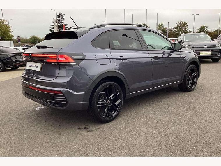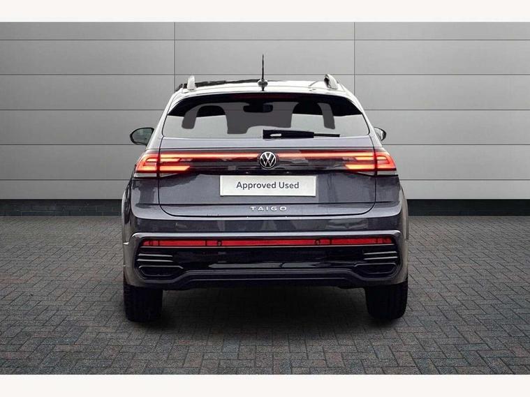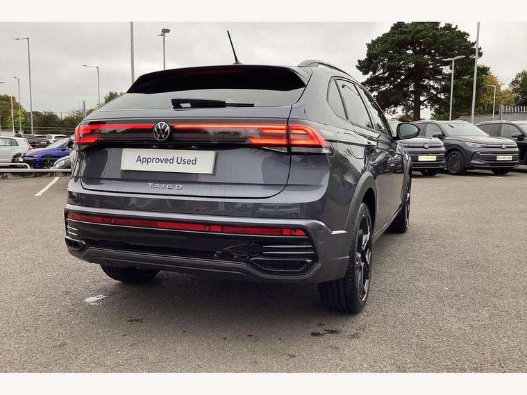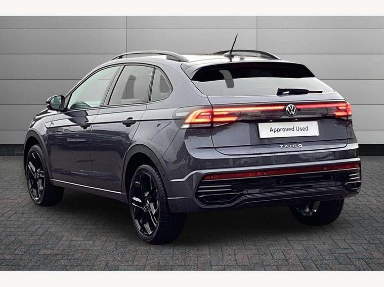 Advanced driver attention and drowsiness monitor, Digital cockpit pro - 10.25" high resolution TFT dash display screen with customizable menus and information, Driving profile selection, e-Call (emergency call), Power Steering, Predictive adaptive cruise control, Travel assist including emergency assist, Washer fluid level indicator, Wireless Charging including Bluetooth, Start-stop system with battery regeneration (recuperation - energy recovery during braking), XDS electronic differential lock for improved traction and handling, Digital radio reception (DAB+), WeConnect plus, Ambient lighting with logo projection, Aspherical driver's exterior mirror, Auto headlights, Body coloured bumpers, Body coloured door handles, Cornering headlights, Electric windows, External USB type C socket and charging sockets, LED rear combination lamp, LED third brake light, Left convex exterior mirror, Power folding adjustable/heated exterior mirrors and front passenger exterior mirror lowering function, Rear fog light on one side, reversing light on both sides, Rear side wing doors, Rear wash/wipe with intermittent wipe setting, 12V socket in centre console, 2 front reading lights, 3 rear head restraints, 3 seat bench in 2nd row, Air care climatronic air conditoning system with active combination filter and 2-zone temperature control, Black carpets, Black roof lining, Child seat anchor for child seat system i-Size, 2x top tether and child seat anchor in front on front passenger side, Chrome bezel for instrument cluster, vents, door handles + gear shift, Driver and front passenger seat height adjustment, Front + rear carpet mats, Front centre armrest, Front footwell illumination, Front sports comfort seats, Heated front seats, Height and reach adjustable steering wheel, Interior ambient lighting and surround lighting, Karoso artvelours cloth upholstery, Leather trimmed gear knob, Leather wrapped multifunction steering wheel, Luggage compartment floor, Luggage compartment light, Lumbar support for driver's and front passengers seat, Seat covers in grey + titanium black, Single front passenger seat, Split folding backrest with centre armrest and unsplit rear seat bench, Stainless steel pedals, Storage compartment under front seats, Sun visors with illuminated vanity mirrors, Black design pack - Taigo Black Edition, Black roof pack with mirror housing - Taigo, IQ.LIGHT - LED matrix headlights pack - Taigo, Light and Sight pack including High beam assist - Taigo, 2 x 3-point seatbelts/outer rear seats with ECE label, 3-point seat belts in front with pretensioner and height adjustment, 3-point seatbelt for centre rear seat, Adaptive driver and front passenger airbags with passenger airbag deactivation function, Driver and front passenger safety-optimised head restraints, Electronic stability control, Extended and predictive pedestrian/ cyclist protection, Front and rear disc brakes, Front curtain and side airbags with center airbag, Hill start assist, Manual rear child locks, Single tone horn, Tyre pressure loss indicator, Anti-theft alarm system with interior monitoring, backup horn, and towing protection, Grey anodised matte decorative inserts in dash and front door panels, 18" York black alloy wheels with anti theft wheel bolts, Breakdown kit, Low rolling resistance tyres,