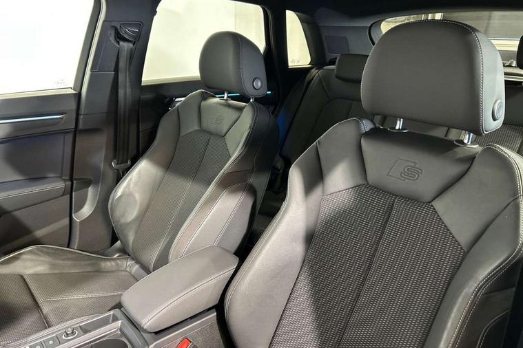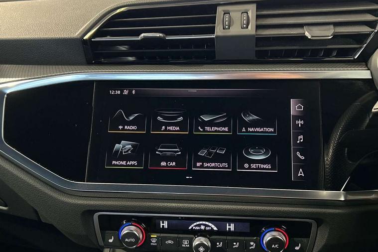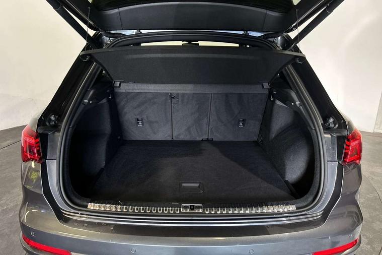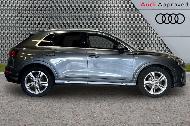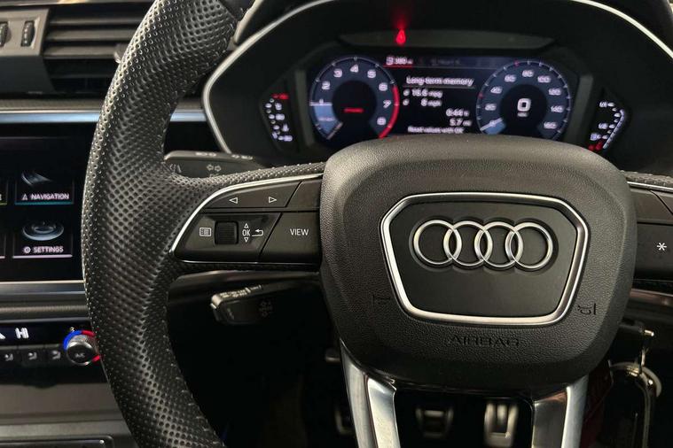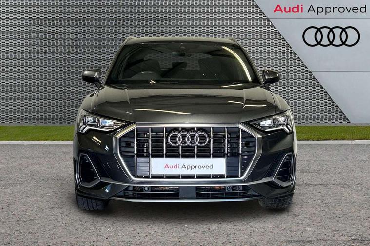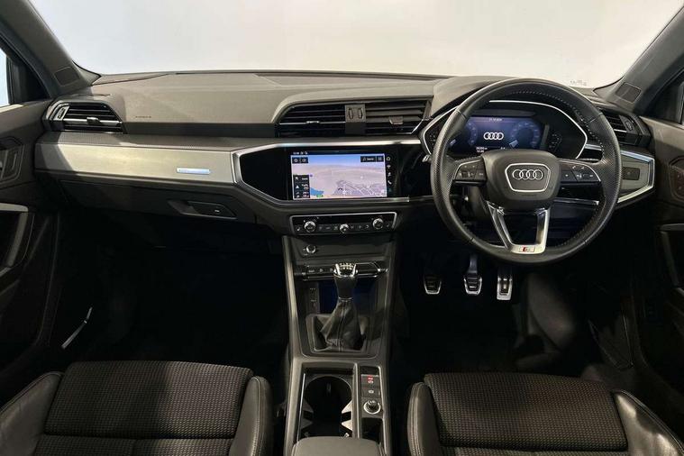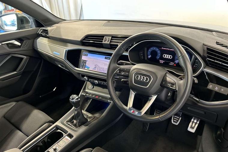 Audi connect safety and service (e-call), Audi drive select, Audi lane departure warning, Audi side assist, Audi smartphone interface, Audi Virtual Cockpit - 10.25" display, Bluetooth interface, Camera based traffic sign recognition, Cruise control + speed limiter, MMI navigation plus with MMI touch, Power opening/closing tailgate, Progressive steering, Rear parking sensors, Service interval indicator, Stop/start system, Voice control system, Sports suspension, 1 x USB type C and 1 USB type A charging points, 6 speakers, DAB digital radio module, Acoustic windscreen, Aluminium roof rails, Aluminium window trim, Auto dimming rear view mirror, Body coloured bumpers, Diffuser in matt Platinum grey, Electrically adjustable and heated door mirrors with integrated LED side indicators, Front and rear electric windows, Front fog lights, Front side air inlets in matt platinum grey, Front spoiler blade in matt platinum grey, Grille vertical bars in aluminium silver/Matt, High gloss black finish B and C pillars, LED headlights with LED daytime running lights and dynamic rear indicator, LED rear lights, Privacy glass, Rain and light sensors, Rear diffuser strip in matt titanium black, S Line badge on wings, S Line front and rear bumpers, Side skirt insert in matt Platinium grey, Titanium black radiator grille, 12V socket in rear centre console, 40:20:40 split folding rear bench seat, Adjustable rear seat bench/backrest with centre armrest and cupholder, Aluminium door sill trims, Black cloth headlining, Dual zone climate control, Front and rear black floor mats with contrast stitching in rock grey, Front and rear headrests, Front and rear roof module including reading lights, Front centre armrest with storage compartment and angle adjustment, Glove compartment lighting, Height and reach adjustable steering wheel, Illuminated door sill trims with S logo, ISOFIX child seat mounting and Top Tether with front passenger airbag deactivation, Luggage compartment light, Manual front seats with height adjustment, Perforated leather gearknob, Stainless steel luggage compartment sill finisher, Stainless steel pedals, Non smoking pack - Q3, 3x3 point rear seatbelts, 6 airbags - Driver, front passenger, curtain and side windows, Audi pre-sense front with pedestrain and cyclist recognition, Electrically operated child locks on rear doors, Electromechanical parking brake, Electronic stabilisation control including ABS, ASR and EDL, Hill descent control, Hill hold assist, Pre sense basic, Seatbelt monitoring, Tyre pressure warning, Warning triangle and first aid kit, Anti theft alarm, Anti theft wheel bolts, Remote central locking, Dark matt brushed aluminium inlay, MMI touch colour display in gloss black with aluminium surround,