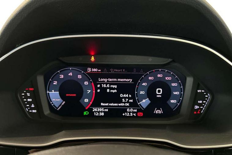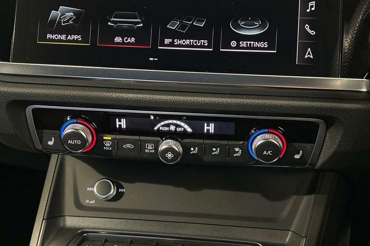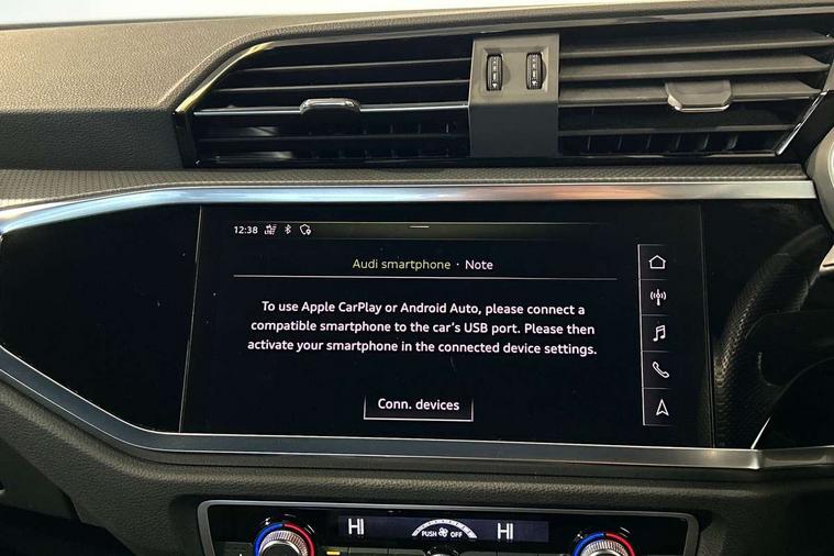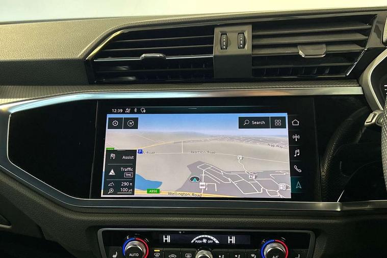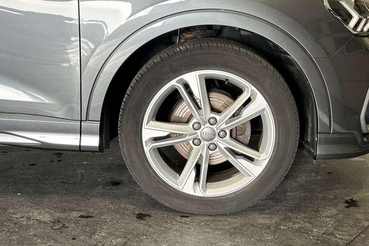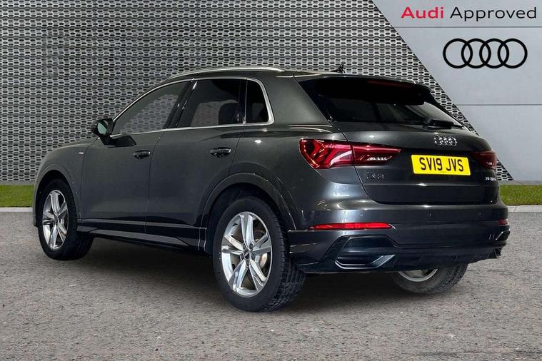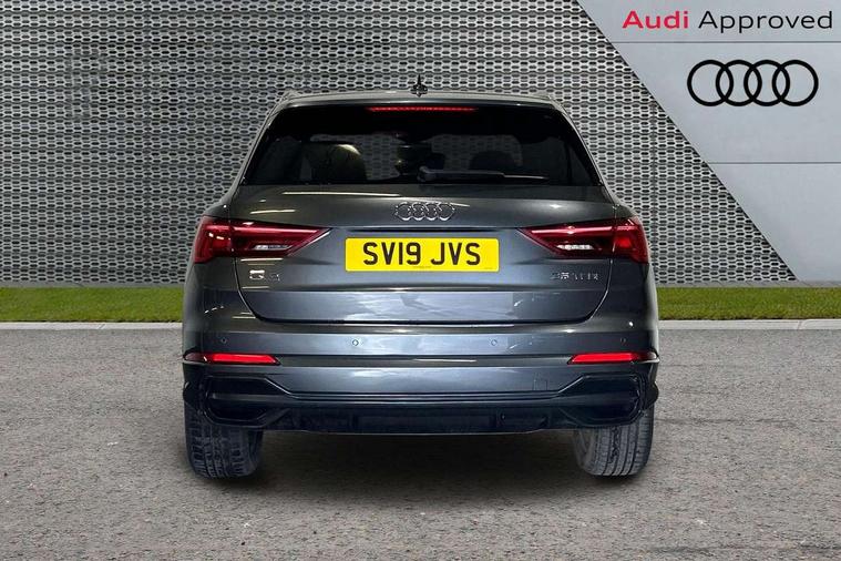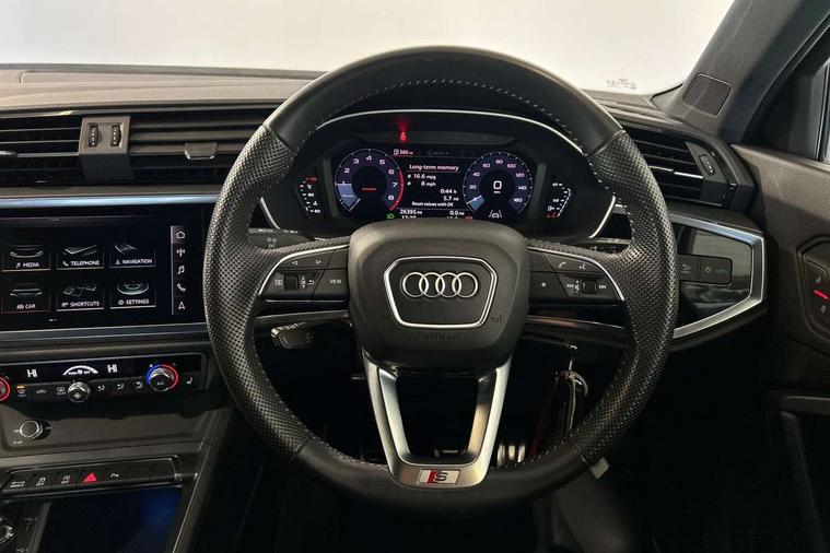 Audi connect safety and service (e-call), Audi drive select, Audi lane departure warning, Audi side assist, Audi smartphone interface, Audi Virtual Cockpit - 10.25" display, Bluetooth interface, Camera based traffic sign recognition, Cruise control + speed limiter, MMI navigation plus with MMI touch, Power opening/closing tailgate, Progressive steering, Rear parking sensors, Service interval indicator, Stop/start system, Voice control system, Sports suspension, 1 x USB type C and 1 USB type A charging points, 6 speakers, DAB digital radio module, Acoustic windscreen, Aluminium roof rails, Aluminium window trim, Auto dimming rear view mirror, Body coloured bumpers, Diffuser in matt Platinum grey, Electrically adjustable and heated door mirrors with integrated LED side indicators, Front and rear electric windows, Front fog lights, Front side air inlets in matt platinum grey, Front spoiler blade in matt platinum grey, Grille vertical bars in aluminium silver/Matt, High gloss black finish B and C pillars, LED headlights with LED daytime running lights and dynamic rear indicator, LED rear lights, Privacy glass, Rain and light sensors, Rear diffuser strip in matt titanium black, S Line badge on wings, S Line front and rear bumpers, Side skirt insert in matt Platinium grey, Titanium black radiator grille, 12V socket in rear centre console, 40:20:40 split folding rear bench seat, Adjustable rear seat bench/backrest with centre armrest and cupholder, Aluminium door sill trims, Black cloth headlining, Dual zone climate control, Front and rear black floor mats with contrast stitching in rock grey, Front and rear headrests, Front and rear roof module including reading lights, Front centre armrest with storage compartment and angle adjustment, Glove compartment lighting, Height and reach adjustable steering wheel, Illuminated door sill trims with S logo, ISOFIX child seat mounting and Top Tether with front passenger airbag deactivation, Luggage compartment light, Manual front seats with height adjustment, Perforated leather gearknob, Stainless steel luggage compartment sill finisher, Stainless steel pedals, Non smoking pack - Q3, 3x3 point rear seatbelts, 6 airbags - Driver, front passenger, curtain and side windows, Audi pre-sense front with pedestrain and cyclist recognition, Electrically operated child locks on rear doors, Electromechanical parking brake, Electronic stabilisation control including ABS, ASR and EDL, Hill descent control, Hill hold assist, Pre sense basic, Seatbelt monitoring, Tyre pressure warning, Warning triangle and first aid kit, Anti theft alarm, Anti theft wheel bolts, Remote central locking, Dark matt brushed aluminium inlay, MMI touch colour display in gloss black with aluminium surround,