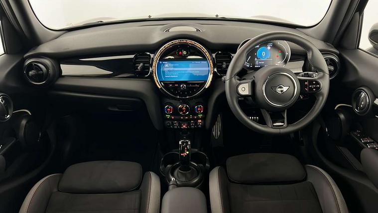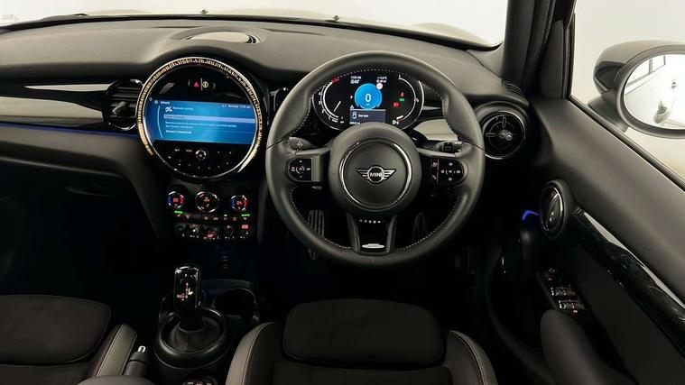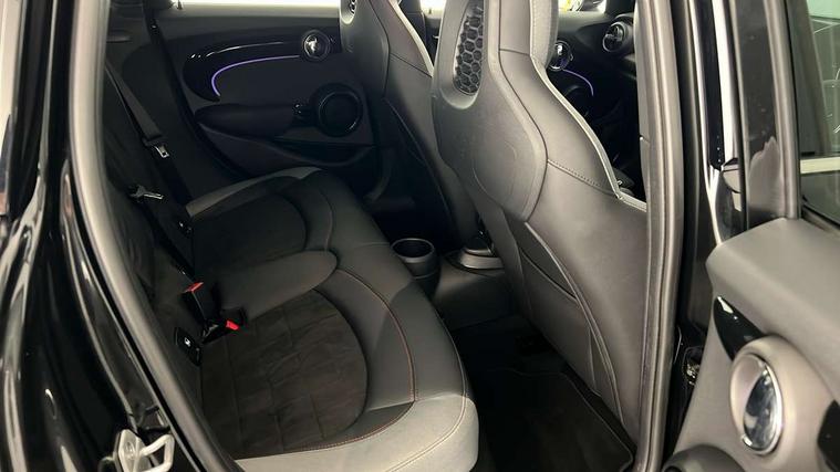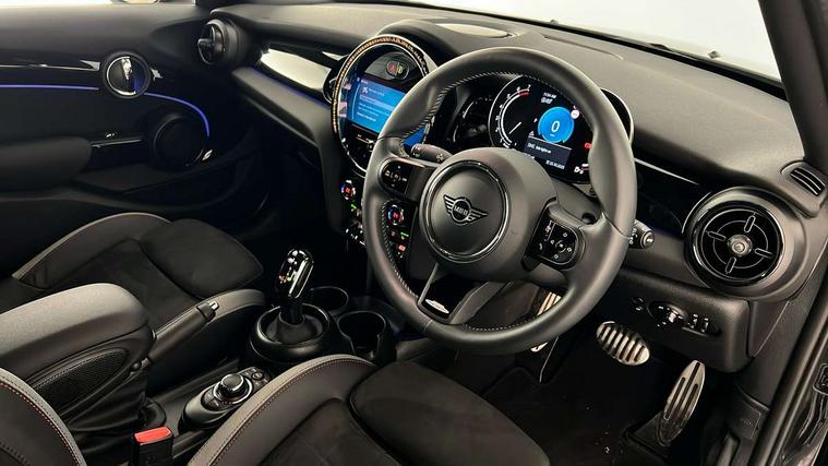 Apple CarPlay, Automatic start/stop function with brake energy recuperation, Compatible mobile phone bluetooth with audio streaming, Electro-mechanical speed dependant steering assistance, Flexible car sharing preparation, MINI Driving Modes - centre toggle switch to control driving setting (sport, mid and green), Mini E-call, MINI TeleServices, On board computer, Rear park distance control, Service interval indicator, Adaptive suspension, Double Vanos system, Fully variable valve control, Gear change indicator display, High precision injection, Performance Control, Steptronic transmission with double clutch, 8.8" touchscreen with LED ring, FM tuner and DAB digital radio, 3rd brake light, Automatic headlight activation switch, Body colour fuel filler cap, Chrome border high gloss black slats radiator grille, Dynamic brake lights, Electric front+rear windows, Exhaust tailpipe on left with chrome finisher, Heated rear window, Heated windscreen washer jets, JCW Aerodynamic kit - Front and rear bumpers with sporty JCW styling and part-painted side sills with MINI John Cooper Works door sill finishers, John Cooper Works rear spoiler, Metal door sill strips with MINI imprint, Model logo Cooper on right of tailgate, Rain sensor window wipers, Rear fog lights, Rear LED lights with union jack design, Rear side wing doors, Rear window wiper, Side scuttle panel with integrated indicator, Sun/heat protection glass, White indicator lenses, 12V Accessory socket in centre console, 3 seat bench in 2nd row, 4 lashing eyes in luggage compartment, 60/40 split folding rear seat, Anthracite headliner including grab handles and clothes hooks, Carbon black colour line - Knee roll and door armrest, Chrome interior highlights, Cupholders, Front and rear isofix with front passenger airbag deactivation, Front and rear velour floor mats, Glove compartment, Height and length steering column adjustment, Interior lighting with 12 different colours across the dashboard, underneath door bezel with illuminated laser-engraved design on central display, JCW Sport seats with integrated headrests, adjustable thigh support and John Cooper Works logo, Leatherette gearshift lever and handbrake gaiters, LED reading lights, vanity mirror lights, front foot well light and spotlight on front seats, Mechanical seat adjustment - forward/back & backrest for front seats and driver seat height adjust, Multifunction steering wheel, Single front passenger seat, Storage compartments in doors, Sunvisors with vanity mirrors, Walknappa leather steering wheel with grey seam and John Cooper Works badge on Piano Black lower steering wheel spoke, Piano black exterior pack - Mini Hatchback Cooper, 3 point seatbelts on all five seats, 6 Airbags - front, side, head and seat belt tensioners, Anti-lock braking system (ABS), Child locks on rear doors, DSC - Dynamic Stability Control, Front and rear disc brakes, Hill start assist, Single tone fanfare horn, Tyre pressure monitoring system, Alarm system with tilt sensor, monitoring doors, bonnet interior and tailgate, Electronic vehicle immobiliser, Start/stop toggle with keyless go, Piano black interior trim, Tool kit,