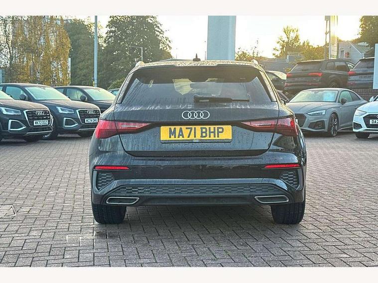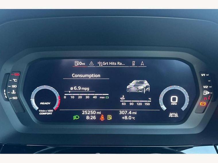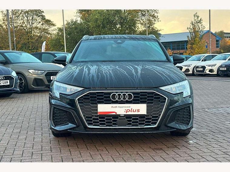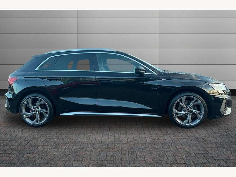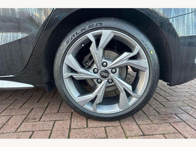 Audi connect emergency call and service, Audi drive select (Auto, Comfort, Dynamic and Individual), Audi smartphone interface, Audi Virtual Cockpit - 10.25" digital and colour instrument cluster, Automatic start/stop system with recuperation, Bluetooth interface, Collision avoidance assistant, Electromechanical power speed sensitive steering, Lane departure warning system, MMI Navigation Plus with high resolution 10.1" colour touch screen display, Service indicator, Trip computer, Voice control system with natural language interaction, 2xUSB-C connection with data and charging functions, 6 passive loudspeakers, DAB Digital radio, 3rd brake light, Acoustic glass windscreen, Aluminium window trim, Auto dimming frameless rear view mirror, Electrically adjustable/heated/folding/auto dimming door mirrors with integrated LED indications + kerb view function for passenger side, Front electric windows, Illuminated aluminium inserts front door sills with S logo, LED daytime running lights, LED headlights with LED rear lights and dynamic rear indicators, Light and rain sensors, Privacy glass - dark tinted rear window, rear door and side windows, Rear electric windows, Rear side air outlets in grained matt black, Rear wiper, S line bumpers, S roof spoiler, 12V socket and storage compartment in front centre console, 40/20/40 split folding rear seat bench with cupholder, Black cloth headlining, Dual zone electronic climate control, Front and rear centre armrest in leather, Front and rear headrests, Front/rear floor mats, Height and reach adjustable steering wheel, Interior lighting - glove compartment light and right hand side, Luggage compartment floor covering, Manual boot compartment lid, Manually adjustable front seats, Seat side bolsters, Stainless steel pedals and front footrest, Twin leather upholstery with front sports seats S embossed logo, Aluminium interior elements pack - A3 Sportback, S line styling pack - A3 Sportback, 3x3 point rear seat belts, Driver and front passenger airbag with passenger airbag deactivation, Electronic Stabilisation Control (ESC) including ABS, ASR and EDL, First aid kit with warning triangle and 2 safety vests, Front side airbags with head airbags and interaction airbag, Hill hold assist, Pre-sense front with pedestrian and cyclist detection, Seatbelt monitoring, Tyre pressure loss indicator, Anti theft alarm, Anti-theft wheel bolts, Electronically operated child lock, Immobiliser, Remote control central locking, Accent surfaces in the dashboard and centre console in platinum grey silk effect paint finish, Dark spectrum aluminium inlays,