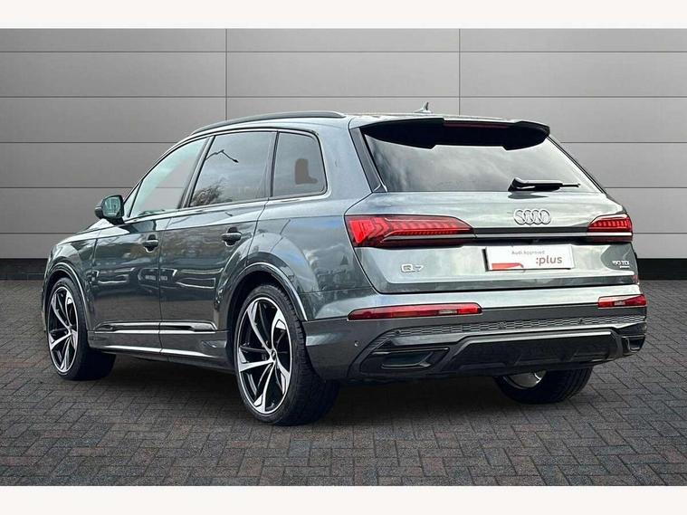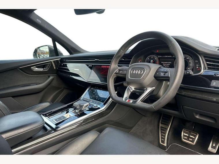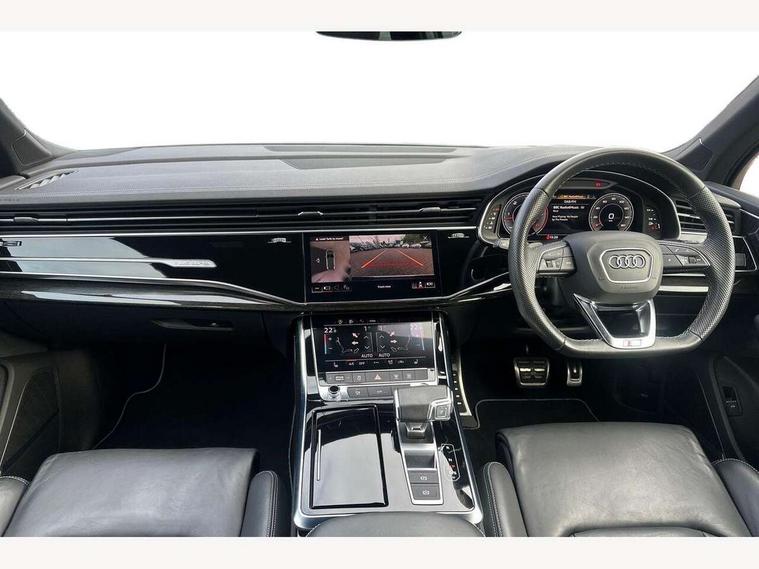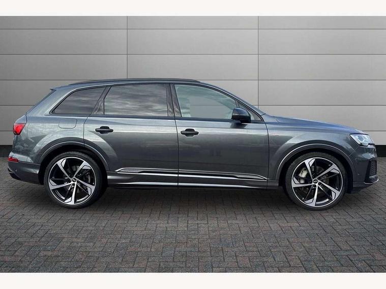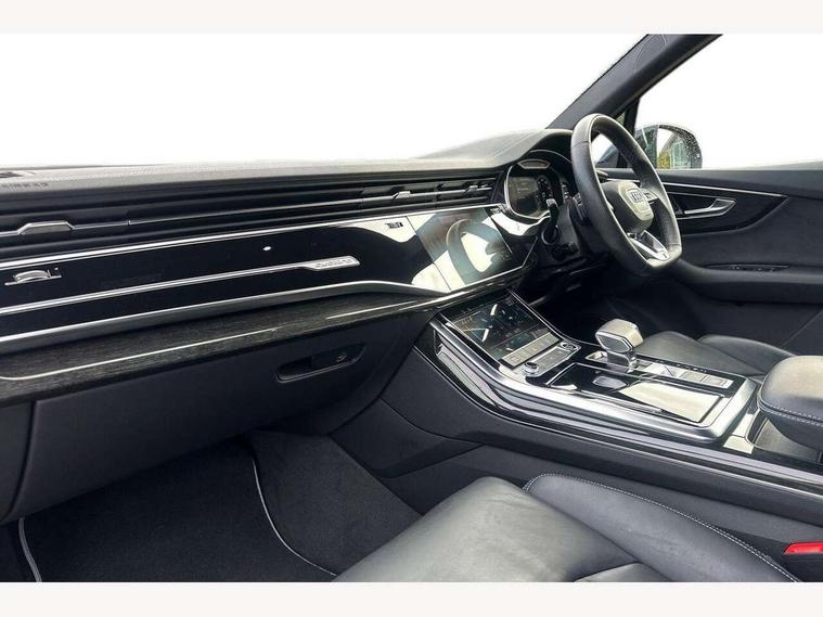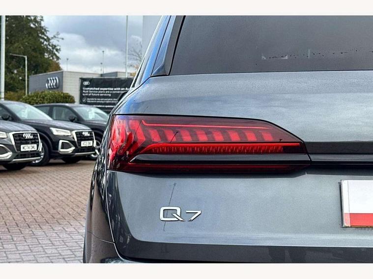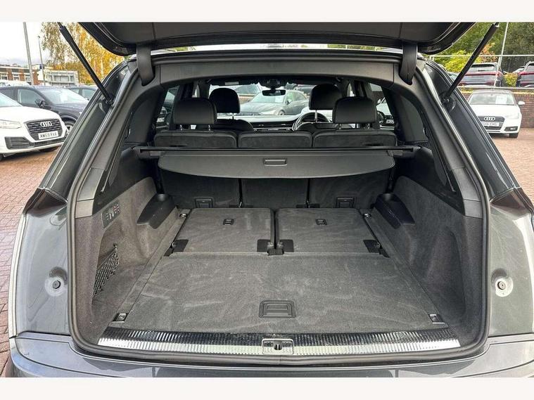 Audi connect safety and service (e-call), Audi connect with Amazon Alexa Integration, Audi drive select (Auto, Comfort, Dynamic, Efficiency, Individual, Off-road and All road), Audi phone box light with wireless charging, Audi virtual cockpit - 12.3" high-resolution LCD display with fully customisable instrument cluster, Bluetooth interface, Camera based traffic sign recognition, Electromechanical steering, MMI navigation plus with MMI touch screens includes 10.1" and 8.6" screens with haptic feedback, Natural voice recognition, Power operated tailgate, Smartphone interface includes wireless Apple carplay/Android Auto, Start/stop system, 48V Mild hybrid technology, Adaptive air sports suspension, Quattro all wheel drive with self locking centre differential, Audi music interface - front 2 USB-C ports with charger and data functions, DAB digital radio module, 3rd brake light, Aluminium window trim, Audi Beam uses LEDs to project S emblem with red rhombus onto the ground when opening the side doors (front/rear), Auto dimming frameless rear view mirror, Black roof rails, Bumpers in contrast paint scandium grey finish includes door trim and wheel arch trim strips, inlays in door strip contain quattro embossing, Dark tinted Matrix LED headlights with dynamic front and rear indicators, Electrically adj heated/folding + automatically dimming exterior mirrors with memory + automatic kerb side function for passenger side exterior mirror, Heat insulating glass in windshield, Integrated LED indications in door mirrors, LED daytime running lights, LED rear tail lights, Privacy glass - dark tinted rear and rear side windows from B-pillar backwards, Rear side wing doors, Rear wiper, 2 seat bench in 3rd row, 3 seat bench in 2nd row, 7 seat layout with ISOFIX points for the front passenger seat and rear passenger seat, Black cloth headlining, Comfort front centre armrest, Electric adjustable front seat with 4 way lumbar support, driver memory functionality, Folding rear seats, Front head restraints, Front/rear floor mats, Heated front seats, Illuminated door sill trims with S logo, Luggage compartment sill protection in stainless steel, Rear head restraints, Single front passenger seat, Stainless steel pedals, Sunvisors with illuminated vanity mirrors, Black styling pack plus - Q7, Technology Pack Pro - Q7, 3 point seatbelts on all rear seats, Audi pre sense front, Child locks on rear doors, Driver and front passenger, front side and curtain airbags, Electromechanical parking brake, Electronic Stabilisation Control (ESC) including ABS, ASR and EDL, Extended pedestrian protection measures, Hill hold assist, Seatbelt monitoring, Tyre pressure loss indicator, Warning triangle and first aid kit, Anti theft alarm, Anti-theft wheel bolts and wheel loosening detection, Remote central locking, Polished oak trim with grey finish inlay, Tool kit, Tyre repair kit,