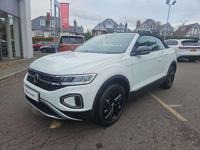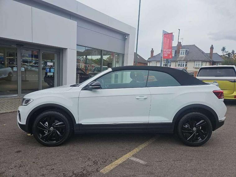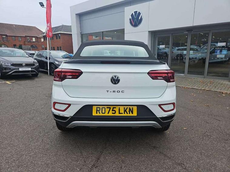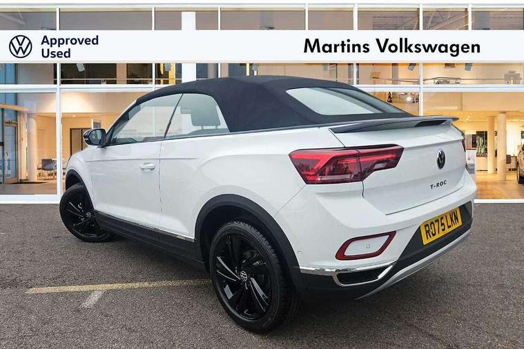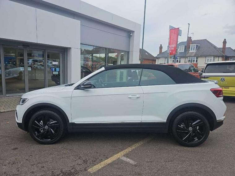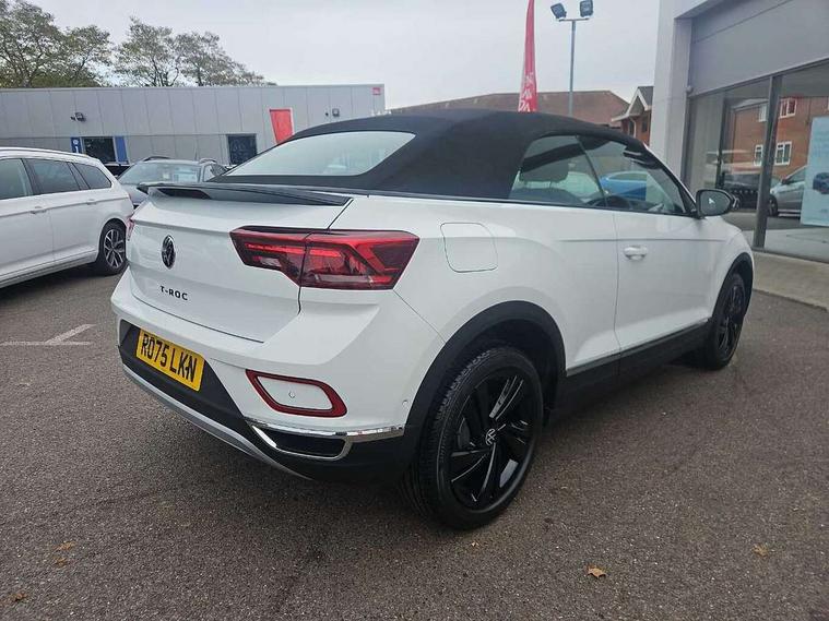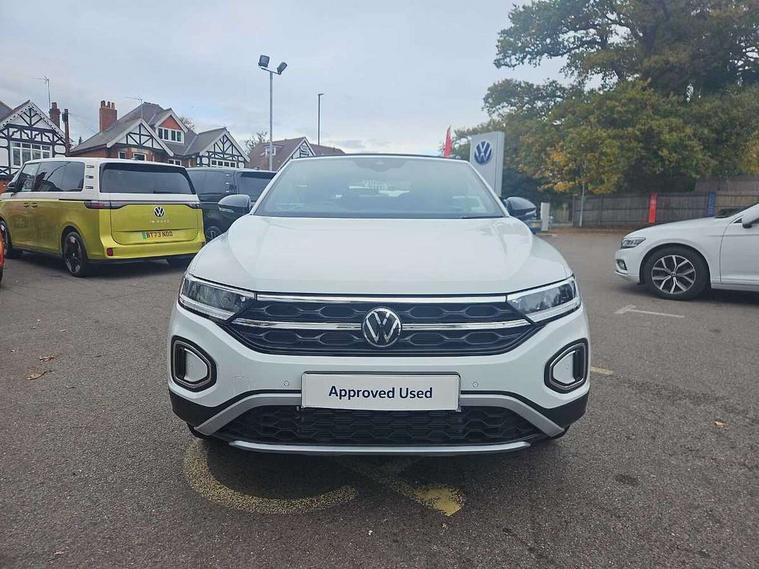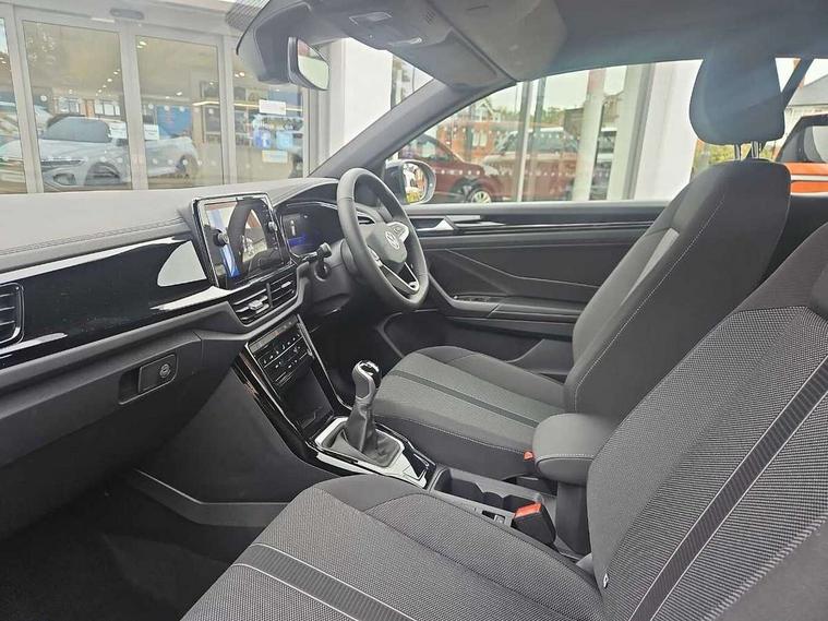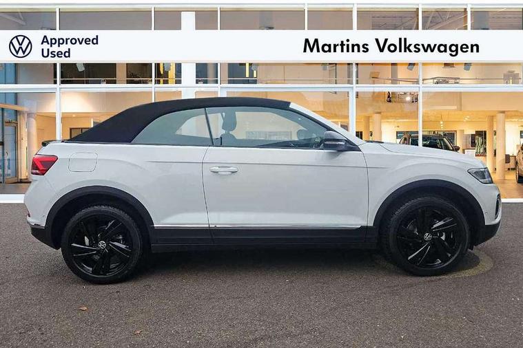 Adaptive cruise control and speed limiter, Advanced driver attention and drowsiness monitor, Brake pad wear indicator, Car information display, Driver tips and journey analysis, Dynamic road sign display, Emergency call service, Modified key software - reduce switch off time for key status change to Long no motion, Multifunction computer with visual gear change recommendation for fuel consumption, Multifunction front facing camera, Online services, Park assist including front and rear parking sensors, Speedo and rev counter, electronic odometer, trip, service interval display and exterior temperature gauge, Start/stop system with brake energy recovery, Tailgate/trunk lid release from outside, Warning sound and light for front seatbelts unfastened, Wireless App-Connect for apple Carplay and android Auto, Digital radio reception (DAB), Diversity antenna for FM reception, Mobile phone interface with inductive charging feature, Music playback - MP3, WMA and AAC files, SMS functionality - read, compose and send SMS messages using touch-screen display, Title and cover art display, USB-C Interface and USB charging socket, We Connect and We Connect Plus functionality, Ambient lighting with logo projection, Auto dimming interior rear view mirror, Automatic hazard lights activation under emergency braking, Automatic headlight control with LED separate daytime running lights with coming/leaving home function, Black roof, Body colour door handles, Body colour rear boot spoiler, Body coloured bumpers and radiator grille with chrome trim and front fog lamps with chrome bezel, Chrome effect left and right trapezoid exhaust tailpipe fascia surround, Dark red rear combination lamps in LED technology, Dusk sensor, Exterior mirrors aspherical on driver side, convex on front passenger side, Headlight range control, Heat insulating glass windscreen, LED 3rd brake light, LED rear number plate lights, Power operated canvas convertible top, Power windows with comfort operation and circuit breaker, Rain sensor, Rear boot, Rear exhaust tailpipe, Rear fog light on one side and reversing lights on both sides, Remote electrically foldable door mirrors, puddle lights and reverse activated passenger door mirror, Volkswagen roundel, Windscreen wiper with intermittent wipe light, Without exterior ambient lighting, 12V socket in centre console storage area, 2 LED front reading lights, 2 seat bench in 2nd row, 50:50 Split folding rear seat backrests with fixed rear seat bench, Air care climatronic air conditoning system with active combination filter and 2-zone temperature control, Black door lower parts with chrome trim, Chrome plated surround to light, mirror and window switch, Door and side trim panel with leatherette insert, Easy entry backrest release, Front and rear carpet mats with black stitching, Front centre armrest, Front cupholders x 2, Front door pockets, Front seat back storage pockets, Heated multi function steering wheel, Height/reach adjust steering wheel, Instrument lighting, white adjustable panel illumination, Interior light delay, Interior light in footwell, Interior lighting with switch off delay and contact switches on all doors, Interior white ambient lighting and surround lighting, Isofix child seat preparation, Lockable glove compartment with light, Luggage compartment lighting, Rear head restraints, Single front passenger seat, Sun visors with illuminated vanity mirrors, Driver assistance pack without proactive passenger protection - T-Roc cabriolet, 2 x 3-point seatbelts/outer rear seats with ECE label, Driver and front passenger airbag with front passenger airbag deactivation, Driver and front passenger safety-optimised head restraints, Drivers seatbelt reminder, Electronic parking brake, Electronic Stability Control (ESC) including ABS, ASR and EDL, Front and rear disc brakes, Front assist with autonomous emergency braking, Pedestrian monitoring, Predictive pedestrian protection, Rigid safety cell with front and rear crumple zones, Side airbag/thorax airbag system, for front passengers, Three point height adjust front seatbelts + pretensioners, Two tone horn, Tyre pressure loss indicator, Volkswagen roadside assistance, Anti-theft alarm system with interior protection and central locking system with SAFELOCK, radio remote control and 2 remote control folding keys, Electronic engine immobiliser, Trims for alloy wheels,