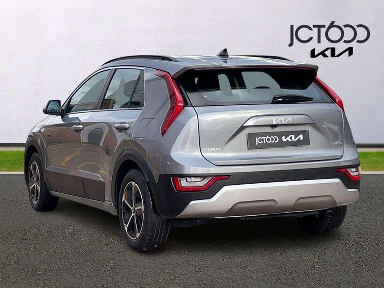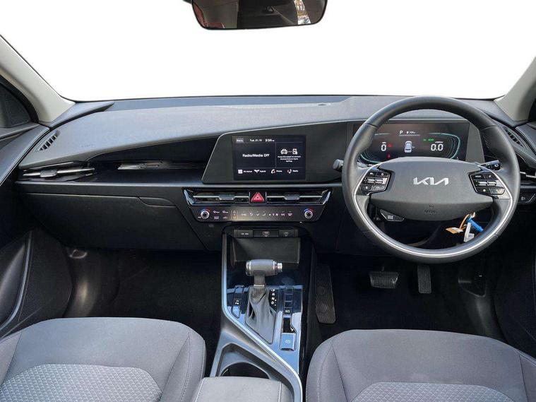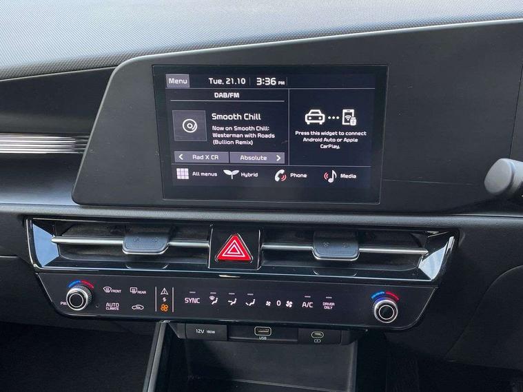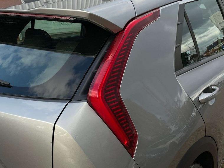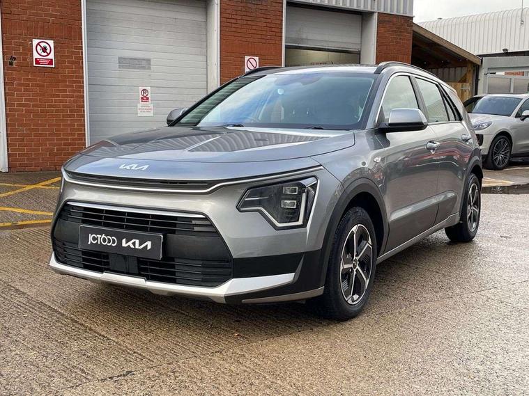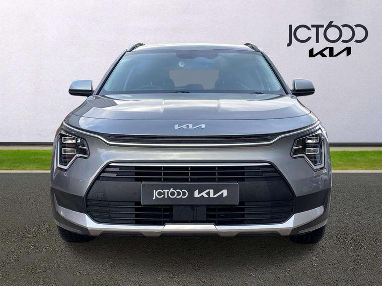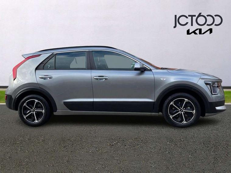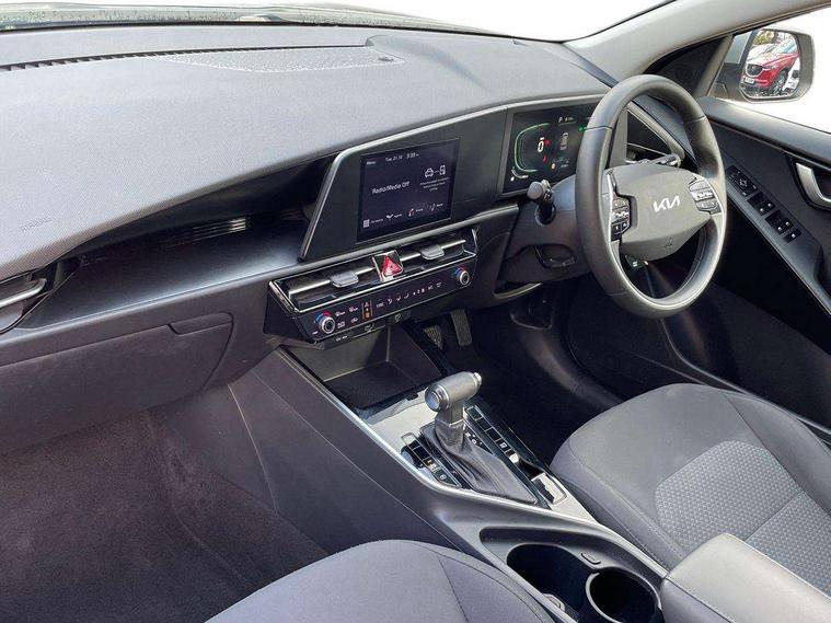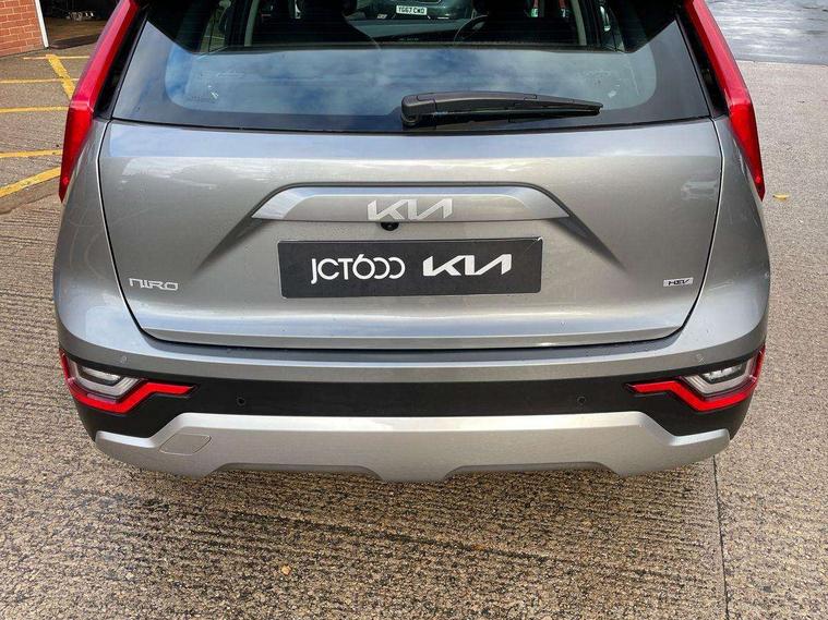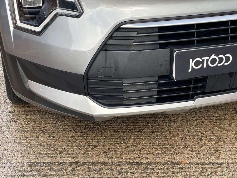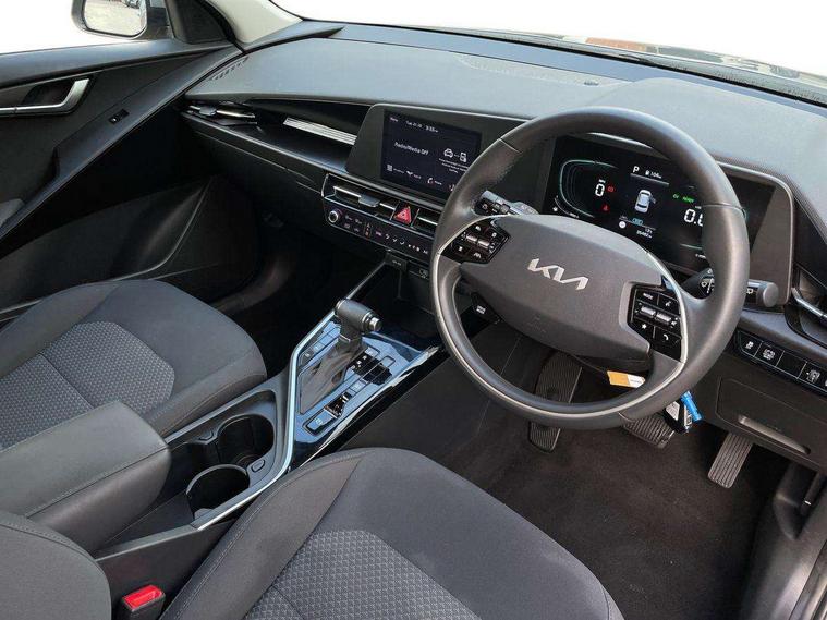 4.2" supervision colour cluster display, 8" touch screen, Adaptive smart cruise control function (SCC) with stop and go, Apple car play/Android Auto with voice control, Drive mode select (Eco, sport), E-call, Emergency stop signalling system, Forward Collision-Avoidance Assist (FCA) 1.5 - City/Pedestrian/Cyclist/Junction turning, Lane Following Assist (LFA), Lane keep assist, Motor driven power steering, Rear parking sensors, Reversing camera with dynamic guide lines, Speed limit assist, Tailgate, Trip computer with distance/fuel consumption/average speed, Sports H-Matic Automatic, 'Shark fin' mobile antenna, 2 type C USB ports on front seats, 2 USB ports in centre console including 1 type C, 6 speakers, Bluetooth with music streaming, DAB Digital radio, Steering wheel mounted controls, Acoustic windshield, All round electric windows with drivers auto up/down function, Auto dimming rear view mirror, Automatic defog system, Automatic headlight control system, Black beltline mouldings, Black embossed cladding, Body colour bumpers, Body colour door mirrors, Body colour exterior door handles, Dual LED headlights (low and high projection), Electric heated door mirrors, Front and rear silver skid plates, Heated rear window with timer, LED daytime running lights, LED rear combination lights, LED third brake light, Manual folding door mirrors, Rain sensor, Rear fog lights, Rear side wing doors, Rear spoiler, Rear wiper, Roof rails, Solar glass rear windows and tailgate, Solar glass windscreen, Welcome and follow-me home light functionality, Windscreen Washer Level Warning, 12v socket in front, 12V socket in luggage compartment, 3 seat bench in 2nd row, 60/40 split/folding 2nd row of seats, All-round height adjustable headrests, Artificial leather centre console storage box, Artificial leather steering wheel, Bulb type overhead console lamp with sunglasses case, Centre console cupholder, Cloth upholstery, Driver seat manual adjustment, Driver/passenger sunvisors with illuminated vanity mirrors, Dual zone automatic air conditioning, Front and rear door storage, H-Matic gear selection, Illuminated glovebox, Interior door lock/unlock function, ISOFIX Child seat top tethers and anchor fixings, Luggage area lamp, Luggage area load cover, Luggage board, Metal paint interior door handles, Passenger seat height adjuster, Rear armrest, Seatback pocket - driver, Single front passenger seat, Tilt/telescopic adjustable steering wheel, Towing pack - Niro, 3 point seatbelts on all seats, ABS, Automatic unlocking of doors in case of impact, Centre side front airbags, Curtain and side airbags, Drivers knee airbag, Dual shell horn, Electric parking brake with auto hold function, Electronic stability control, Front passenger airbag deactivation, Height adjustable front seatbelts, Hill start assist control (HAC), Manual rear child locks, Rear seat alert system, Traction control, Tyre pressure monitoring system, Alarm system and engine immobiliser, Deadlocks, Locking wheel nuts, Remote central door locking with fold away key, Visible vehicle identification number, Warranty - 7 Years/ 100, 000 miles, Graphite paint centre fascia, 16" alloy wheels, Tyre mobility kit,