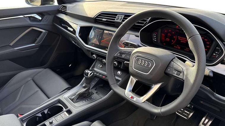 Amazon alexa Integration, Audi connect safety and service, Audi drive select, Audi lane departure warning, Audi Virtual Cockpit - 10.25" display, Bluetooth interface, Camera based traffic sign recognition, Distraction and Fatigue warning, Legal emergency call, MMI Navigation Plus with high resolution 10.1 inch touchscreen colour display, Power operated tailgate, Progressive steering, Service interval indicator, Smartphone interface includes wireless Apple carplay/Android Auto, Start stop system with recuperation, Voice control system with natural language interaction, Diesel particulate filter, Sports suspension, 2 USB-C ports with charge and data functions, 6 passive loudspeakers, DAB digital radio module, Acoustic windscreen, Anthracite black radiator grille, Audi Beam uses LEDs to project the Audi logo onto the ground as you exit your Q3, Auto dimming door mirrors, Auto dimming frameless rear view mirror, Black roof rails, Electrically folding, adjustable and heated door mirrors with integrated LED side indicators and kerb view function for passenger side, Front and rear electric windows, Front fog lights, Grille vertical bars in aluminium silver/Matt, High gloss black finish B and C pillars, LED Dynamic rear indicators, LED headlights with LED daytime running lights, LED rear lights, LED third brake light, Privacy glass dark tinted rear and rear-side windows (from B-pillar backwards), Rain and light sensors, Rear diffuser grille in grained matt black, Rear diffuser strip in matt anthracite black, Rear side wing doors, Rear wiper, S line bumpers in contrasting Manhattan grey, Variable front intermittent wipers, 12V socket in rear centre console, 3 seat bench in 2nd row, 40:20:40 folding with manual adjustment for 60:40 forwards/backwards position and backrest angle, Adjustable rear seat bench/backrest with centre armrest and cupholder, Black carpet mats, Black cloth headlining, Dual zone electronic climate control, Electric lumbar support, Front and rear black floor mats with contrast stitching in rock grey, Front and rear headrests, Front centre armrest, Height and reach adjustable steering wheel, Illuminated door sill trims with S logo, ISOFIX child seat mounting for front passenger with airbag deactivation and outer rear seat including top tether attachment point for outer rear seats, Luggage compartment sill protection in stainless steel, Manual front seats with height adjustment, Perforated leather gearknob, Single front passenger seat, Stainless steel pedals, Twin leather upholstery with front sport seats + S embossing, Black styling pack - Q3, Non smoking pack - Q3, 3x3 point rear seatbelts, 6 airbags - Driver, front passenger, curtain and side windows, Audi pre-sense front with pedestrain and cyclist recognition, Electrically operated child locks on rear doors, Electromechanical parking brake, Electronic stabilisation control including ABS, ASR and EDL, Front seatbelt reminder, Hill descent control, Hill hold assist, Pre sense basic, Seatbelt monitoring, Tyre pressure warning, Warning triangle and first aid kit, Anti theft wheel bolts, Immobiliser, Remote central locking, Thatcham approved category 1 anti theft alarm, Aluminium look interior elements, Detail dashboard around MMI touch colour display in glass look, black with surround in aluminium look, Leatherette door armrest, Piano black inlay,