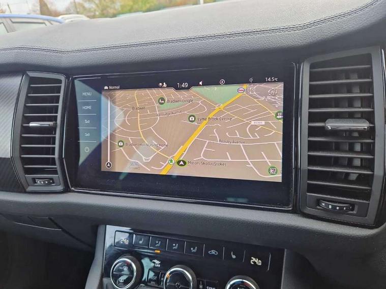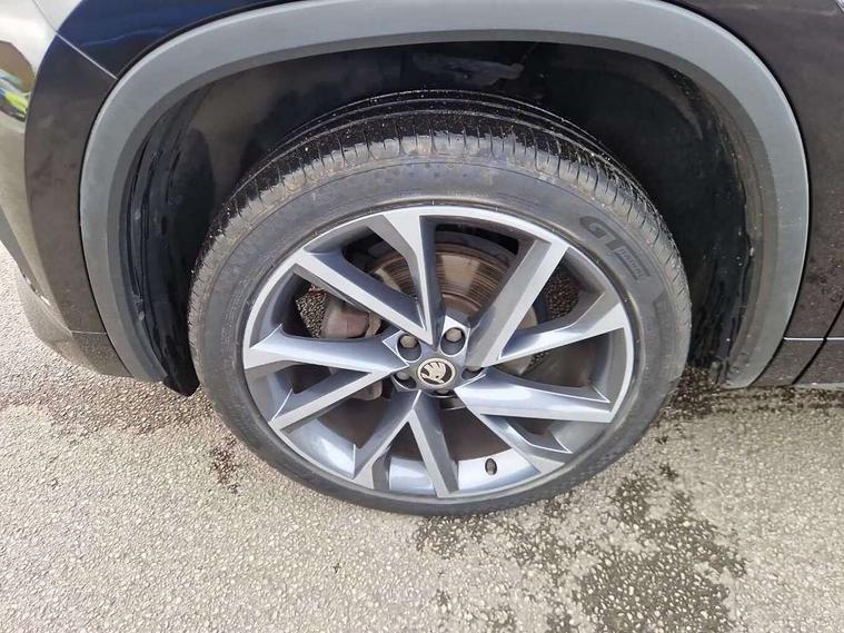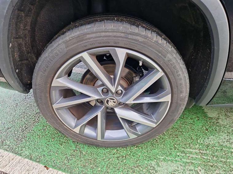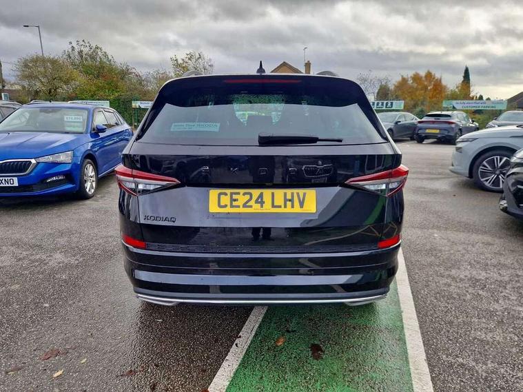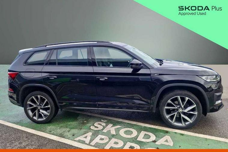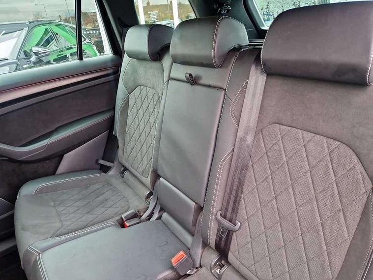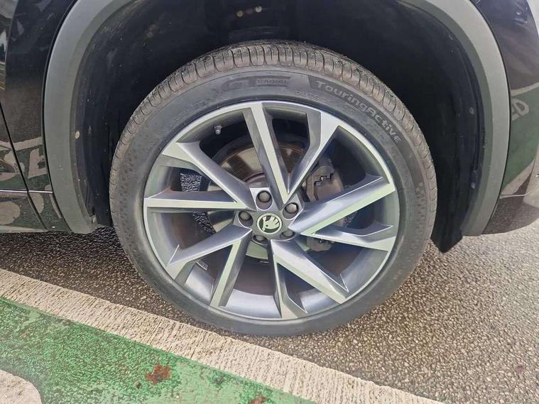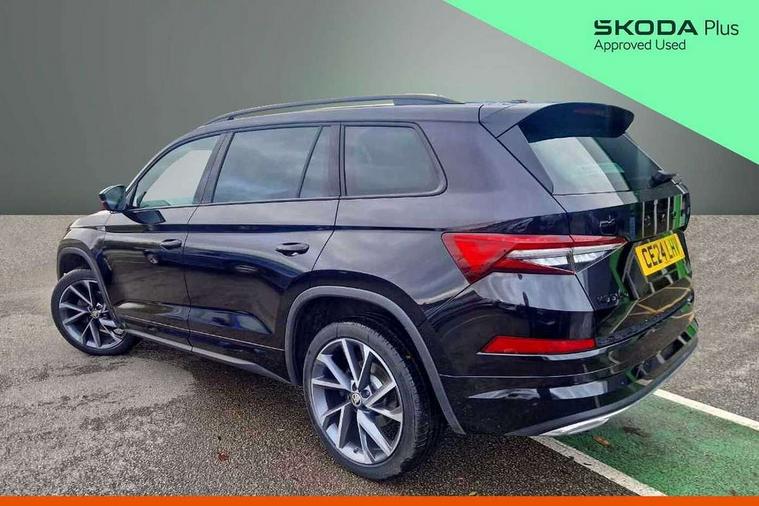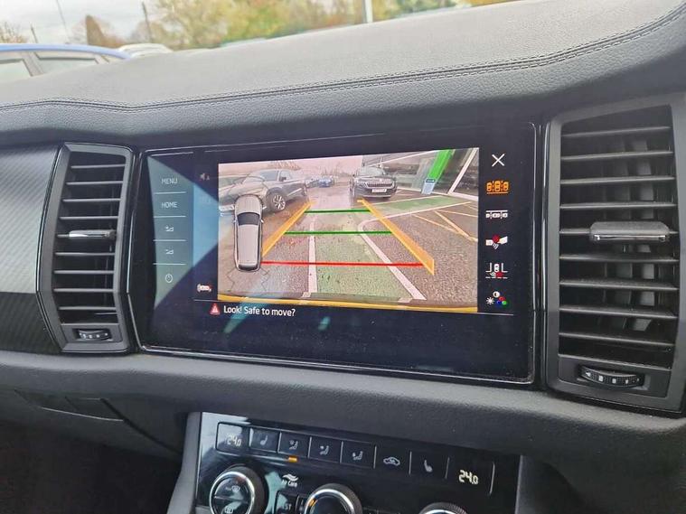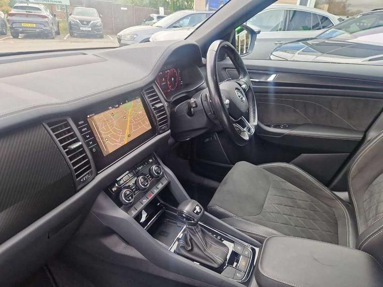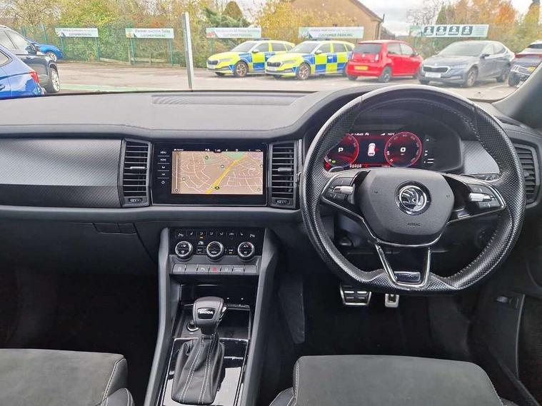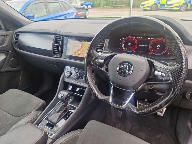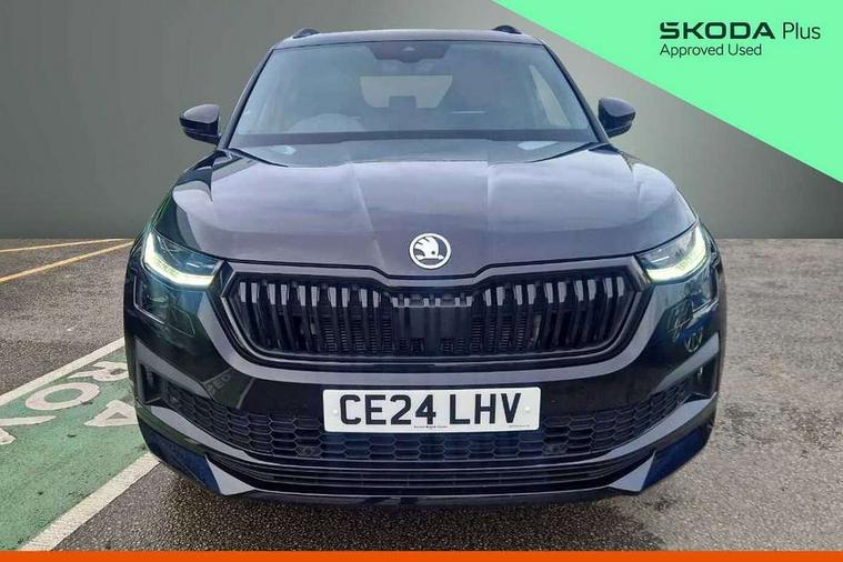 Bluetooth system, Columbus satellite navigation with 9.2" touchscreen, integrated Wi-Fi, web radio, Digital voice enhancement, e call+, ECO Stop/start function, Exterior temperature indicator, Progressive steering, Rear view camera, Smartlink wireless for apple carplay and wired for android auto, Speed limiter, Tailgate unlocking from outside, USB C Port x 2 in front centre console, Virtual Cockpit - 10.25" digital display with additional sports design, Wireless charging, 8 Speakers, DAB Digital radio, Aero front windscreen wipers with intermittent function, Aero rear window wiper, Auto dimming rear view mirror, Black roof rails, Black sports styling including front grille and window surrounds, Black wheel arch surrounds, Body colour bumpers, Body colour door handles, Electric adjustable/heated/folding door mirrors, driver side auto dimming with boarding sports and memory function, Electric front and rear windows, Extended rear spoiler with finlets in gloss black, Front fog lights, Full LED matrix headlights with AFS (adaptive front light system), cornering function and AWL (all weather lighting system), Gloss black door mirrors, Headlight washers, Heated rear window, Invisible tailpipe, LED daytime running lights, LED rear fog light, LED third brake light in rear spoiler, Light assistant (coming/leaving home/tunnel light), Off-road style lower front bumper element, Privacy glass, Rain and light sensors, Rear diffuser, Rear LED lights (high functionality) with welcome effect and dynamic indicators, Rear side wing doors, Safety reflectors on front and rear doors, Sportline badge on front fender, Sports front and rear bumpers including lower rear chrome strip, Tailgate lettering in Black, Window control switches with black trim, 12V socket in boot, 2 rails with 2 hooks, 2 seat bench in 3rd row, 3 seat bench in 2nd row, 3 spoke leather multifunction sports steering wheel with DSG paddles, 4 foldable roof handles with rear coat hooks, 60:40 foldable rear seat with sliding adjustment and backrest angle adjustment, Aluminium pedals, Black roof headlining, Bottle holders in door panel in the 1.5 litre front and 1 litre rear, Cargo storage compartments, Chrome headlight control button, Chrome interior door handles, Coat hooks on B pillar, Covered storage compartment on driver side, Decorative door sill covers, Front and rear door armrest with black adductor trim, Front centre armrest with storage compartment, cup holder and 12V socket, Front courtesy lights, Gear shift lever with chrome frame and black gloss insert, Grey stitching in front and rear armrests and door armrests + door inserts, Height adjustable front headrests, Illuminated glovebox, Illuminated luggage compartment, Isofix child seat fittings in outer rear seats with top tether, Manually adjustable steering column, Microsuede door panels, Net programme in boot (1x horizontal Net, 2x vertical Nets), Overhead glasses storage compartment, Pollen filter, Rear centre armrest with cupholders, Single front passenger seat, Sliding trunk cover, Small Bags on the inner sides of the front backrests, Sports seats, Sunvisors with illuminated vanity mirrors, Three rear height adjustable headrests, Ticket holder on A Pillar, Umbrella in door panel, Variable boot floor, LED Interior light pack - Kodiaq, Auto door release and activation of warning lights in the event of an accident, Driver and front passenger airbag with knee airbag and front passenger airbag deactivation, Electronic parking brake with hill start assist, Emergency rear braking signal, ESC (incl. ABS+MSR+ASR+EDS+HBA+DSR+RBS+MKB), Front assist with autonomous emergency braking, Front side airbags with curtain airbags, Fuel cut off safety device, Height adjustable front 3 point seatbelts + pretensioners, Hill hold control, Rear disc brakes, Safety vest holder in door, Seat belt reminder for all seats, Three point rear seat belts, Two tone horn, Tyre pressure monitor, Alarm with interior monitoring and tilt sensor with safe function, Anti-theft wheel bolts, Immobiliser, Keyless entry and start system (KESSY), Remote central locking with 2 keys, Black air vent surround, Carbon finish dashboard and door inserts, Grey stitching in dashboard, 20" Vega Anthracite alloy wheels, Temporary spare wheel (space saver),