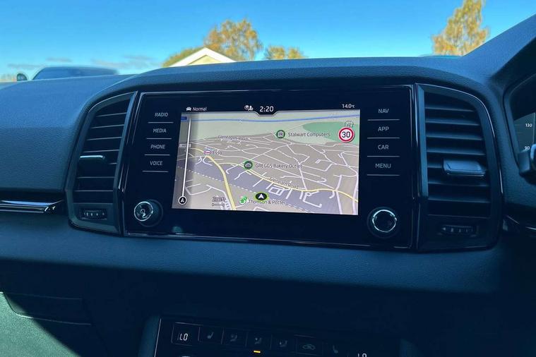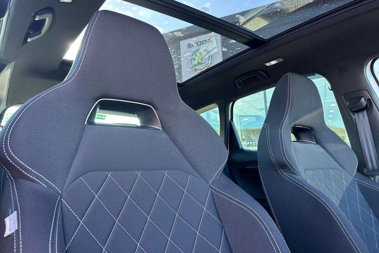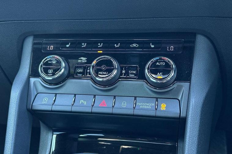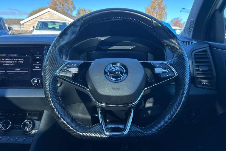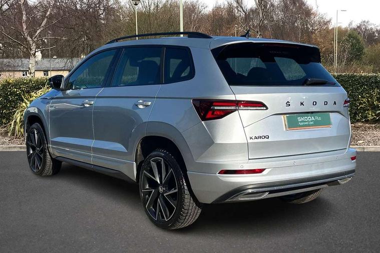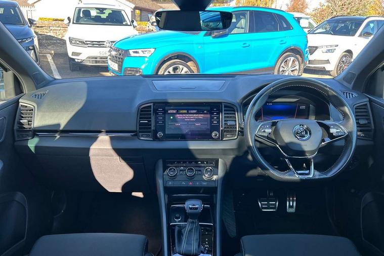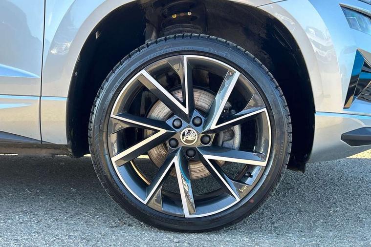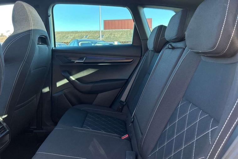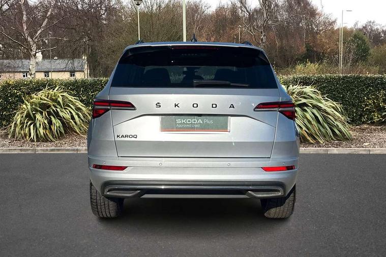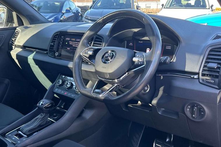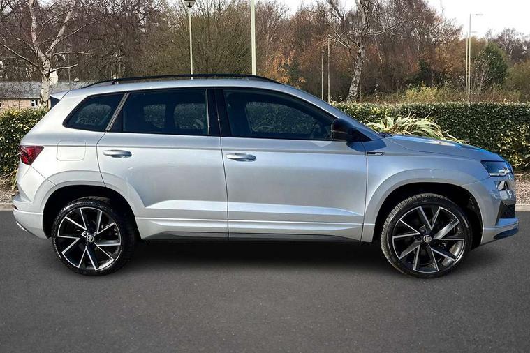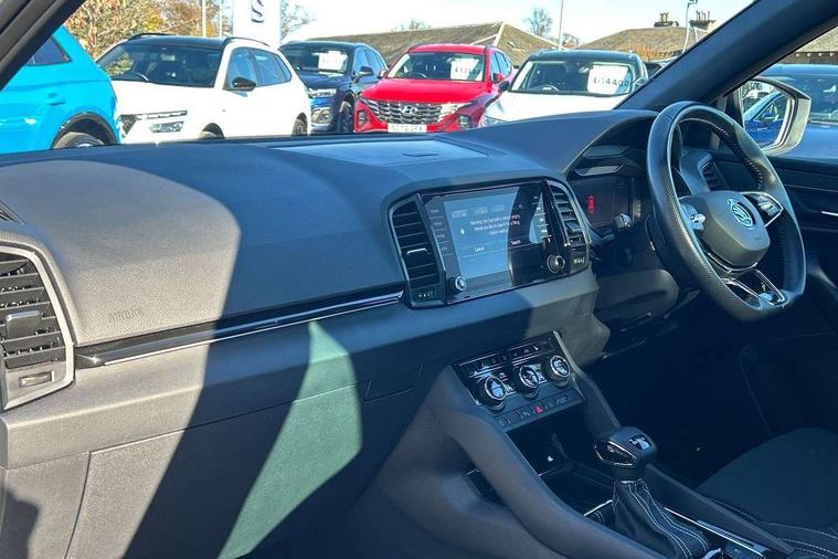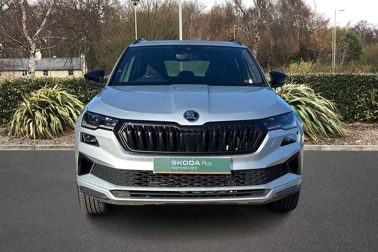 8" Digital display, Care connect, Driver fatigue sensor, Emergency services call system, Outside temperature gauge, Service interval indicator, SmartLink wireless for Apple and wired for Android, Start/stop system with regenerative braking, USB C Port x 2 in front centre console, Virtual cockpit, Virtual pedal with electrically operated boot door, 8 Speakers, DAB radio with Bluetooth, USB connection, Wireless charging without wireless aerial connection, Acoustic glass, Aero front windscreen wipers with intermittent function, Auto dimming rear view mirror with light and rain sensors, Black door mirrors, Black electric window control buttons, Black radiator grille, Black roof rails, Body colour door handles, Dynamic headlight range control with cornering light function, Electric front and rear windows with child proof lock, Front door steps with SportLine logo, Heated rear windscreen, LED daytime running lights, LED rear lights with high functionality welcome effect and dynamic indicators, Light assistant (coming/leaving home/tunnel light), Panoramic sliding sunroof, Plastic scuff plates, Privacy glass, Protective door side sills in body colour, Rear diffuser, Rear side wing doors, Rear spoiler, Rear window wiper with washer system and intermittent control, Safety reflectors on front doors, Skoda lettering on tailgate in black, Sportline badge on front fender, Sportline decorative inserts with badging, Sports front and rear bumpers, 1.5 litre bottle holders in driver and front passenger door panels, 12V socket in boot, 12v socket in front centre armrest with storage compartment and rear air vents, 3 rear height adjustable headrests, 3 seat bench in 2nd row, 3 spoke leather sports multifunction steering wheel and silver stitching with gear shift paddles, 4 foldable roof handles with rear coat hooks, Black floor carpet, Black roof headlining, Chrome inner door handles, Double sided boot floor, Foldable hooks in the boot, Front head restraints, Height adjustable front three point seats belts with tensioners, Height/reach adjust steering wheel, Ice scraper, Illuminated glovebox, Illuminated luggage compartment, Isofix child seat preparation outer rear, Manual lumbar support for front seats, Pen holder, Pollen filter, Rear boot cover, Rear reading lights, Rear seats fixed folding and divided 60:40, Rubbish bin door, Safety vest holder, Single front passenger seat, Storage box in upper central dashboard closed, Sunvisors with illuminated vanity mirrors, Textile floor mats, Ticket holder, Titan black interior ceiling, Welcome animation with sportline logo, Boot pack - Karoq, Light Pack - Karoq, Parking pack - Karoq, Automatic door unlocking in case of crash, Automatic fuel cut off in case of crash, Child locks on rear doors, Driver airbag, Electronic parking brake with auto hold function, Emergency rear braking signal, ESC including ABS, MSR, ASR, EDS, HBA, DSR, RBS, MKB and traction control, Front side airbags, Hill hold control, Knee airbags, Passenger airbag with switch-off function, Pedestrian monitor, Seatbelt reminder signalisation and pretensioner for all seats, Three point seatbelts rear, Two tone horn, Tyre pressure display, Tyre pressure monitor, Alarm with interior monitoring, back up horn and tilt sensor with safe function, Electronic engine immobiliser, Keyless entry and start/stop, Remote central locking with 2 remote folding keys, Black air vent surround, Black centre console, Satin black dashboard, Satin black door trim, 19" Vega black polished alloy wheels, Anti-theft wheel bolts protection, Matt black aero hub caps, Storage on wheel cover, Tool kit,