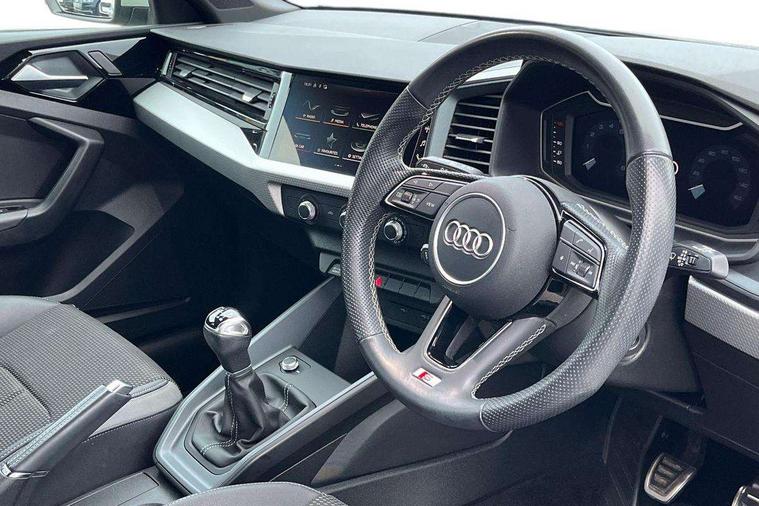 10.25" Digital instrument cluster display classis style instrument dials + speed, odometer, time, outside temperature, telephone menu + fuel level warning, Audi drive select - power steering assistance + engine, Audi smartphone interface with connect compatible smartphone via USB directly MMI display + Nav, music, third party apps controlled via MMI controller, Automatic start/stop system, Bluetooth interface, Cruise control, Driver's information system, Electromechanical power steering, Emergency e-call, Emergency services call system, Lane departure warning system, Service interval indicator, Speed limiter, Voice control system, Washer fluid level indicator, Sports suspension, 1 x SDXC card reader, 2 x USB type C connection points, DAB Digital radio, MMI radio plus with 8.8" colour MMI display screen and MMI touch, Auto dimming rear view mirror, Body coloured door mirrors, Door sills with aluminium inlays and S Line logo, Electric front and rear windows, Electrically adjustable, heated, folding door mirrors with integrated LED side indicator, Front side air inlets in grained matt black and C frame in anthracite black, Heat insulating glass windscreen and side windows, Heated rear windscreen, High level LED brake light, LED headlights with LED rear lights + dynamic rear indicators + headlight adjustment and high beam, turning light + LED daytime running lights, Radiator grille and rear diffuser in matt anthracite black, Radiator protective grille frame in matt aluminium silver, Rain and light sensors, Rear fog lights, Rear side wing doors, Rear wing door, Rear wiper, S line badges on front wings, Side front spoiler lips in grained matt black, 12V socket in centre console with two cup holders, 3 rear seats with headrests, 3 seat bench in 2nd row, 3 spoke leather multi-function plus steering wheel features S badging and grips in perforated leather with contrast stitching, 40:60 Split folding rear seat or folded fully, Black cloth headlining, Driver and passenger seat with manual height adjust with forward and backwards adjustment, Front and rear black floor mats with contrast stitching in fine silver, Front head restraints, Front passenger seat, Height and reach adjustable steering wheel, ISOFIX child seat mounting for front passenger and outer rear seats including top tether attachment point of outer rear seats, Leather gear knob with aluminium trim, Luggage compartment light with front and rear reading lights, Manually adjustable lumbar support in front seats, Stainless steel pedals, LED interior lighting pack - A1, Luggage compartment pack - A1, S line exterior styling pack - A1 Sportback, 3x3 point rear seatbelts, Audi pre-sense front with pedestrain and cyclist recognition, Brake assist function, Driver and front passenger airbag with front side and head airbags, Electronic Stability Control including ABS, EBD, ASR and EDL, Front passenger airbag deactivation switch, Hill hold assist, Manual rear child locks, Seatbelt height adjustment for front seats, Seatbelt monitoring, Tyre pressure warning light, Warning triangle and first aid kit, Anti theft alarm, Anti theft wheel bolts and loose wheel warning, Immobiliser, Remote central locking with 2 foldaway keys, Aluminium trim for control switches, air vents and digital instrument cluster, Silver grey inlays polygon structure in diamond paint finish, Structured grey accent areas including air vents, door handle recesses and centre console in quartz paint finish,