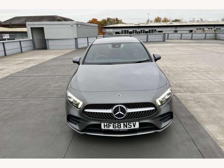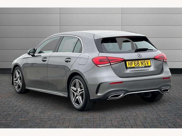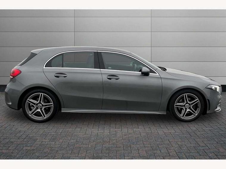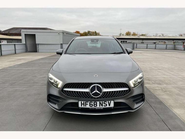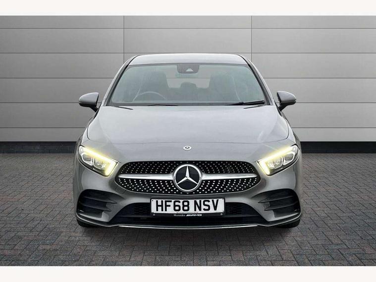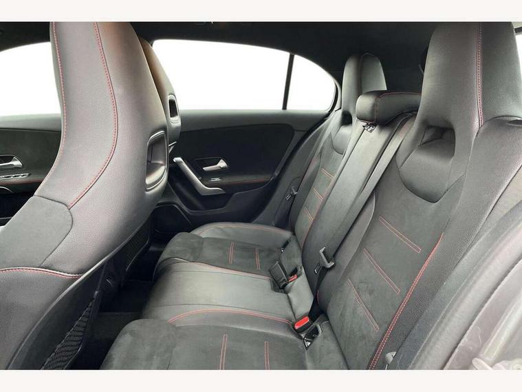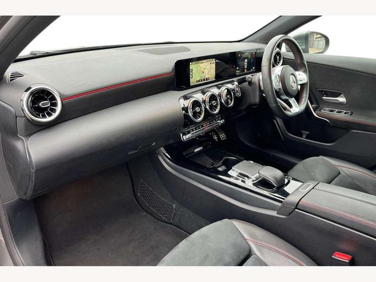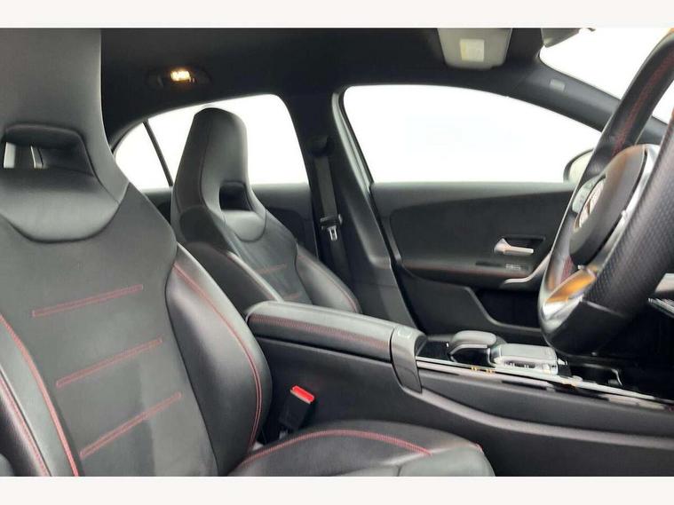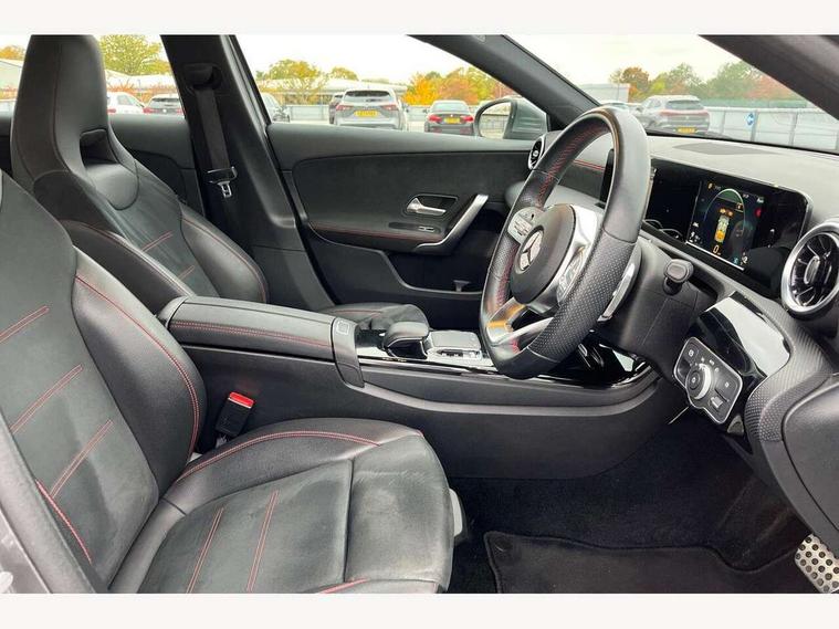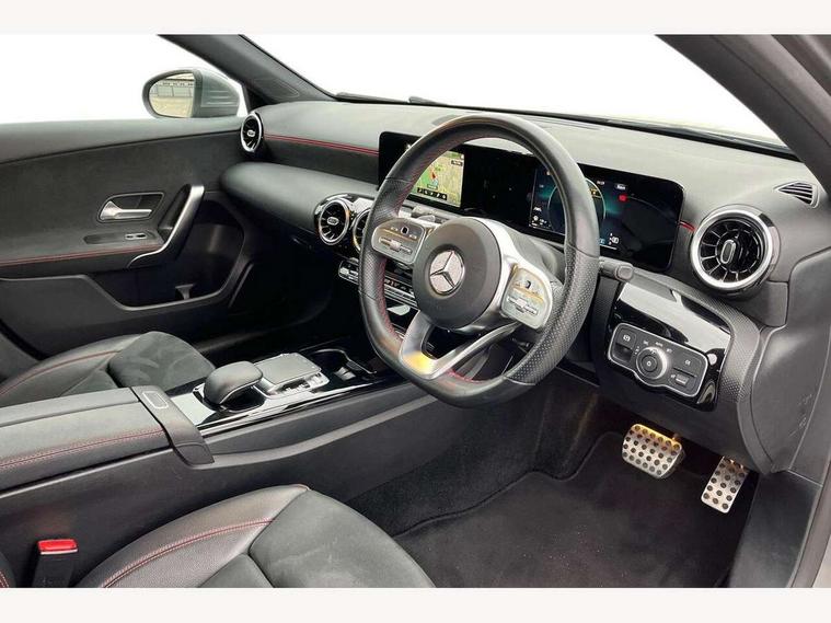 180 degree rear view camera with parking guidelines, 7" colour screen in instrument panel, 7" touchscreen media display, Active lane keep assist, Attention assist, Brake pad wear indicator warning light, Cruise control + speed limiter, Direct steering, Direction indicators with lane change function, DYNAMIC SELECT with a choice of driving modes (ECO, Comfort, Sport, Sport+ and Individual), Fluid level warning indicator for fuel, oil, coolant and washer fluid, Hard-disk navigation, Lamp failure indicator, Mercedes me connect including emergency call system, accident recovery, breakdown and maintenance management, Outside temperature gauge, Radio aerial integrated into roof spoiler, Service indicator (ASSYST), Speed sensitive power steering, Stop/start system, Trip computer, Voice activation, Lowered sports suspension, DAB Digital radio, Dual bluetooth interface, 2 USB ports (type C), MBUX multimedia system with DAB digital radio and touchpad including satellite navigation, Adaptive brake lights, AMG front, rear apron and side skirts, Body colour bumpers, Body colour door handles, Body colour side skirt, Body coloured door mirrors, Chrome beltline trim, Diamond radiator grille with chrome pins and silver louvre + chrome insert, Electric adjustable and heated door mirrors with integrated LED side indicators, Electric front windows, Electric rear windows, Exhaust system - Twin trapezoidal tailpipes in polished stainless steel, Headlamp assist automatic headlamp activation, Heated glass rear windscreen + timer control, LED high performance headlamps with integrated LED daytime running lights, LED tail lamp, LED third brake light, Rain sensor windscreen wipers, Rear fog lights, Rear wiper, 1/3 to 2/3 split folding rear seats, 12V socket, 3 Spoke flat bottom leather multi function steering wheel with perforated leather in grip area, Air vents surround and cruciform nozzle in silver chrome, AMG floor mats with red stitching, Artico man-made leather/Microfibre Dinamica upholstery with red contrast stitching, Auto Mercedes-Benz child seat recognition sensor, Black roof lining, Brushed stainless steel sports pedals with rubber studs, Controller on centre console with chrome surround, Cup holder and stowage compartment lighting, Exit lights, Front centre armrest with storage compartment, Front door sills with Mercedes Benz lettering, Front doors with ambient and signal light, Front footwell lights, Front reading lamps, Front seat backs luggage nets, Front seat cushion length adjustment, Front signal exit lamp, Front vanity lights, Gearshift paddles on steering wheel, Handle recess/closing light, Height/reach adjustable steering column, Illuminated glovebox, ISOFIX Child seat top tethers and anchor fixings, Load securing rings in luggage compartment, Luggage compartment cover, Manual height adjustable front seats, Oddments tray lighting, Rear head restraints, Rear Reading Lamps, Seat occupancy sensor for front passenger seat, Sports seats with integrated headrests, Storage compartment under load area floor, Sunvisors with illuminated vanity mirrors, Touchpad, Touchpad illumination, Twin front cupholders, Two zone thermotronic luxury automatic climate control, Seat comfort pack - A Class, 3 rear 3 point seatbelts, ABS with Brake Assist, Active bonnet, Active brake assist includes forward collision warning system with autonomous braking, Adaptive brake assist with hold function and hill start assist, Brake calipers with Mercedes-Benz lettering + perforated brake discs, Childproof locks manually operated for rear doors and electrically operated for rear power windows, Crash responsive emergency lighting, Driver and passenger head and side airbags, Drivers knee airbag, Dual stage driver/passenger airbags, Electronic parking brake, ESP curve dynamic assist, ESP with ASR, Front and rear seatbelt reminder, Tyre pressure monitoring system, Warning triangle and first aid kit, Window airbags, Alarm system/interior protection/immobiliser, Keyless Go, Remote central locking and crash sensor with emergency opening function, Chrome air vent surrounds, 18" AMG 5 twin spoke light alloy wheels in titanium grey with highsheen finish, Tirefit sealant kit,