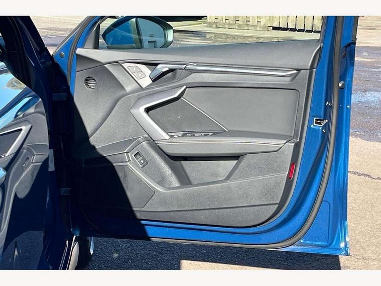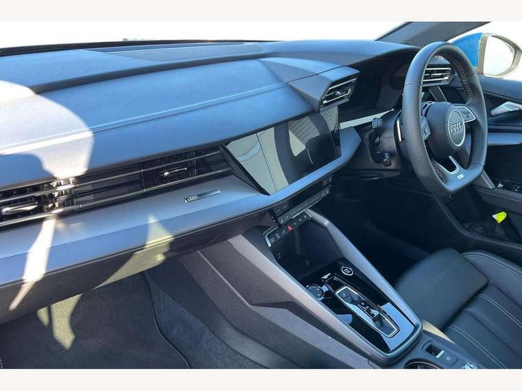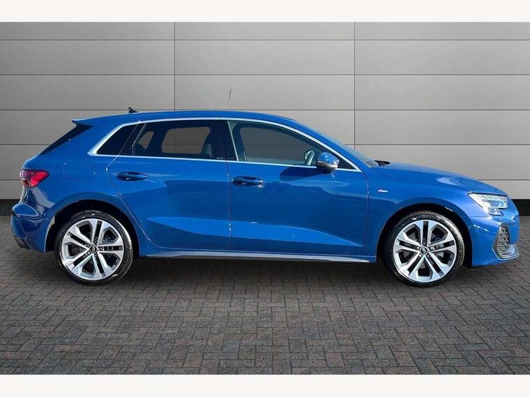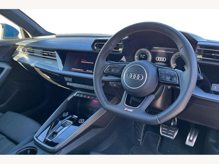 Adjustable speed limiter, Audi drive select, Audi smartphone interface with app store includes wireless Apple carplay, Android auto and Amazon alexa integration, Audi virtual cockpit plus - 12.3" full HD resolution dynamic digital instrument cluster, Automatic start/stop system with recuperation, Bluetooth interface, Camera based traffic sign recognition, Collision avoidance assistant, Cruise control, Distraction and Fatigue warning, e-Call (emergency call), Electromechanical power speed sensitive steering, Lane departure warning system, MMI Navigation Plus with high resolution 10.1" colour touch screen display, Park Assist with parking system Plus, Service indicator, Trip computer, Voice control system with natural language interaction, 3 pin 10 amp domestic charging cable, CCS socket for DC charging, Charging cable for public charging, mode 3 (type 2), up to 22 kW (AC), Compact charging system, Industrial connector CEE 32 A, 230 V, length 1.6 m, Standard suspension, Type 2 socket for AC charging, Audi Phonebox light with wireless charging, Audi sound system - 10 loudspeakers including centre loudspeaker and subwoofer, DAB Digital radio, USB ports with charging function in the rear, Acoustic glass windscreen, Aluminium window trim, Auto dimming frameless rear view mirror, Body colour exterior mirrors, Chrome exhaust tailpipes, Electrically adjustable/heated/folding/auto dimming door mirrors with integrated LED indications + kerb view function for passenger side, Exterior model badging, Front and rear side air inlets in grained matt black with dark liquid chrome frame, Front electric windows, Front radiator grill in high gloss dark chrome, Heat insulating glass windscreen, Illuminated door sills with aluminium inserts at the front with S logo, LED 3rd brake light, LED daytime running lights, LED headlights with LED rear lights and dynamic rear indicators, Light and rain sensors, Privacy glass - dark tinted rear window, rear door and side windows, Rear diffuser and grill in grained matt black with inlay in dark liquid chrome, Rear electric windows, Rear side wing doors, Rear wiper, S line bumpers, S roof spoiler, Side S line emblems on front wings, Side sill trim in dark liquid chrome, 12V socket and storage compartment in front centre console, 3 seat bench in 2nd row, 3 spoke flat bottomed leather multifunction sport steering wheel with gear shift paddles, 3-zone deluxe automatic air conditioning, 4 way electrically adjustable lumbar support for driver and front passenger, 40/20/40 split folding rear seat bench, Black cloth headlining, Convenience auxiliary air conditioning, Front and rear centre armrest in artificial leather, Front and rear centre armrest in artificial leather with contrasting stitching on armrests and instrument panel, Front and rear headrests, Front/rear floor mats, Heated front seats, Height and reach adjustable steering wheel, Manual boot compartment lid, Manually adjustable front seats, Rear cup holders, S badging on the steering wheel, Seat side bolsters, Single front passenger seat, Stainless steel pedals and front footrest in black, Twin leather upholstery with front sports seats S embossed logo, Aluminium interior elements pack - A3 Sportback, Multi-coloured LED interior lighting package - A3, 3x3 point rear seat belts, Acoustic vehicle alerting system, Driver and front passenger airbag with passenger airbag deactivation, Electronic Stabilisation Control (ESC) including ABS, ASR and EDL, First aid kit with warning triangle and 2 safety vests, Front side airbags with head airbags and interaction airbag, Hill hold assist, Pre-sense front with pedestrian and cyclist detection, Seatbelt monitoring, Tyre pressure loss indicator, Anti theft alarm, Anti-theft wheel bolts, Electronically operated child locks, Immobiliser, Remote central locking with safelock, Dash & door Inlay in dark aluminium Spectrum, Tyre repair kit,