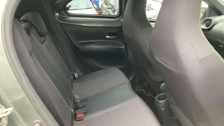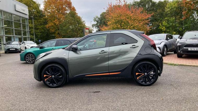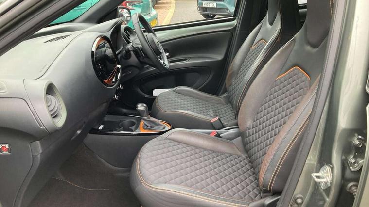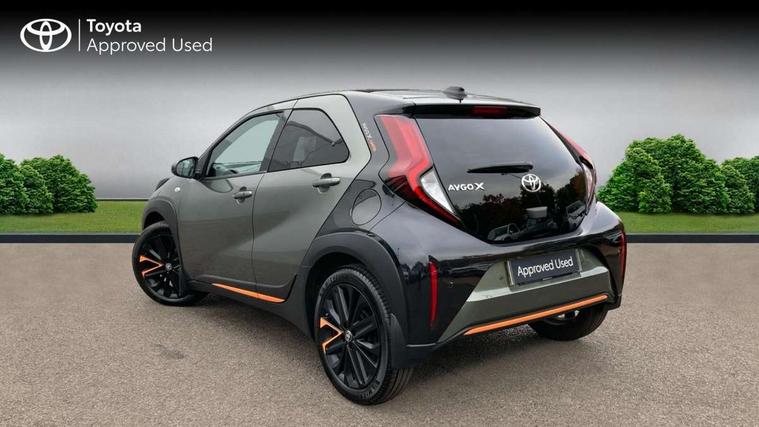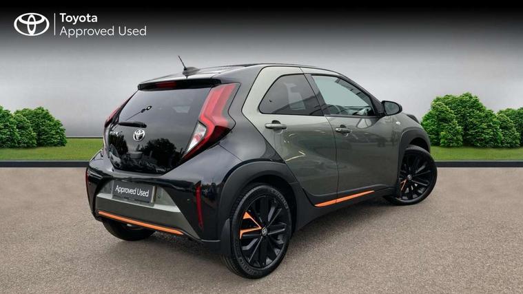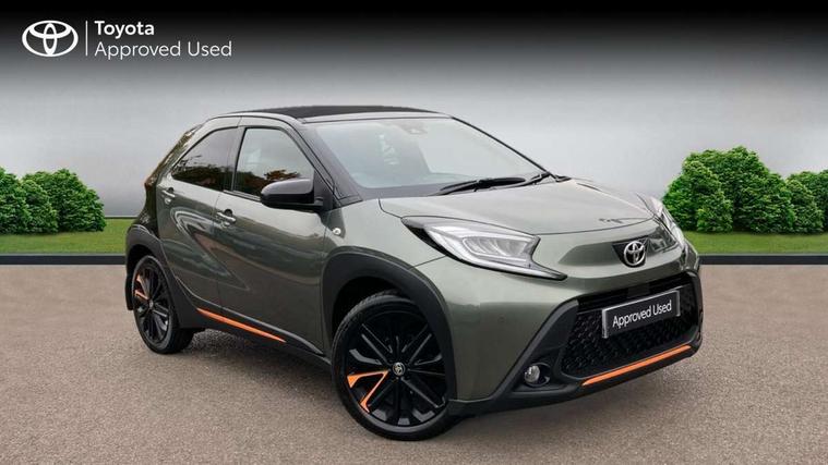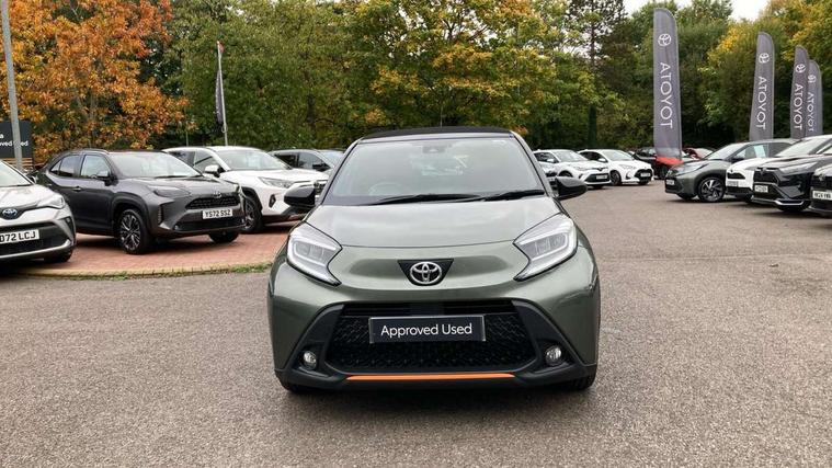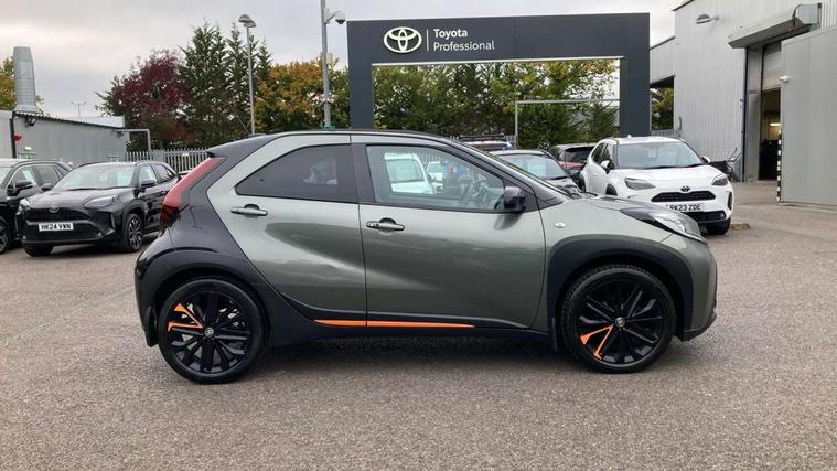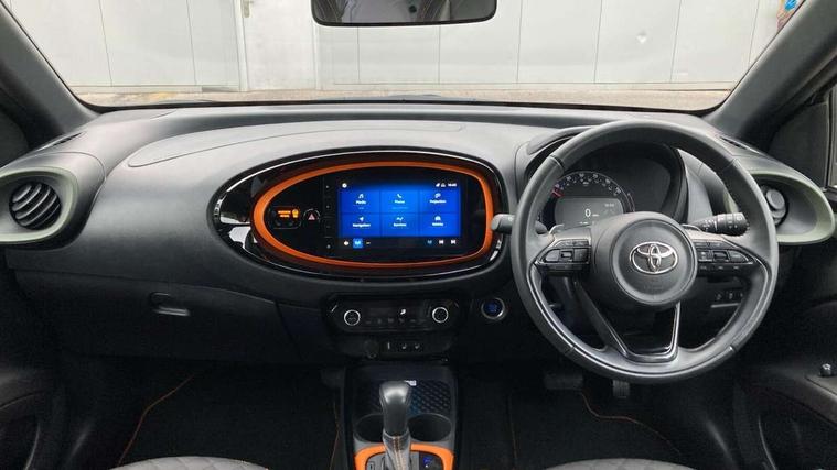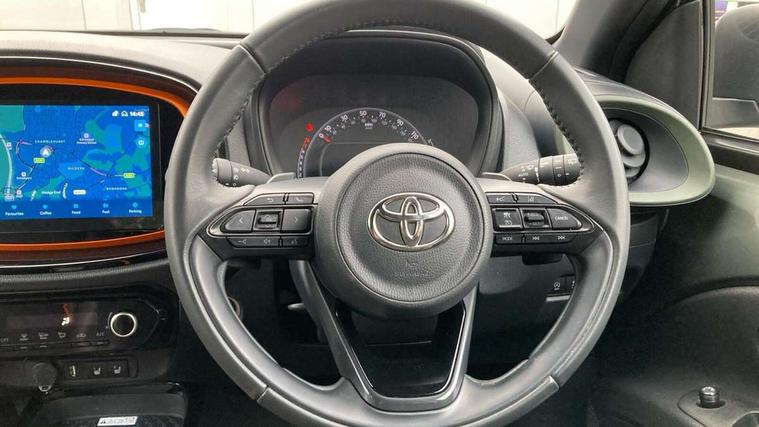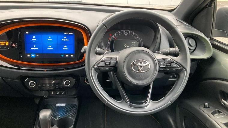 4.2" TFT colour screen, Adjustable speed limiter, Analogue speedometer, Bluetooth connectivity, Digital tachograph, Driver attention alert system, eCall emergency call system, ECO-driving indicator, Electric power steering, Front and rear parking sensors with auto brake, Intersection turn assist, Key reminder warning, Noise reduction kit, Pre collision system with emergency steering assist, Remote boot door release on key, Reversing camera with static guide lines, Smart entry and push button start, Speed limit display, Start and stop, Wireless charger, Wireless Smartphone Integration includes Apple CarPlay and Android auto, Vehicle Stability Control (VSC), 4 speakers, 9" HD multimedia display touch screen with Toyota smart connect, DAB digital audio broadcast, USB connector, Auto headlights, Auto wipers, Automatic headlights cut-off, Automatic high beam On/Off switch, Bicycle towing hook, Black fog light surrounds, Black side protection mouldings, Black wheel arch mouldings, Body colour door handles, Body coloured front bumper, Boot door scuff plate, Canvas roof, Eclipse black rear bumper, Electric heated door mirrors, Follow me home headlights, Front fog lights, Front power windows, Gloss black door mirrors, Gloss black upper front grille, Headlight cut-off reminder, LED daytime running lights guide, LED front light guide, LED High mounted stop lamp, LED projector headlights, Limited edition logo on C pillar, Magnolia strip on lower front and rear bumpers, Manual day/night rear view mirror, Manual headlight levelling, Metallic Bi-tone paint, Power adjustable door mirrors, Privacy glass, Rain sensor, Rear combination lights LED bulb type, Rear side wing doors, Rear windscreen defogger, Rear windscreen wiper, Remote hazard lights system, Short antenna, Variable intermittent windscreen wipers, 12v power outlet - front, 2 seat bench in 2nd row, 3 spoke leather steering wheel, 50/50 split folding rear seat, Adjustable speed limiter switch on steering wheel, Audio and telephone switches on steering wheel, Auto air conditioning, Black insert on steering wheel, Black roof lining, Boot light, Canvas top headlining, Centre room light, Chrome interior door handles, Chrome surround on air conditioning buttons, Clean air filter, Driver and front passenger heated seats, Floor mats, Front and rear cup holders, Front head rest deco art, Front head restraints, Gear shift indicator, Height adjustable driver seat, Intelligent adaptive cruise control switch on steering wheel, ISOFIX child restraint system on rear seats, Lane departure alert switch on steering wheel, Leather gearshift knob, Light blue ambient lighting in centre console, Manual tilt steering wheel, Manually reclining and sliding driver seat, Manually reclining and sliding front passenger seat, Multimedia switches on steering wheel, Paddle shift levers on steering wheel, Partial leather seats, Pollen filter, Rear door pockets, Rear head restraints, Remote air-conditioning system, Satin silver insert on gear shift knob, Single compartment glovebox with lights, Single front passenger seat, Soft tonneau cover, Sun visors with mirror on driver and passenger side, Voice recognition switch on steering wheel, Toyota safety sense pack - Aygo X, Anti lock braking system + Electronic brake force distribution, Child safety door lock, Emergency brake light signal (EBS), Hill start assist control (HAC), Passenger airbag on/off switch, Seat belt reminder for front and rear seats, Supplement restraints system (SRS) - 6 airbags, Traction control, Tyre pressure warning system, Immobiliser, Remote power door locks, Black wheel centre caps, Mandarina Orange wheel insert, Tyre repair kit,