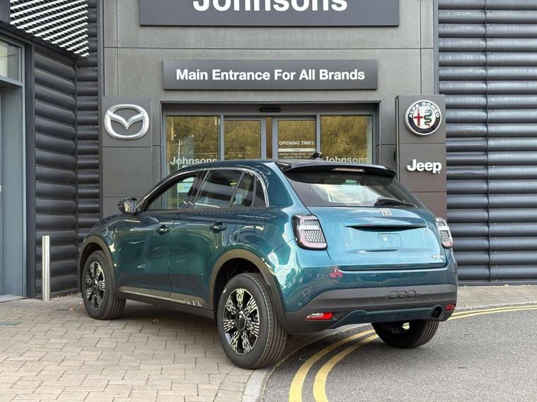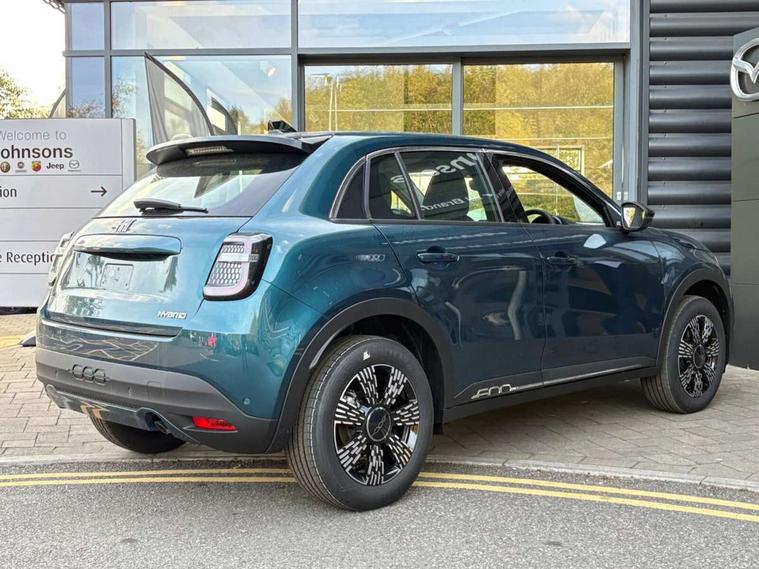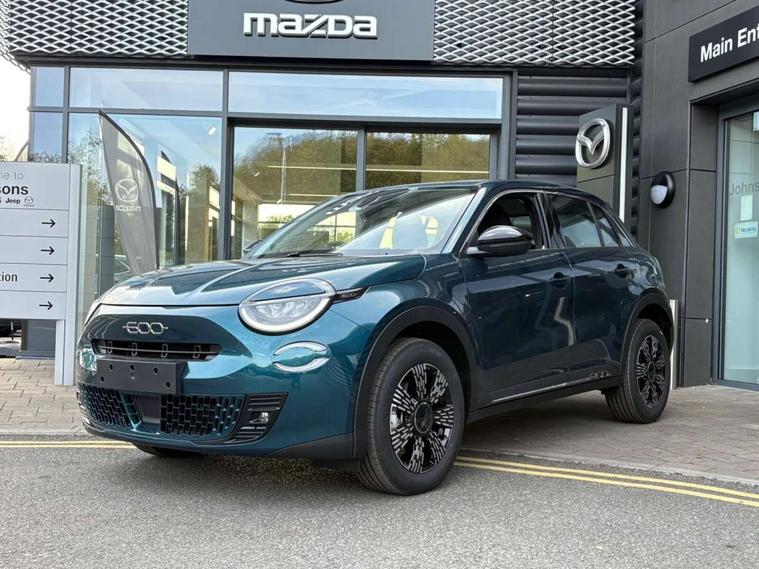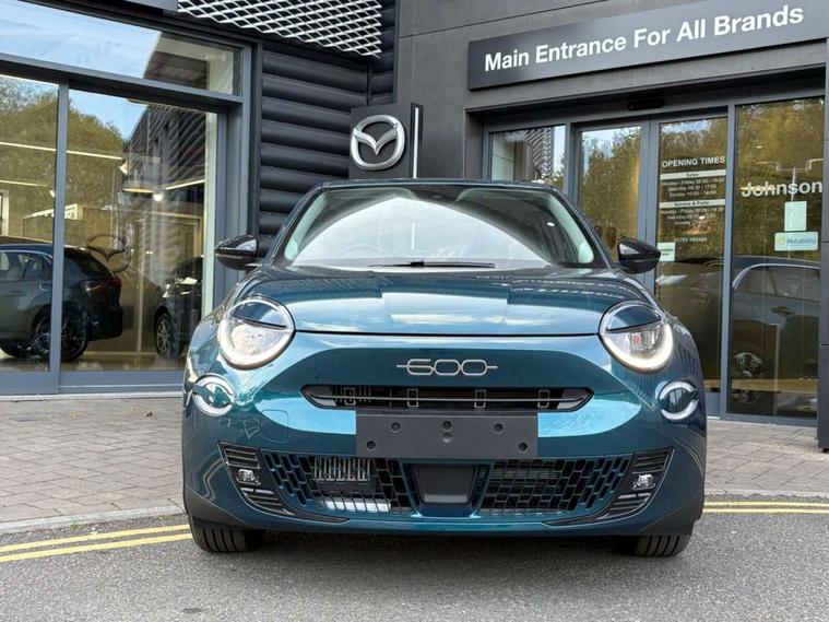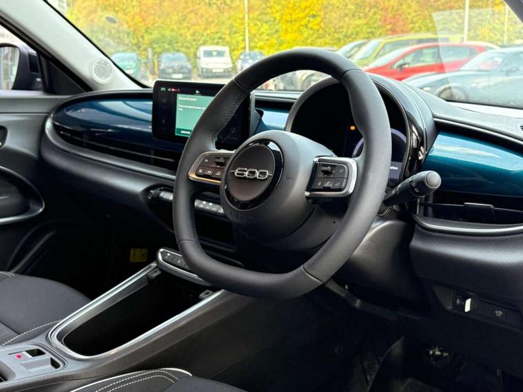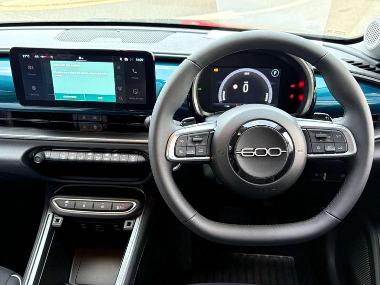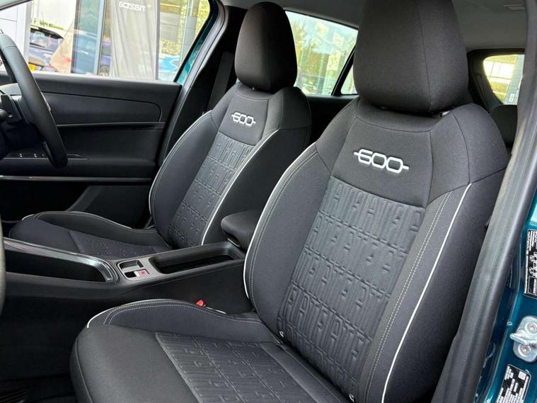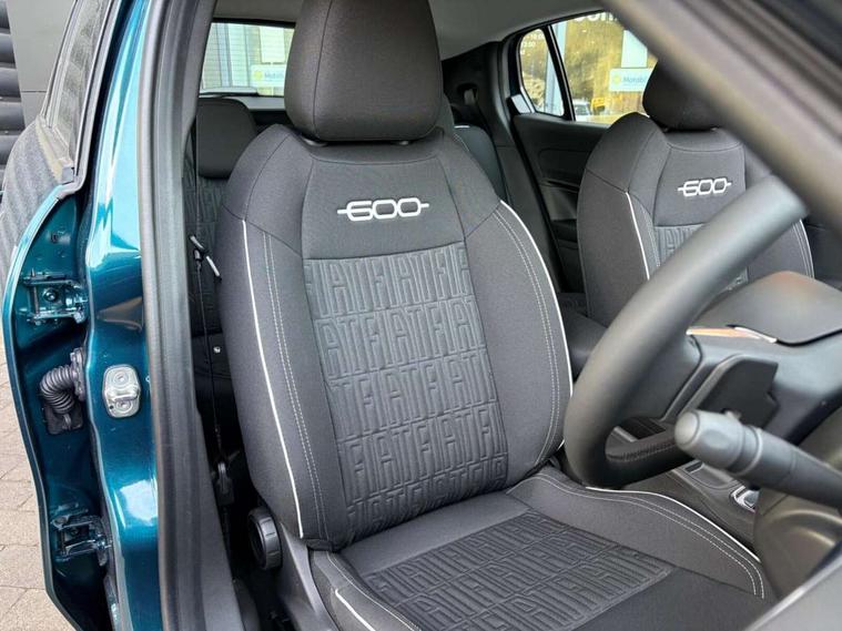7" TFT digital cluster, Bluetooth connectivity, BSRF connectivity box, Connected services, Cruise control, Drowsy driver detection, Emergency E-call assist, Engine emission level default, GSR II step 1, Intelligent speed assist, Lane keeping assistant (LKA), Odometer, Power assist steering, Rain and dusk sensors, Rear parking sensors, Traffic sign recognition, Wireless apple car play/android Auto, Without drive mode selector, L2-AGM 12V battery, 1st Row USB type-A and USB type-C, 4 speaker audio system, Radio, Uconnect infotainment 10.25" touchscreen with DAB, All power windows express Up/Down, Auto dimming frameless rear view mirror, Automatic headlights, Body coloured door handles, Chrome day light openings, Electric adjustable door mirrors, Exterior chrome accents, Front and rear Chromed 600 logo, Gloss black finish B pillar, Gloss black shark fin antenna, Glossy black door mirrors, Heated windscreen wiper blade area, LED 3rd brake light, LED daytime running lights, LED Fog lamps with cornering function, LED front signature lighting, LED front turn indicators and position lights, LED rear lights, LED rear signature lighting, LED reflector headlamps, Matt black side skirts with 600 chromed logo, Rear bumper embossed 600 logo, Rear roof spoiler, Rear side wing doors, Rear wiper, 2 Spoke synthetic leather steering wheel with audio control, 3 rear headrests, 3 seat bench in 2nd row, 4 way manually adjustable passenger seat, 6 way manually adjustable drivers seat, Auxilliary 12V power socket, Body colour dashboard fascia, Chrome interior door handles, Dark metachrome dashboard ring, English handbook, Front centre armrest, Front headrests, Front passenger grab handle, Front seatback pockets, ISOFIX attachment on front passenger and rear passenger seats, Manual climate control, Metachrome central compartment bezel, Monogram fabric upholstery, Paddle shifts, Partial body cover for shipment, Predisposal for accessory upgrade to default tunnel pad cover (dedicated prnd bezel), Rear seat 40/60 split, Single front passenger seat, Smart 15L storage central tunnel with tunnel pad cover, Sunvisor label ciao Fiat, Sunvisors with vanity mirrors, 3x3 point rear seatbelts, 6 airbags, ABS, Autonomous Emergency Brake (AEB) & Vulnerable Road User (VRU) Protection, Child locks on rear doors, Electronic parking brake with auto hold, ESC (Electronic Stability Control), Front passenger airbag deactivation, Seatbelt reminder and pretensioners for all seats, Anti-theft volumetric alarm, Anti-theft wheel bolts, Keyless Go, 17" Diamond cut alloy wheels, Fix and go puncture repair kit,