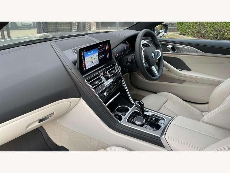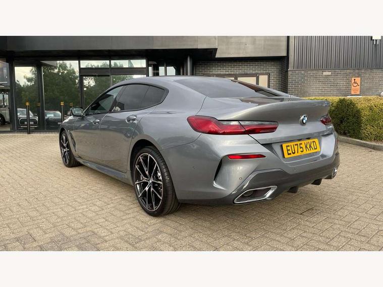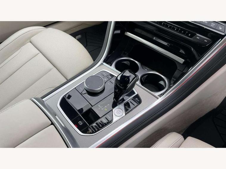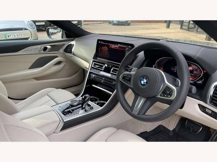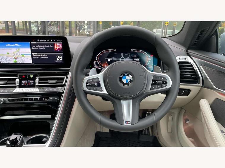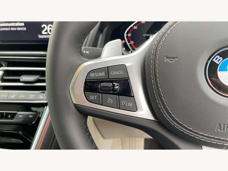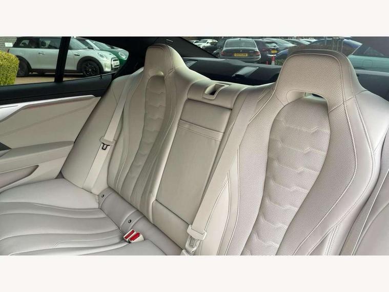 Automatic tailgate operation, remote opening with key, closing by tailgate button or remote control including tailgate in LED technology, Bluetooth hands free facility with USB audio interface, voice control and enhanced bluetooth + Wireless charging, BMW ConnectedDrive online services, BMW legal emergency call, BMW Live cockpit professional with 12.3" instrument display, BMW Teleservices, Brake pad wear indicator, Check control system, Condition based service, Drive experience control with Sport, Comfort, Eco Pro and Adaptive modes, Electric bootlid, Engine start/stop button, Head up Display, iDrive controller with shortcut buttons, Integrated owners handbook, Light on warning, Oil sensor for level and grade, On board computer, Outside temperature display, Service interval indicator, Servotronic system, Wi-Fi hotspot, Adaptive M suspension, Double wishbone front axle, Dynamic Damper Control, Eight speed sport automatic transmission, M Sport differential, Petrol Particulate Filter, Sport exhaust system, DAB Digital radio, Favourite buttons, Automatic windscreen wipers and automatic headlight, Carbon core, Climate comfort windscreen, Daytime driving lights front and rear active, Dynamic brake lights, Exterior mirrors - Floating design mirror, electric adjust/heated/folding, aspherical, Follow me home headlight function, Frameless interior mirror, Front and rear bumper system with replaceable deformation elements, Front electric windows, Front ornamental grille with kidney grille bars, Heat protection, sun protection glazing, Heated rear window, glass, Heated windscreen washer jets, High beam assistant, Illuminated door handles, Illuminated radiator grille iconic glow, LED rear lights, Model logo - right tailgate in chrome, M emblem on side panel in light chrome, badge on bonnet and tailgate, Rain sensor and automatic driving lights control, Rear boot, Rear side wing doors, Side window graphic in black high gloss, Sun protection glass, Thermally insulated windscreen, Third LED technology brake light in rear window, Welcome lights in interior and door handle area, 1 x 12V power socket in front centre console, 2 cup holders in front, 2 rear head restraints, 3 spoke M sport leather multifunction steering wheel with shift paddle, 4 zone control automatic air conditioning, 5 seats, 50/50 split folding rear seat, Ambient light with dynamic interior light, BMW ID, Front and rear seat heating, Front door pockets, Front entry lights doors, Front reading lights, Front sun visors with ticket holder and illuminated mirror, Interior lighting - Interior light front centre above interior mirror, luggage compartment light, automatic interior light system soft on/soft off, Lashing eyelets, Lockable glove compartment with light, Microfilter and active carbon filter, Steering column with adjustable height and length and activation via control on the steering column, Storage compartment under front centre armrest with light, 1 x 12V power socket and USB, Through loading function, Connected professional pack - 8 Series, M sport exterior styling aerodynamics pack - 8 Series, 3x3 point rear seatbelts, ABS/EBD, Active protection, Airbags - Driver and front passenger airbag with seat occupancy detection, knee, side and front passenger seat airbag deactivation, Brake discs, compound structure, Child locks on rear doors, Cornering brake control (CBC), Crash sensor activating central locking release, hazard warning lights, fuel cut off, interior lighting, safety battery terminal clamp and airbags, DSC - Dynamic Stability Control, Dynamic brake control, Dynamic Traction Control - DTC, Electromechanical parking brake with automatic drive away release and auto hold function, Front three point with pyrotechnical belt latch tensioner seat belts, belt force limiter and belt stopper, Head airbags for 1st and 2nd seat row, Hill start assist, Integrated brake system, ISOFIX child seat mounting for the two outer rear seats, Rear three point with pyrotechnical belt latch tensioner seat belts and belt force limiter, Side impact protection, Tyre pressure monitoring system (TPMS), Warning triangle and first aid kit, Alarm system (Thatcham 1) with electronic engine immobiliser, Centre lock switch, Closing system with central locking, Comfort access system, Locking wheel bolts, Vehicle key with exclusive M designation, Instrument and upper door panel in black walknappa leather with contrast stitching,