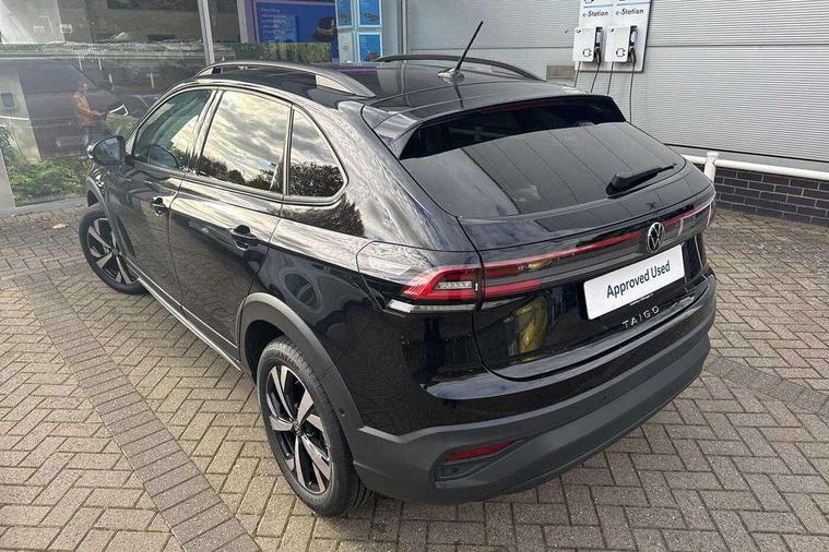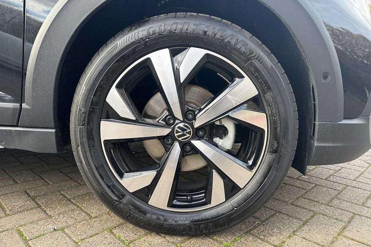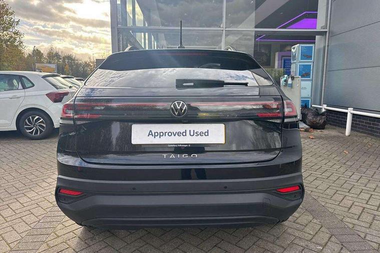 8" Digital cockpit basic display, Advanced driver attention and drowsiness monitor, Dynamic road sign display, e-Call (emergency call), Power Steering, Predictive adaptive cruise control, Rear view camera, Travel assist including emergency assist, Washer fluid level indicator, Wireless Charging including Bluetooth, Start-stop system with battery regeneration (recuperation - energy recovery during braking), Digital radio reception (DAB+), WeConnect plus, Ambient lighting with logo projection, Aspherical driver's exterior mirror, Body coloured bumpers, Body coloured exterior mirror housings and door handles, Electric windows, External USB type C socket and charging sockets, Heat insulating glass windscreen, LED rear combination lamp, LED third brake light, Left convex exterior mirror, Power folding adjustable/heated exterior mirrors and front passenger exterior mirror lowering function, Rear fog light on one side, reversing light on both sides, Rear side wing doors, Rear wash/wipe with intermittent wipe setting, Side windows in heat-insulating glass, from B-pillar and rear window dark tinted, 'Slash/ Austin' Cloth upholstery, 12V socket in centre console, 2 front reading lights, 3 rear head restraints, 3 seat bench in 2nd row, Black carpets, Ceramique headliner, Child seat anchor for child seat system i-Size, 2x top tether and child seat anchor in front on front passenger side, Door and side trim panels in titan black, Driver and front passenger seat height adjustment, Front centre armrest, Handbrake lever handle in leather, Height and reach adjustable steering wheel, Leather trimmed gear knob, Leather wrapped multifunction steering wheel, Luggage compartment floor, Luggage compartment light, Lumbar support for driver's and front passengers seat, Seat covers in titanium black, Single front passenger seat, Split folding backrest with centre armrest and unsplit rear seat bench, Storage compartment under front seats, Sun visors with illuminated vanity mirrors, Titanium black instrument panel, Chrome Package - Taigo, Drivers assistance package - Taigo, Light and sight pack - Taigo, 2 x 3-point seatbelts/outer rear seats with ECE label, 3-point seat belts in front with pretensioner and height adjustment, 3-point seatbelt for centre rear seat, Driver and front passenger airbag with front passenger airbag deactivation, Driver and front passenger safety-optimised head restraints, Electronic stability control, Extended and predictive pedestrian/ cyclist protection, Front and rear disc brakes, Front curtain and side airbags with center airbag, Hill start assist, Manual rear child locks, Single tone horn, Tyre pressure loss indicator, Anti-theft alarm system with interior monitoring, backup horn, and towing protection, Keyless locking and starting system keyless access with safelock, Black (slush) Dashboard, Lava stone black gloss/matt decorative inserts in dash and front door panels, Low rolling resistance tyres,