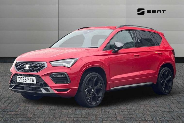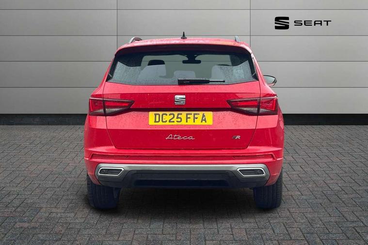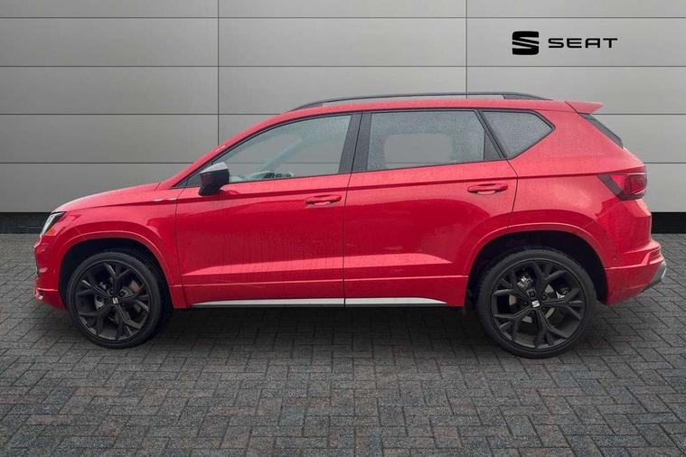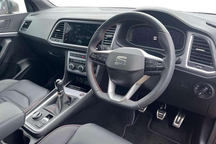 10" Digital cockpit, Bluetooth audio streaming with handsfree system, E-call, Electric tailgate with virtual pedal, Outside temperature gauge, Progressive power assisted steering, SEAT drive profile with driving experience button - Normal, Sport, Eco and Individual mode, steering and throttle response, Self parking functionality (includes front and rear parking sensors), Speed limiter, Start/stop system, Top view camera with rear view camera, Trip computer, wired and wireless full link smartphone integration, Wireless phone charger, Steering wheel mounted audio/phone controls, Black roof rails, Black side window trim, Body colour bumpers, Body coloured wheel arch surrounds, Chrome front grille frame, Dark tinted rear windows, Daytime running lights, Door mirrors with welcome light silhouette, Dynamic headlight range control with self adjusting whilst driving, Electric adjustable/heated/folding door mirrors, Front and rear electric windows, Illuminated aluminium front door sill, LED 3rd brake light, LED headlamps with lens and LED front fog lamps with cornering function, LED rear tail lights with dynamic indicators, Rear exhaust tailpipe, Rear fog lights, Rear side wing doors, Rear spoiler, Rear wash/wipe, Variable front intermittent wipers, 12v socket in front, 3 seat bench in 2nd row, 60/40 split folding rear seat, Aluminium pedals, Black greenhouse interior roof, Dual zone climate control, Electric adjustable driver seat with memory function, Front and rear head restraints, Front centre armrest, Front seat back storage pockets, Heated front seats, Height adjustable passenger seats with lumbar adjustment, ISOFIX points in outer rear seats with top tether anchorage points, Leather sports steering wheel and gear knob, Leather upholstery with front comfort seats, Rear armrest and easy back seat release mechanism from boot, Single front passenger seat, Convenience pack - Ateca, Interior lighting pack - Ateca, Navigation system pack with DAB - Ateca, Safety and driving pack (L) - Ateca, Safety and driving pack with attention and drowsiness assist - Ateca, 3x3 point rear seatbelts, ABS, Traction control system (TCS), Electronic stability control (ESC) and Electronic differential lock system (XDS), Airbags - Driver and front passenger airbag with deactivation, front side, two curtain and driver's knee airbags, Electric parking brake with auto hold function, Front and rear seatbelt reminder, Hill hold control, Manual rear child locks, Single tone horn, Tyre pressure monitoring system, Alarm, Keyless entry, Locking wheel bolts, Remote central locking, Chrome interior detailing, 19" Exclusive alloy whelels 36/10 in glossy black, Tool kit,