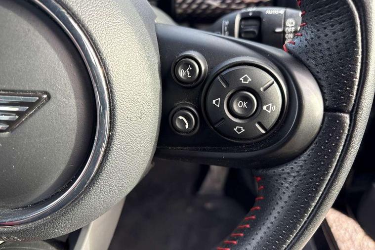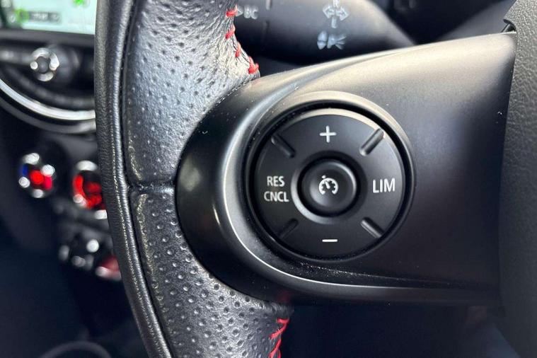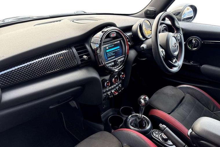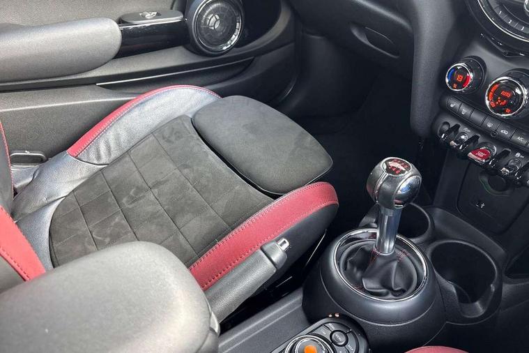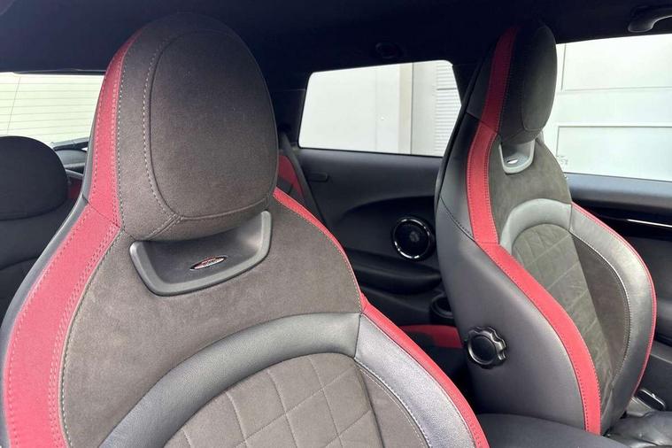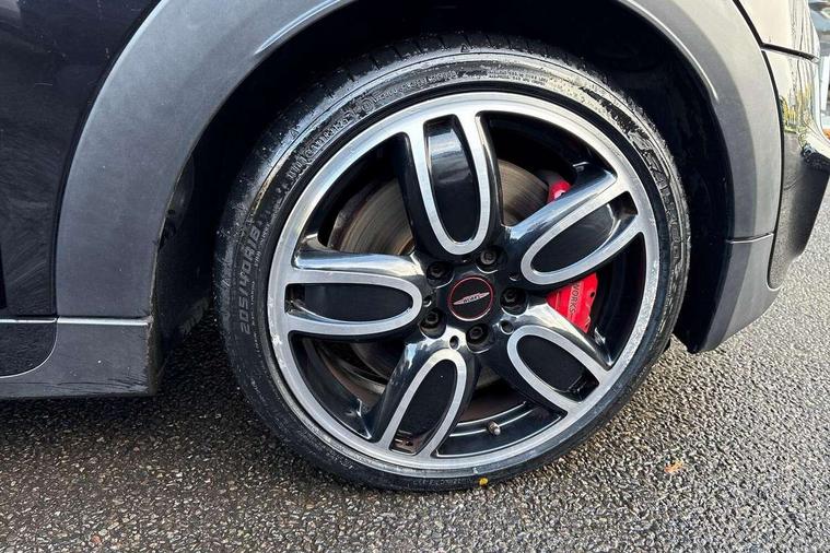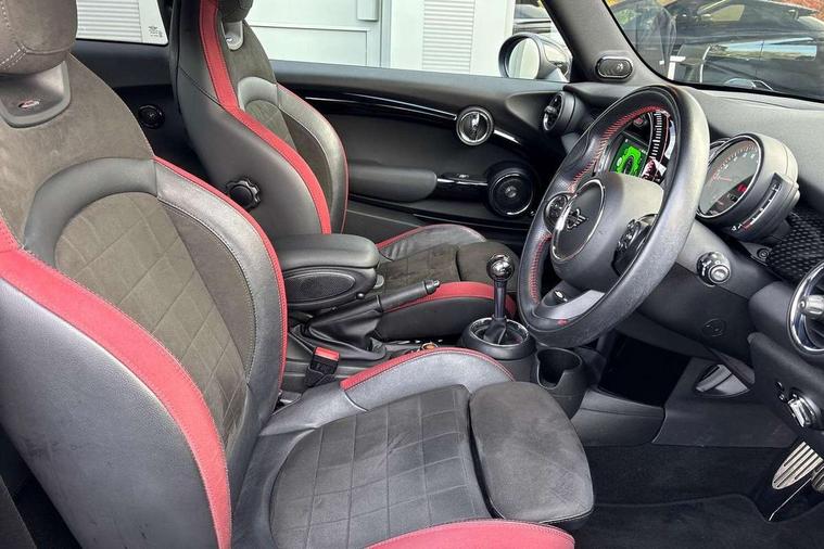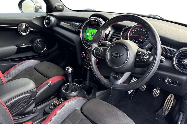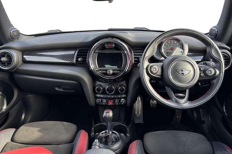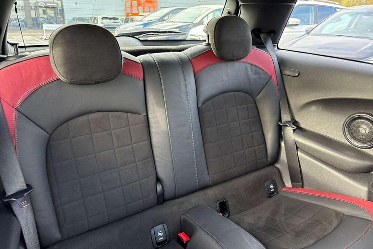 Acoustic seat-belt warning, Basic bluetooth function with USB audio, Brake fluid level warning light, Brake pad wear indicator warning light, DTC - Dynamic traction control, Exterior temperature gauge, Intelligent emergency call, MINI Driving Modes - centre toggle switch to control driving setting (sport, mid and green), MINI TeleServices, Oil level indicator, On board computer, Push button starter, Service interval indicator, Servotronic PAS, Electronic differential lock, Performance Control, Auxiliary input socket, DAB digital radio module, 2 speed wipers+intermittent wipe, Anti dazzle mirror, Anti trapping/one touch open close front windows, Body colour scoop integrated into engine- compartment lid, Body coloured bumpers, Chili red grille bar, Chrome bezels around rear lights and headlights, Chrome door handles, Chrome plated fuel cap, Chrome plated trim on bottom edge of window, Chrome strip on lower grille, Electric front windows, Electric rear windows, Electrically adjustable door mirrors, Extended wheel arches, Follow me home headlights, Green tinted heat insulating glass, Heated door mirrors/heated windscreen washers, Heated rear window with auto timer, High gloss black tailgate, Honeycomb radiator grille, John Cooper Works body kit, John Cooper Works roof spoiler, LED fog lights, LED rear lights, Metal look door sill finishers, Rear wiper, Side scuttles, Twin chromed exhaust pipes, White indicator lights, 2 rear head restraints, 4 boot load lashing points, 6 way manually adjustable passenger seat, 6-way manually adjustable driver's seat, Active carbon filter, Adjustable front seats backrest, Air recirculation system, Anthracite headlining, Auxiliary socket in centre console storage compartment, Centre console storage, Driver's seat height adjuster, Driver/passenger sunvisors, Easy entry seats, Front and rear cupholders, Front head restraints, Front passenger grab handle, Front seat backrest storage nets, Front sports seats, Gear/selector and handbrake in artificial leather, Internal chrome door handles, Isofix child seat preparation, Luggage compartment lighting, Multifunction steering wheel, Passenger seat height adjuster, Reach + rake adjustable steering column, Rear grab handles, Rear storage trays, Split folding rear seats, Stainless steel pedals with rubber inserts, Storage compartments in doors, Toolkit in luggage compartment, 3 point seatbelts, 3x3 point rear seatbelts, ABS/EBD, ASC+T, Brake calipers in red, Cornering brake control (CBC), Crash Sensor - activates hazard/interior lighting + unlocks doors, Driver and passenger airbags, Driver/front passenger side airbags, DSC - Dynamic Stability Control, Fuel cut off safety device, Head airbags, Hill start assist, Passenger airbag deactivation system, Seatbelt pretensioners, Tyre pressure warning, Ventilated front disc brakes, Drive away door locking, Locking wheel bolts, Remote central locking/doors+fuel cap+tailgate, Second remote key, Thatcham category 1 alarm + immobiliser,