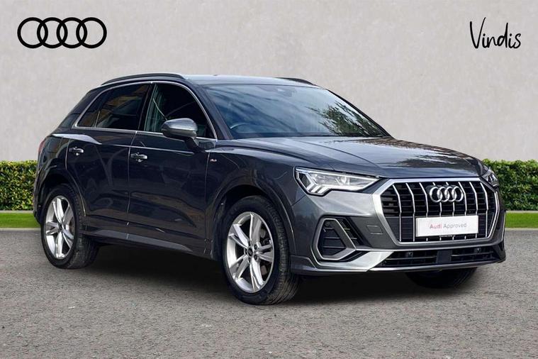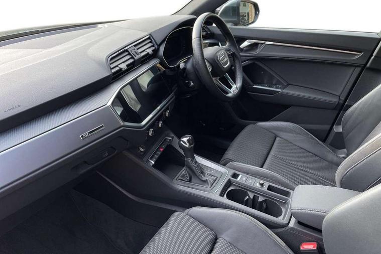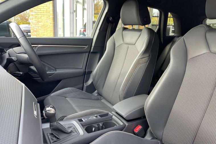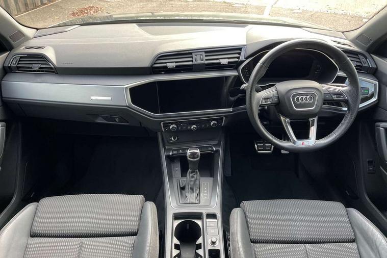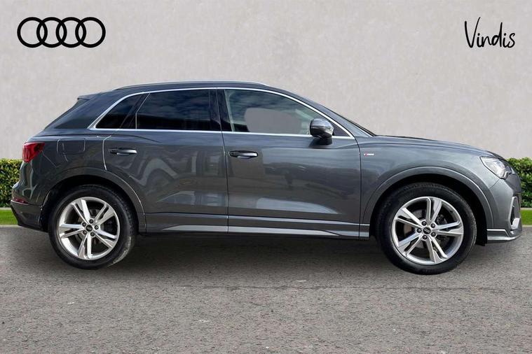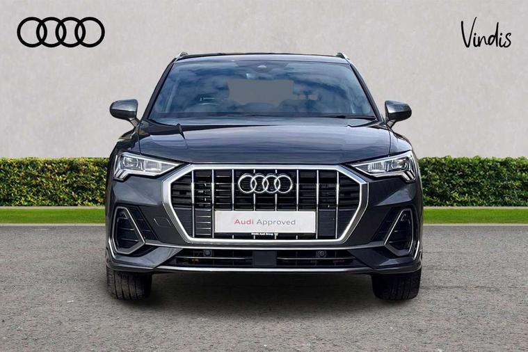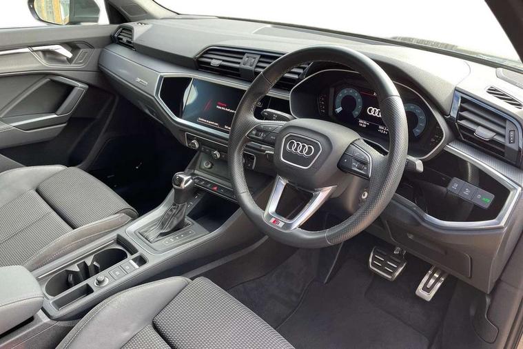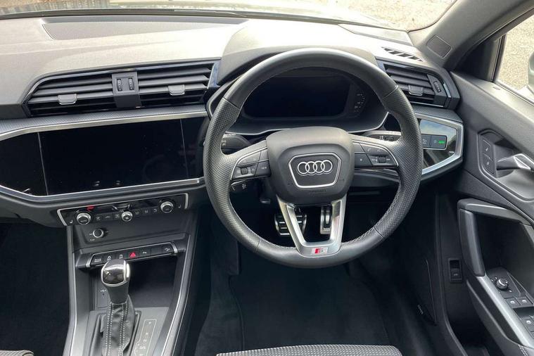 Amazon alexa Integration, Audi drive select, Audi lane departure warning, Audi Virtual Cockpit - 10.25" display, Bluetooth interface, Camera based traffic sign recognition, Legal emergency call, MMI Navigation Plus with high resolution 10.1 inch touchscreen colour display, Power operated tailgate, Progressive steering, Service interval indicator, Smartphone interface includes wireless Apple carplay/Android Auto, Start stop system with recuperation, Voice control system with natural language interaction, 48V Mild hybrid technology, Sports suspension, 2 USB-C ports with charge and data functions, 6 passive loudspeakers, DAB digital radio module, Acoustic windscreen, Aluminium roof rails, Aluminium window trim, Auto dimming frameless rear view mirror, Body coloured bumpers, Electrically folding, adjustable and heated door mirrors with integrated LED side indicators and kerb view function for passenger side, Front and rear electric windows, Front fog lights, Front side air inlets in matt platinum grey, Front spoiler blade in matt platinum grey, Grille vertical bars in aluminium silver/Matt, High gloss black finish B and C pillars, LED headlights with LED daytime running lights, LED rear lights, LED third brake light, Privacy glass dark tinted rear and rear-side windows (from B-pillar backwards), Rain and light sensors, Rear diffuser grille in grained matt black, Rear diffuser strip in matt titanium black, Rear side wing doors, Rear wiper, S line badges on front wings, S Line front and rear bumpers, Side skirt insert in matt Platinium grey, Titanium black radiator grille, Variable front intermittent wipers, 12V socket in rear centre console, 3 seat bench in 2nd row, 40:20:40 folding with manual adjustment for 60:40 forwards/backwards position and backrest angle, Adjustable rear seat bench/backrest with centre armrest and cupholder, Black cloth headlining, Dual zone electronic climate control, Front and rear black floor mats with contrast stitching in rock grey, Front and rear headrests, Front and rear roof module including reading lights, Front centre armrest, Glove compartment lighting, Height and reach adjustable steering wheel, Illuminated door sill trims with S logo, ISOFIX child seat mounting for front passenger with airbag deactivation and outer rear seat including top tether attachment point for outer rear seats, Luggage compartment light, Manual front seats with height adjustment, Perforated leather gearknob, Single front passenger seat, Stainless steel luggage compartment sill finisher, Stainless steel pedals, Non smoking pack - Q3, 3x3 point rear seatbelts, 6 airbags - Driver, front passenger, curtain and side windows, Audi pre-sense front with pedestrain and cyclist recognition, Electromechanical parking brake, Electronic stabilisation control including ABS, ASR and EDL, Front seatbelt reminder, Hill descent control, Hill hold assist, Manual child lock in rear doors, Pre sense basic, Seatbelt monitoring, Tyre pressure warning, Warning triangle and first aid kit, Anti theft alarm, Anti theft wheel bolts, Immobiliser, Remote central locking, Dark matt brushed aluminium inlay, Detail dashboard around MMI touch colour display in glass look, black with surround in aluminium look, Leatherette door armrest, Tool kit, Tyre repair kit,