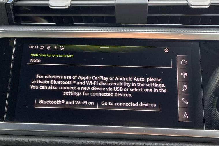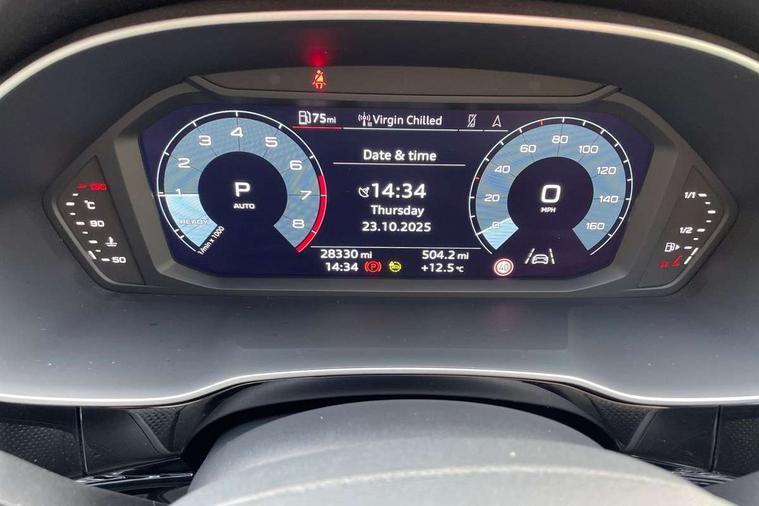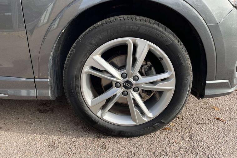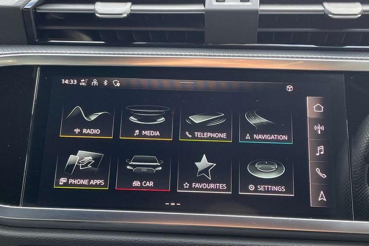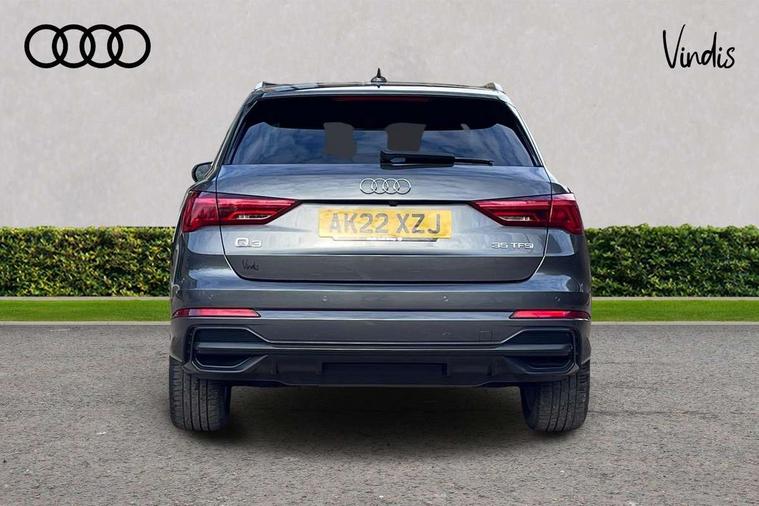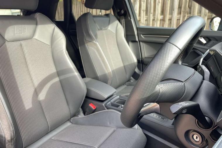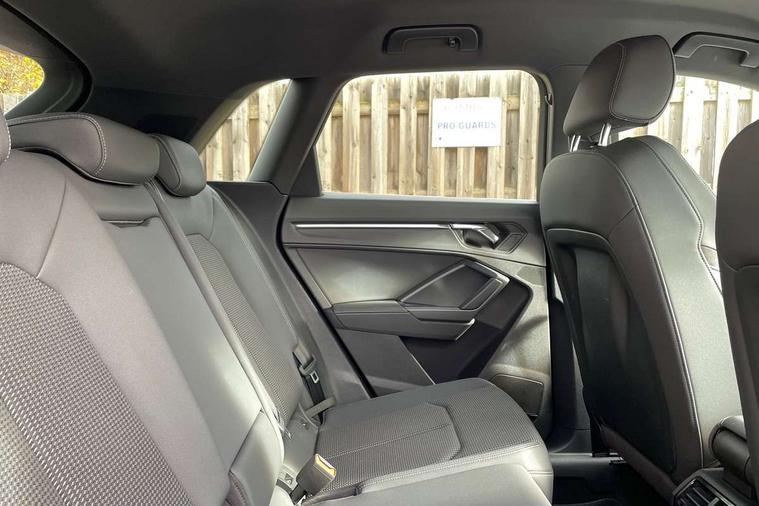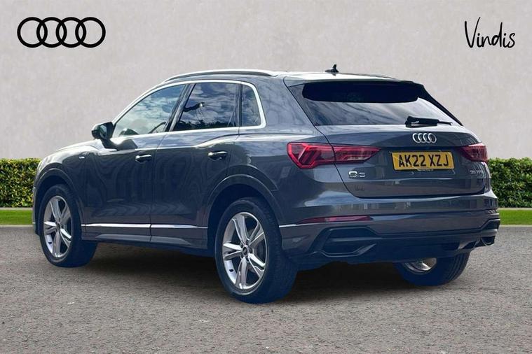 Amazon alexa Integration, Audi drive select, Audi lane departure warning, Audi Virtual Cockpit - 10.25" display, Bluetooth interface, Camera based traffic sign recognition, Legal emergency call, MMI Navigation Plus with high resolution 10.1 inch touchscreen colour display, Power operated tailgate, Progressive steering, Service interval indicator, Smartphone interface includes wireless Apple carplay/Android Auto, Start stop system with recuperation, Voice control system with natural language interaction, 48V Mild hybrid technology, Sports suspension, 2 USB-C ports with charge and data functions, 6 passive loudspeakers, DAB digital radio module, Acoustic windscreen, Aluminium roof rails, Aluminium window trim, Auto dimming frameless rear view mirror, Body coloured bumpers, Electrically folding, adjustable and heated door mirrors with integrated LED side indicators and kerb view function for passenger side, Front and rear electric windows, Front fog lights, Front side air inlets in matt platinum grey, Front spoiler blade in matt platinum grey, Grille vertical bars in aluminium silver/Matt, High gloss black finish B and C pillars, LED headlights with LED daytime running lights, LED rear lights, LED third brake light, Privacy glass dark tinted rear and rear-side windows (from B-pillar backwards), Rain and light sensors, Rear diffuser grille in grained matt black, Rear diffuser strip in matt titanium black, Rear side wing doors, Rear wiper, S line badges on front wings, S Line front and rear bumpers, Side skirt insert in matt Platinium grey, Titanium black radiator grille, Variable front intermittent wipers, 12V socket in rear centre console, 3 seat bench in 2nd row, 40:20:40 folding with manual adjustment for 60:40 forwards/backwards position and backrest angle, Adjustable rear seat bench/backrest with centre armrest and cupholder, Black cloth headlining, Dual zone electronic climate control, Front and rear black floor mats with contrast stitching in rock grey, Front and rear headrests, Front and rear roof module including reading lights, Front centre armrest, Glove compartment lighting, Height and reach adjustable steering wheel, Illuminated door sill trims with S logo, ISOFIX child seat mounting for front passenger with airbag deactivation and outer rear seat including top tether attachment point for outer rear seats, Luggage compartment light, Manual front seats with height adjustment, Perforated leather gearknob, Single front passenger seat, Stainless steel luggage compartment sill finisher, Stainless steel pedals, Non smoking pack - Q3, 3x3 point rear seatbelts, 6 airbags - Driver, front passenger, curtain and side windows, Audi pre-sense front with pedestrain and cyclist recognition, Electromechanical parking brake, Electronic stabilisation control including ABS, ASR and EDL, Front seatbelt reminder, Hill descent control, Hill hold assist, Manual child lock in rear doors, Pre sense basic, Seatbelt monitoring, Tyre pressure warning, Warning triangle and first aid kit, Anti theft alarm, Anti theft wheel bolts, Immobiliser, Remote central locking, Dark matt brushed aluminium inlay, Detail dashboard around MMI touch colour display in glass look, black with surround in aluminium look, Leatherette door armrest, Tool kit, Tyre repair kit,