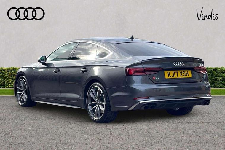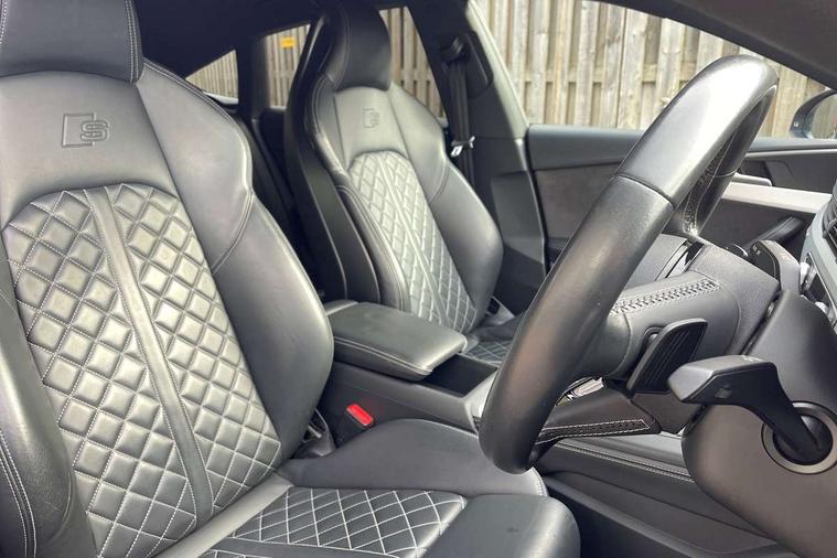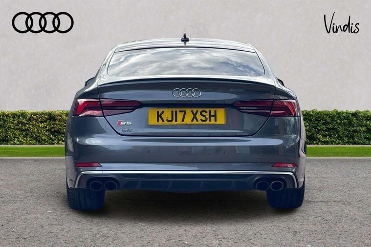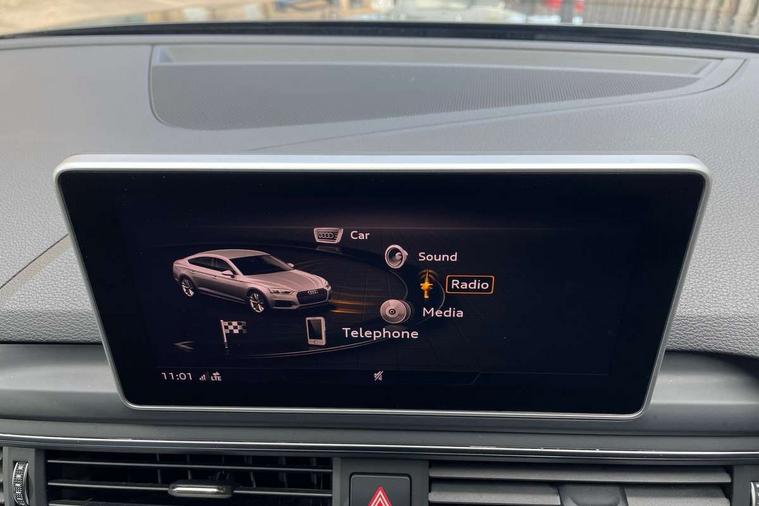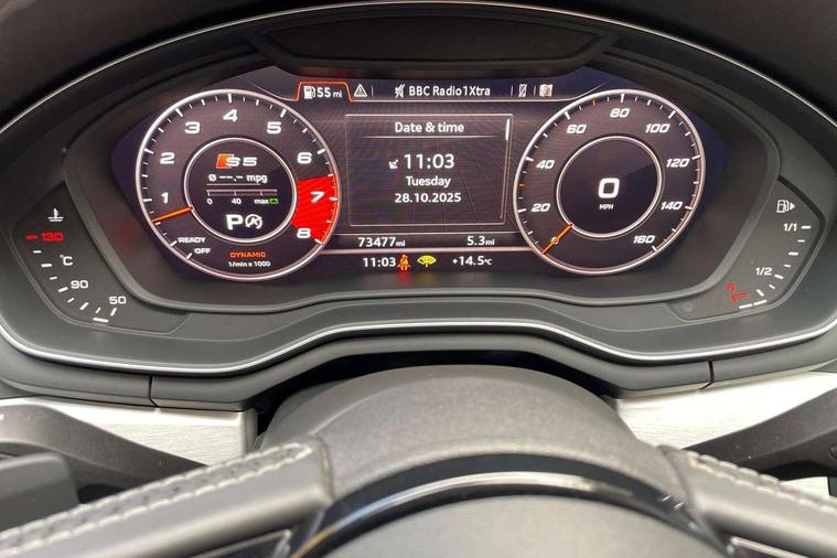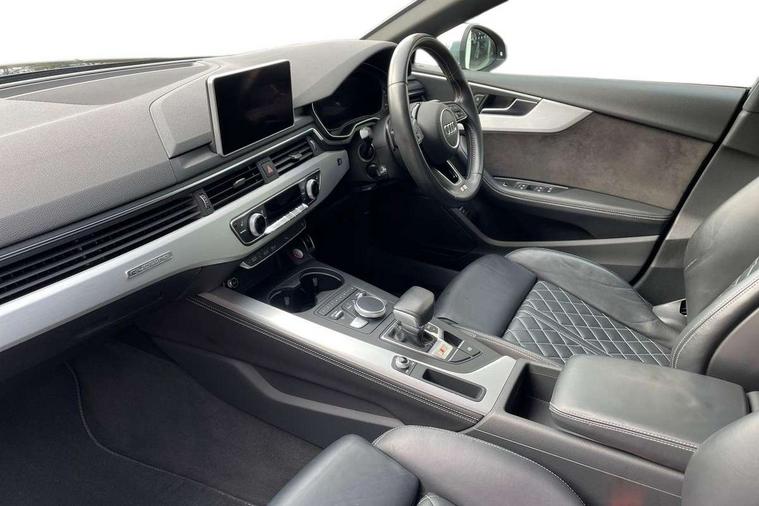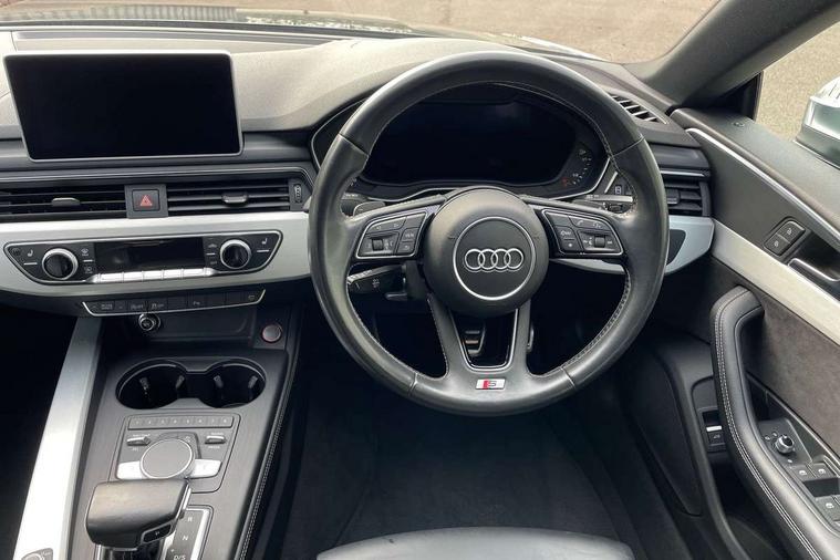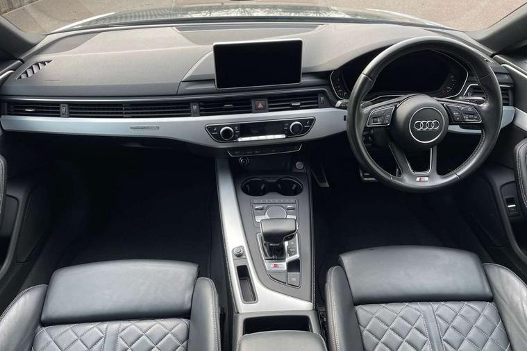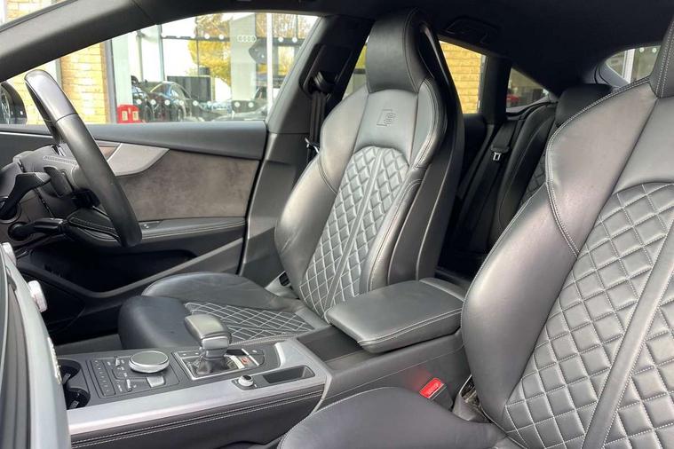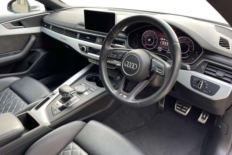 Audi drive select, Audi parking system plus with front and rear sensors, Audi smartphone interface, Colour driver's information system display, Cruise control + speed limiter, Electric tailgate release, Electro-mechanical PAS, MMI navigation plus with MMI touch, Mobile telephone preparation - bluetooth interface, Service interval indicator, Voice control system, 2 x USB charging port with aux input socket, CD player, DAB Digital radio, MMI radio plus with 7" colour MMI screen and MMI controller, Two SDXC card slots, Air inlets in titanium black, Aluminium door mirror housings, Auto dimming rear view mirror with acoustic windscreen, Body colour bumpers, Body colour rear spoiler, Chrome door handles, Electric adjustable heated door mirrors, Electric front windows, Front fog lights, Headlight washers, Heat insulated glass, High beam assistant, Rain and light sensors, S body styling, Twilight grey matt radiator grille in aluminium silver matt inlay, Twilight grey matt rear diffuser, Twin chrome exhaust tailpipes x2, 'S' instrument dials, 3 seat rear bench, Adjustable steering column, Automatic tri-zone climate control, Black headlining, Boot mat, Centre console with cupholders, Electric lumbar support, Fine Nappa leather upholstery, Front centre armrest, Front/rear floor mats, Illuminated door sills, Isofix front passenger and rear seat preparation, Jack and tool kit, Massage function for front seats, Rear headrests, Rear seat storage trays, Split folding rear seat, Stainless steel pedals and foot rest, Super sports seats, Top tether anchor plate for isofix child seat, Extended interior upholstery pack - A5/RS5, Non Smokers pack, ABS, ASR, Driver/Front Passenger airbags, Electromechanical parking brake, Enhanced braking system, ESP + traction control, First aid kit, Front and rear curtain airbags, Front passenger airbag deactivation, Height adjustable front seatbelts, Multi-Collision braking, Pre-sense city emergency braking system, Seatbelt warning, Side airbags, Tyre pressure monitor, Warning triangle, Anti theft system, Immobiliser, Keyless Start, Locking wheel bolts, Remote central locking, Space saver spare wheel,