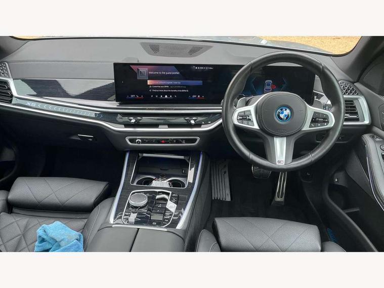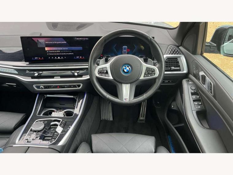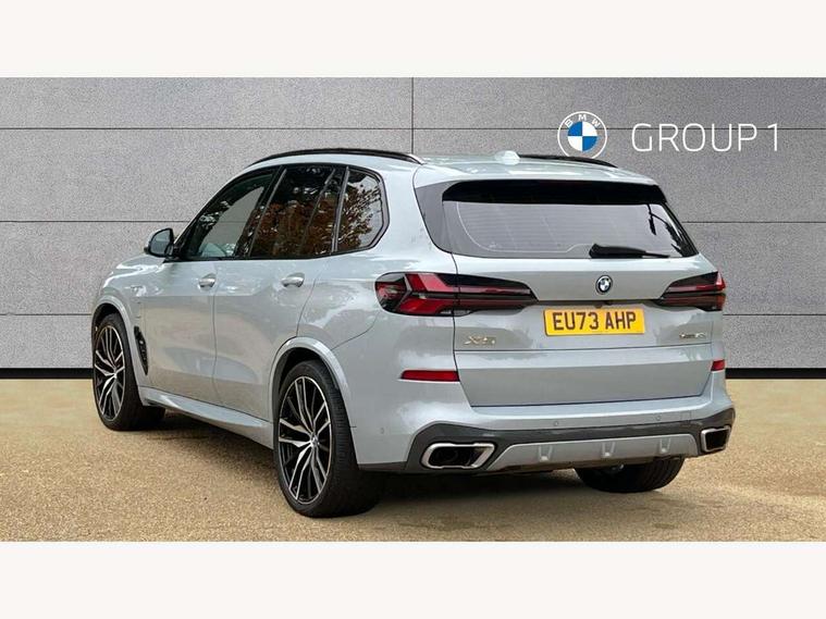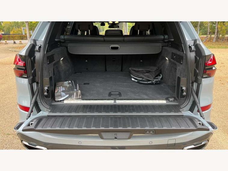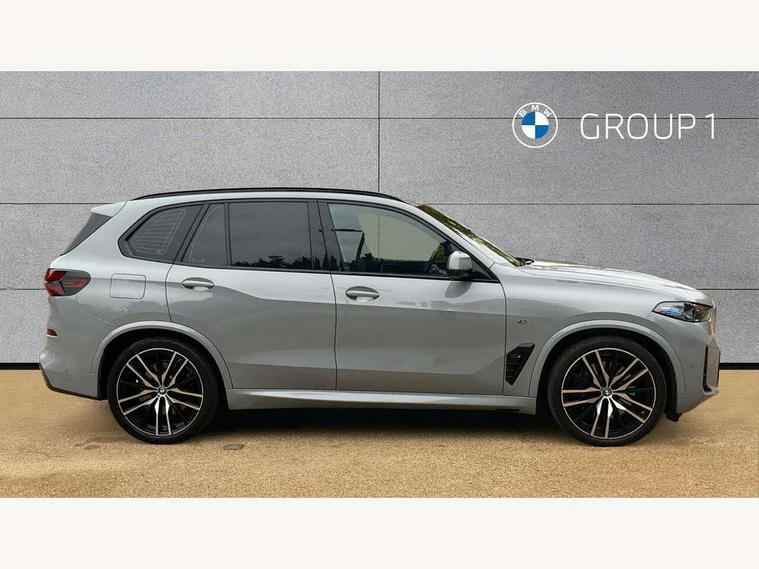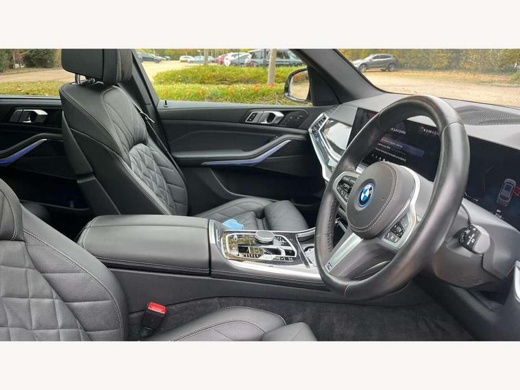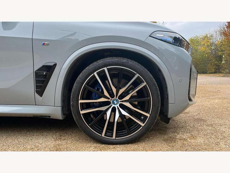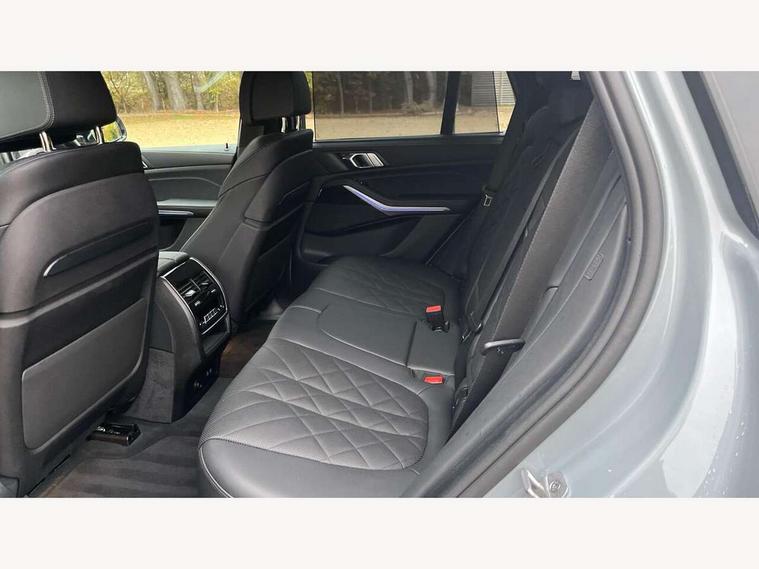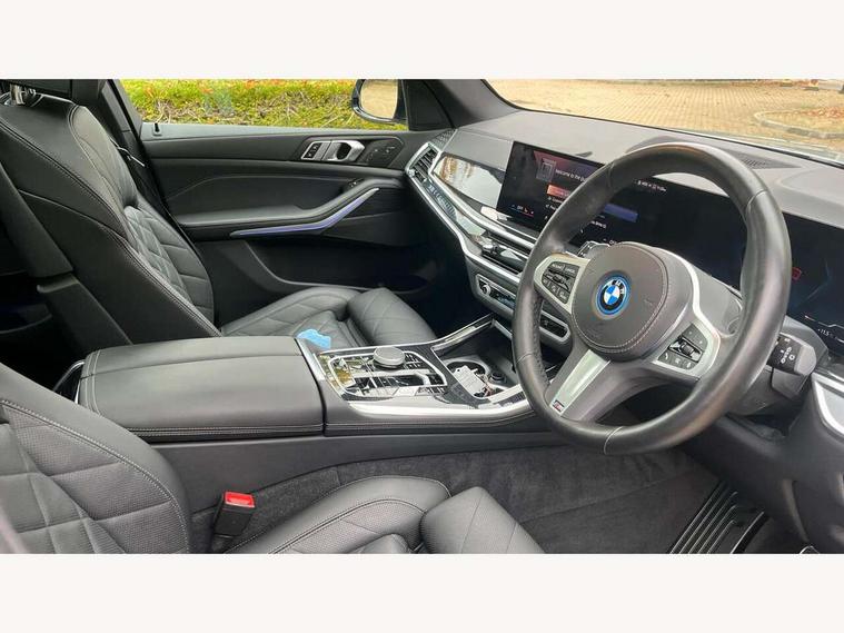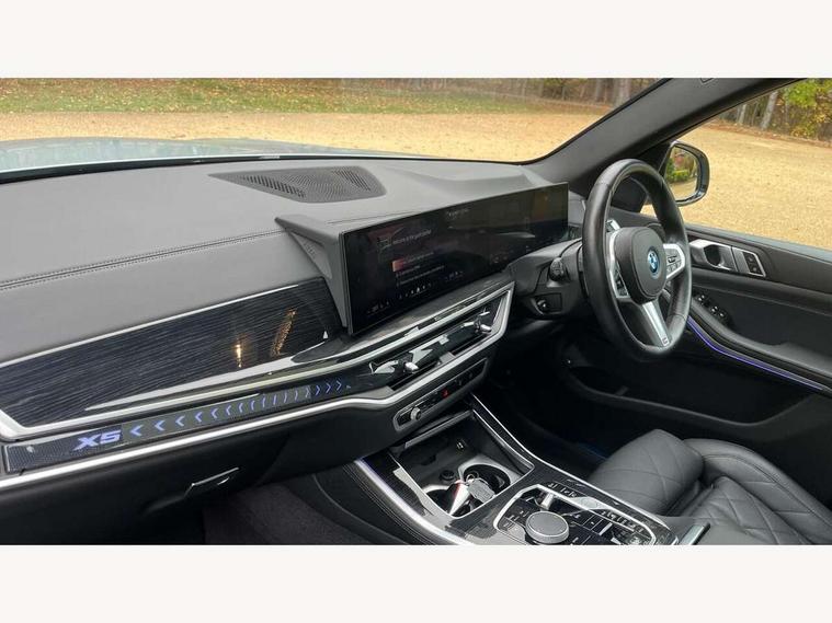 Attentiveness assist, Automatic tailgate operation, BMW ConnectedDrive online services, BMW live cockpit + with curved 12.3 instrument cluster/14.9 central display, nav/Tuner with diversity reception, RDS/4GLTE/remote software upgrade, BMW Teleservices, Condition based service, Cruise control with brake assist, eCall emergency call system, Enhanced bluetooth with wireless charging, Integrated owner's handbook, PAS, Speed limiter, Wi-Fi hotspot, Adaptive 2-axle Front and rear air suspension, Drive performance control with ECO PRO comfort + sport mode, Eight speed steptronic sport automatic transmission and gearshift paddles on the steering wheel, Hi-Fi loudspeaker system, Adaptive LED Headlights, Front and rear electric windows, High beam assistant, High gloss black shadow line roof rails, LED daytime running lights, Rear side wing doors, Third brake light in rear spoiler, Variable intermittent rear wash/wipe, 12V - Power sockets with 2x centre console and 1x luggage compartment, 3 seat bench in 2nd row, Foldable rear centre armrest with 2 cupholders and storage compartment, Front and rear side armrest integrated into door trim, Headrests for all seats, Luggage compartment separating net, Single front passenger seat, Three spoke sport M leather steering wheel, Velour floormats, Ambient light interior pack - X5, Driving assistant pack with radar based driver assistance system - X5, Expanded exterior mirror pack - X5/X5 M, M aerodynamics pack - X5, 3 rear seatbelts, Acoustic protection for pedestrians, Active protection, Airbags - driver/front passenger, rear and side, first and second row seats head airbags, front passenger seat airbag deactivation + knee airbag, Anti-lock braking system (ABS), Automatic Stability Control (ASC), Brake energy regeneration, Cornering brake control (CBC), Crash sensor activating central locking release, hazard warning lights, fuel cut off, interior lighting + activation of safety battery terminal clamp, DSC - Dynamic Stability Control, Dynamic Traction Control - DTC, Electromechanical parking brake with automatic drive away release and auto hold function, Electronic brake force distribution, Hill start assistant, M Sport blue painted brake calipers with 'M' designation, Mechanical child proof lock on rear doors, Tyre pressure monitoring system, Tyre pressure sensors, Ventilated front and rear disc brakes, Warning triangle and first aid kit, Closing system with central locking, Comfort access system, Locking wheel bolts, Sensatec instrument panel,