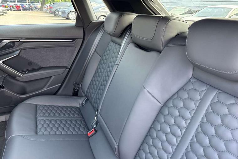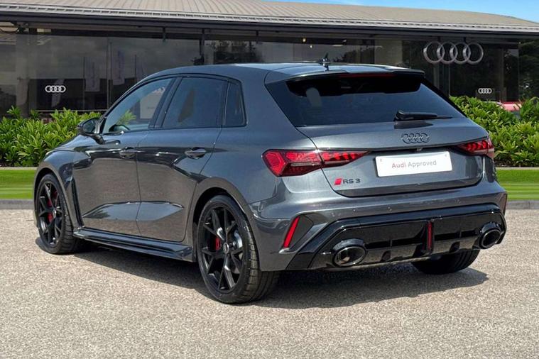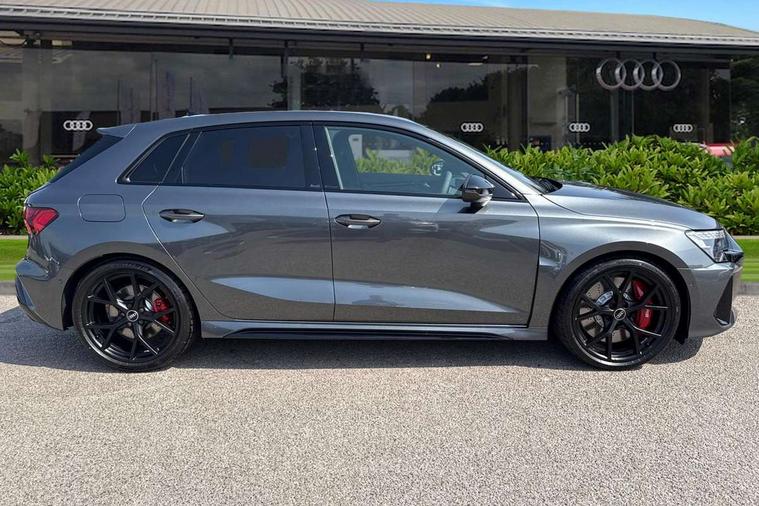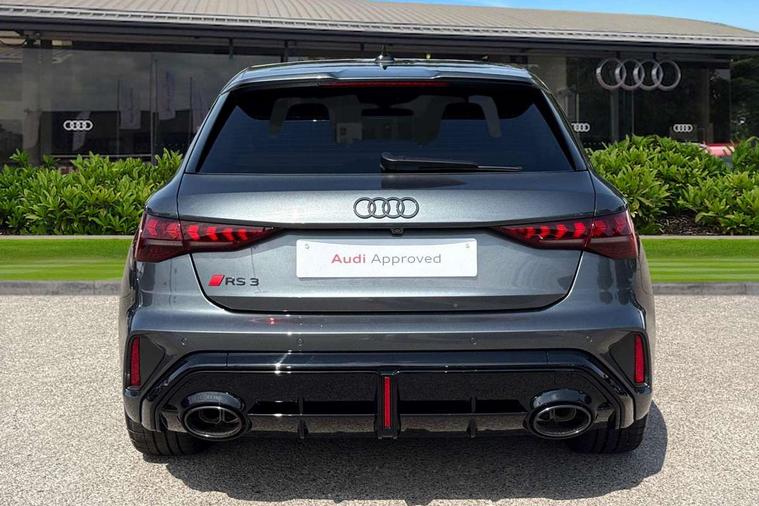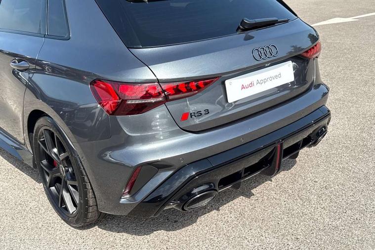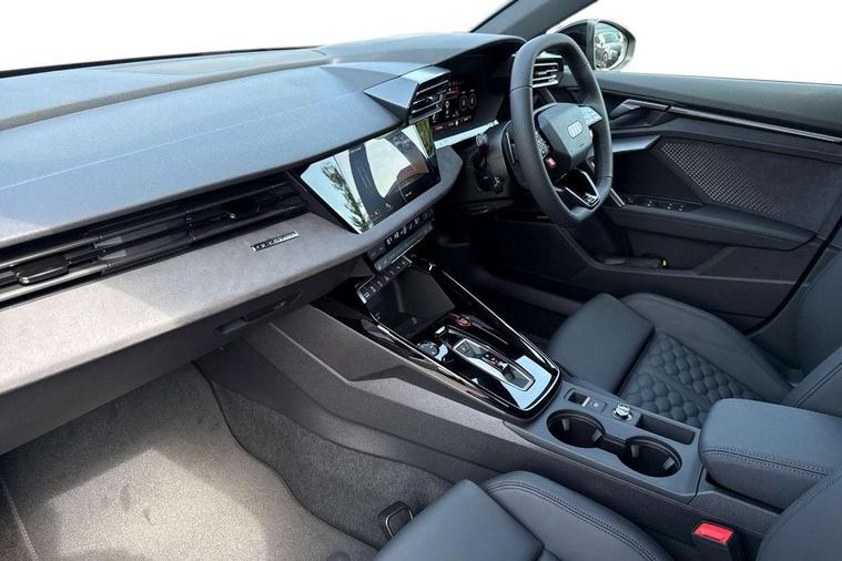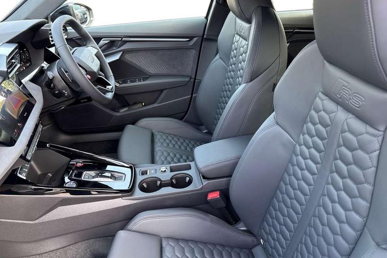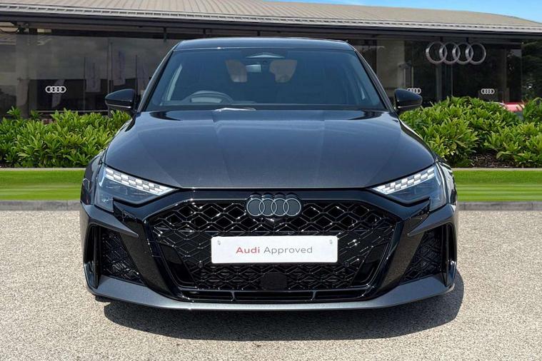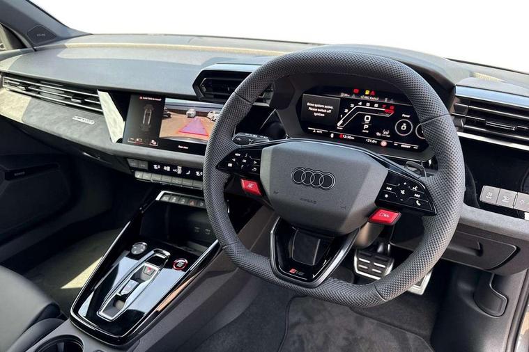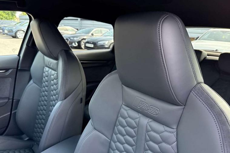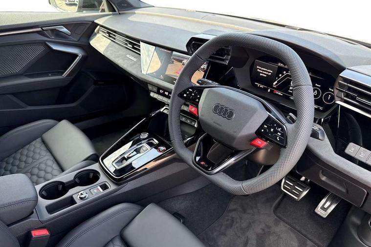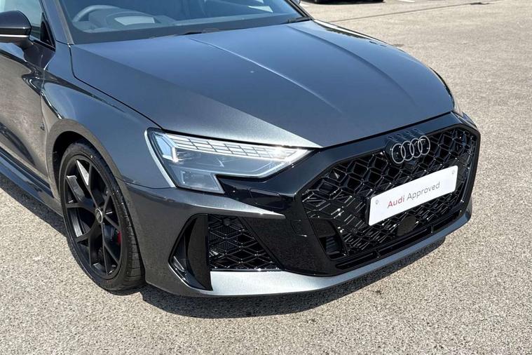 Adaptive cruise control (ACC), Adjustable speed limiter, Audi drive select comfort, auto, dynamic and efficiency, Audi smartphone interface with app store includes wireless Apple carplay, Android auto and Amazon alexa integration, Audi virtual cockpit plus with RS specific design and 12.3" display with additional graphic display options, Automatic start/stop system with recuperation, Bluetooth interface, Camera based traffic sign recognition, Collision avoidance assistant, Driver attention and fatigue detection with driver monitoring camera, e-Call (emergency call), Emergency assist, Intersection assist, Lane departure warning system, MMI Navigation Plus with high resolution 10.1" colour touch screen display, Park Assist with parking system Plus, Progressive steering, Reversing camera, RS specific driving modes - RS Individual, RS Performance and RS Torque rear, Service indicator, Trip computer, Voice control system with natural language interaction, Quattro permanent four wheel drive, Audi Phonebox light with wireless charging, DAB Digital radio, USB ports with charging function in the rear, Audi beam LED projection of RS logo on ground as you exit, Auto dimming frameless rear view mirror, Body colour roof spoiler, Electrically adjustable/heated/folding/auto dimming door mirrors with integrated LED indications + kerb view function for passenger side, Exterior model badging, Front electric windows, Heat insulating glass windscreen, LED 3rd brake light, Light and rain sensors, Privacy glass - dark tinted rear window, rear door and side windows, Rear electric windows, Rear side wing doors, Rear wiper, RS sport exhaust system - dual branch with flap control and gloss black oval tailpipe trims, 12V socket and storage compartment in front centre console, 3 seat bench in 2nd row, 3 Spoke flat top and bottomed black leather multi function steering and gear shift paddles, 3-zone deluxe automatic air conditioning, 40/20/40 split folding rear seat bench, Black cloth headlining, Black front and rear floor mats, Front and rear headrests, Front centre armrest, Front door sill trims with RS 3 logo, Heated front seats, Height and reach adjustable steering wheel, Manual boot compartment lid, Manually adjustable front seats, Rear centre armrest with cupholder, Seat side bolsters, Single front passenger seat, Stainless steel pedals and front footrest in black, Vanadium look - Interior door handles, Door trim, power latching, Air vents, window controls, mirror adjust, rear door lock, Selector lever in centre console, Black Styling plus package - RS3, RS exterior pack - RS3, RS sport suspension pack - RS3, Storage package - RS3 Sportback, Technology pack with Matrix LED headlights - RS3, 3x3 point rear seat belts, Driver and front passenger airbag with passenger airbag deactivation, Electronic Stabilisation Control (ESC) including ABS, ASR and EDL, First aid kit with warning triangle and 2 safety vests, Hill hold assist, Pre-sense front with pedestrian and cyclist detection, RS steel brakes, Seatbelt monitoring, Tyre pressure loss indicator, Anti theft alarm, Anti-theft wheel bolts, Electronically operated child locks, Immobiliser, Black dashboard, Tyre repair kit,