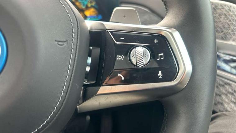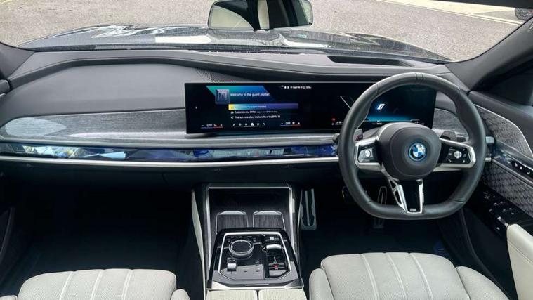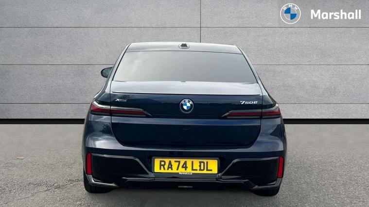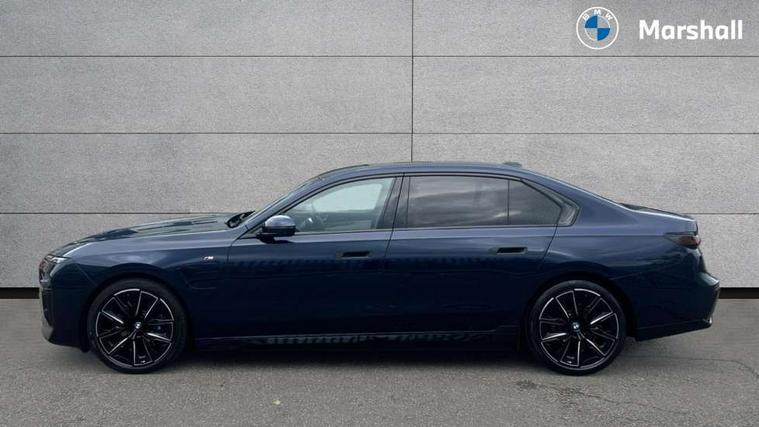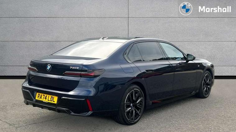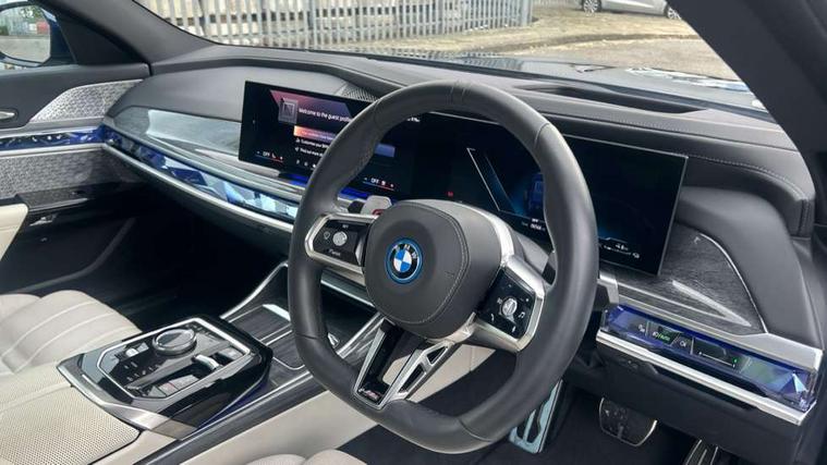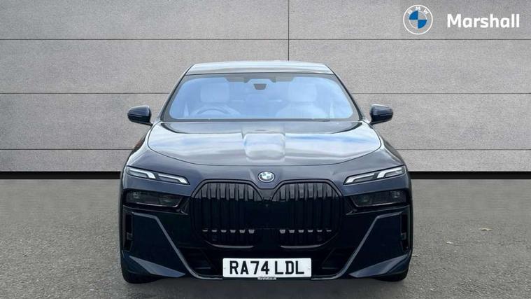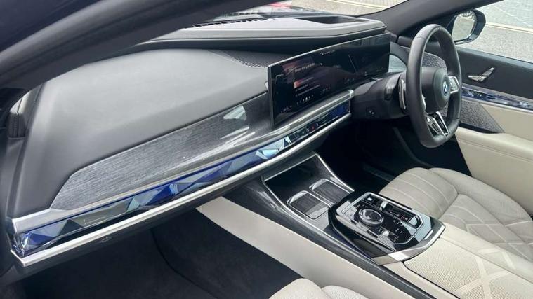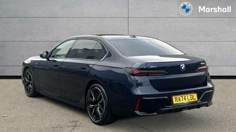 Active Guard, Attentiveness assist, BMW ConnectedDrive - Online, BMW gesture control, BMW Iconic sounds electric, BMW iDrive, BMW interaction bar, BMW legal emergency call, BMW Natural interaction, BMW Teleservices, BMW Touch command, Brake pad wear indicator, Comfort access system with smart opener, Condition based service, Driving Assistant Plus Preparation, Driving control panel, Electric boot lid - electrically opening/closing rear tailgate, Instrument panel joint diffuser in black, Live Cockpit Pro with head up display including 12.3" instrument cluster and 14.9" central display, My Modes, PAS, Rollback prevention, Run flat indicator, Smartphone wireless charging plate, Speed dependent regulation with variable steering gear ratio, AC fast charging maximum power 11kW, Adaptive 2-axle air suspension, BMW xDrive system, Steptronic sport transmission, 2x USB Type C ports in front centre console for charging and data transfer, 2x USB Type C ports in rear centre console for charging, DAB Digital radio, Personal eSim, BMW badge on front and rear, BMW radiator grille, Climate comfort windscreen, Daytime running lights, Deletion of front/front side sills and side rear apron, Door handle flush to surface including lock barrel on driver side, Dynamic brake lights, Electric adjustable door mirrors, Electric front and rear windows with fingertip open/close + anti-trap all round and comfort closing function, Electric heated door mirrors, Entry sills, Exterior mirror cap, Front and rear bumper panel, Front windscreen wiper in wet-arm technology, Ground lighting, Heated rear window, High beam assistant, High gloss shadow line exterior trim, Iconic Glow Illuminated Kidney Grille, Interiror rear view mirror, M Sport exterior styling, Model badge, Number plate lights, Number plate panel, Rain sensor + automatic driving lights control, Rear boot, Rear side wing doors, Roof aerial housing in black, Side window frames, Tailpipe trims, Third brake light, Towing eye, Trailer stabilisation logic, Two-part front light, Welcome lighting, Window recess finisher strip, Window washer nozzle for reversing assist camera, 12V power sockets, 2 upper retaining strap clips in parcel shelf, 3 seat bench in 2nd row, 3 spoke leather M steering wheel in BMW M specific design with M badge, 4 coat hooks in B-pillar and roof grab handle in rear, Ambient interior lighting, Bag hooks on luggage compartment trim panel, BMW ID, Central folding rear headrests, Comfort cushion in rear seats, Contour illuminated front and rear door pocket, Door sill finishers with BMW designation, Electric seat adjustment with memory, Electrically opening glove compartment, Footrests and pedals in plastic, Footwell courtesy lights front and rear, Four lashing eyes in luggage compartment, Four zone automatic air conditioning, Front and rear cupholders x 2, Front and rear reading lights, Front armrest, Front headrests, Grab handles, Heated front and rear seats, Illuminated front and rear centre armrest storage compartment, Illuminated glove compartment, Interior lighting, ISOFIX attachment point for both outer rear seats, Luggage compartment light, Luggage compartment removable panel, M sport interior styling, Multifunction steering wheel, Multifunctional front seats, Reach and rake adjustable steering column, Rear centre armrest, Rear door entry light, Rear door exit lights, Single front passenger seat, Soft close doors, Standard driver and front passenger seat, Stationary cooling and heating, Storage compartment in central/rear centre console, rear centre armrest, Storage compartment with cover on left, without cover on right in side trim panel, Sun visors for driver and front passenger with illuminated vanity mirror with slide cover, Through loading system, Velour floormats, Wireless charging tray, Connected Package Professional - 7 Series, Expanded exterior mirror package - 7 Series, 3 point seatbelts on all seats, Acoustic protection for pedestrians, Active protection, Anti-lock braking system (ABS), Automatic Stability Control (ASC), Brake assist, Brake drying, Braking readiness, Child locks on rear doors, Cornering brake control (CBC), Crash Sensor - activates hazard/interior lighting + unlocks doors, Driver and front passenger airbags, Driver central airbag, Driver/front passenger side airbags, DSC - Dynamic Stability Control, Dynamic brake control, Electromechanical parking brake + auto hold function, Front and rear brake discs, Head airbags for first and second row seats, Integrated braking system, PC iBrake PostCrash approach control warning with light braking function, Rear airbags, Tyre pressure monitoring system, Tyre pressure sensors, Warning triangle and first aid kit, Closing system with central locking, Electronic vehicle immobiliser, Fuel filler flap/charging socket flap in body colour, Locking wheel bolts, Remote central locking, Thatcham Cat.1 alarm, Vehicle key, Front centre console decorative trims, Tyre repair kit,