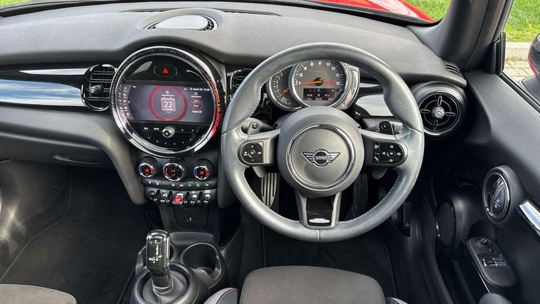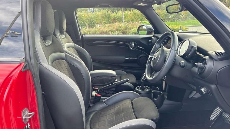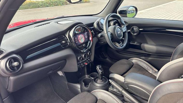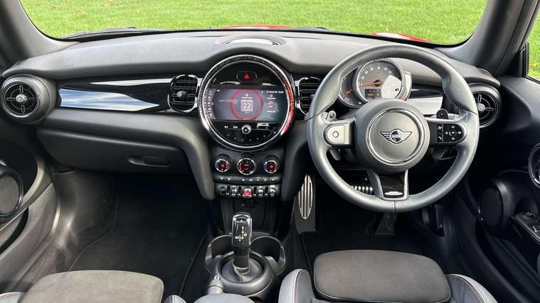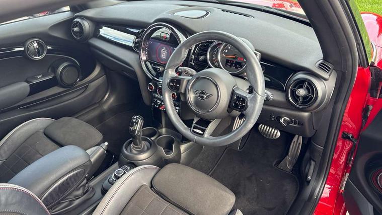 Apple CarPlay, Automatic start/stop function with brake energy recuperation, Compatible mobile phone bluetooth with audio streaming, Cruise control with brake assist, Electro-mechanical speed dependant steering assistance, Flexible car sharing preparation, Instrument cluster, MINI Driving Modes - centre toggle switch to control driving setting (sport, mid and green), Mini E-call, MINI TeleServices, On board computer, Rear park distance control, Service interval indicator, Double Vanos system, Fully variable valve control, High precision injection, Intelligent adaptive suspension, Performance Control, Steptronic sport transmission with double clutch and steering wheel paddles, 8.8" touchscreen with LED ring, FM tuner and DAB digital radio, 3rd brake light, Automatic headlight activation switch, Bonnet scoop, Dynamic brake lights, Electric front windows, Heated rear window, Heated windscreen washer jets, JCW Aerodynamic kit - Front and rear bumpers with sporty JCW styling and part-painted side sills with MINI John Cooper Works door sill finishers, John Cooper Works rear spoiler, LED headlight with closed ring and daytime driving lights, Metal door sill strips with Cooper S, Model logo Cooper S on right of tailgate, Radiator grille chrome border with honeycomb structure including S Badge, Rain sensor window wipers, Rear fog lights, Rear LED lights with union jack design, Rear window wiper, Side scuttle panel with integrated indicator, Sun/heat protection glass, Two central exhaust tailpipes with chrome finisher, White indicator lenses, 12V Accessory socket in centre console, 2 seat bench in 2nd row, 4 lashing eyes in luggage compartment, 60/40 split folding rear seat, Anthracite headliner including grab handles and clothes hooks, Carbon black colour line - Knee roll and door armrest, Chrome interior highlights, Cupholders, Front and rear isofix with front passenger airbag deactivation, Front floor mats in velour, Glove compartment, Height and length steering column adjustment, Interior lighting with 12 different colours across the dashboard, underneath door bezel with illuminated laser-engraved design on central display, JCW Sport seats with integrated headrests, adjustable thigh support and John Cooper Works logo, Leatherette gearshift lever and handbrake gaiters, LED reading lights, vanity mirror lights, front foot well light and spotlight on front seats, Manual air conditioning, Mechanical seat adjustment - forward/back & backrest for front seats and driver seat height adjust, Multifunction steering wheel, Passenger seat height adjuster, Single front passenger seat, Storage compartments in doors, Storage pocket on back of front seats, Sunvisors with vanity mirrors, Walknappa leather steering wheel with grey seam and John Cooper Works badge on Piano Black lower steering wheel spoke, Piano black exterior pack - Mini Hatchback Cooper S, 3 point seatbelts on all four seats, 6 Airbags - front, side, head and seat belt tensioners, Anti-lock braking system (ABS), DSC - Dynamic Stability Control, Front and rear disc brakes, Two tone horn, Tyre pressure monitoring system, Alarm system with tilt sensor, monitoring doors, bonnet interior and tailgate, Electronic vehicle immobiliser, Start/stop toggle with keyless go, Piano black interior trim, Tool kit,