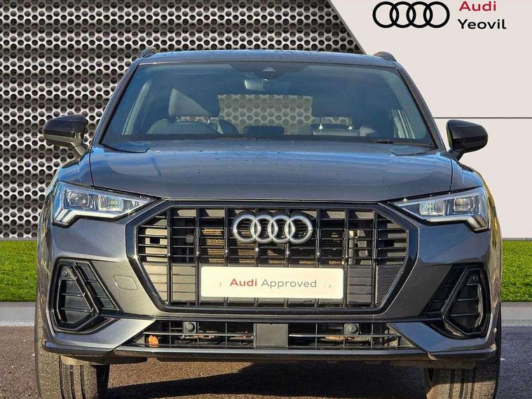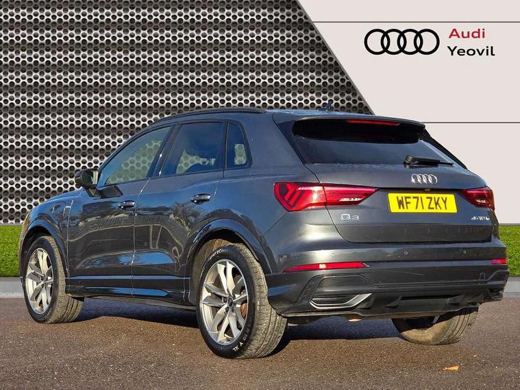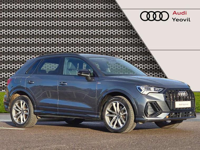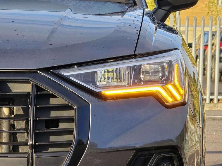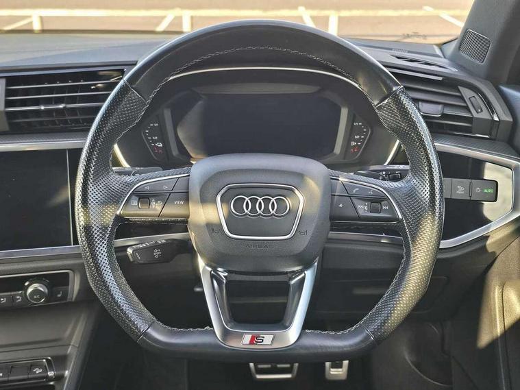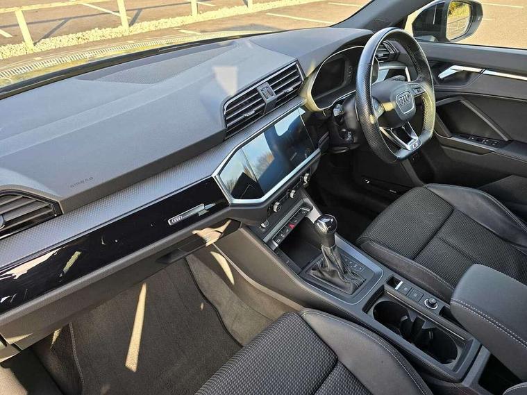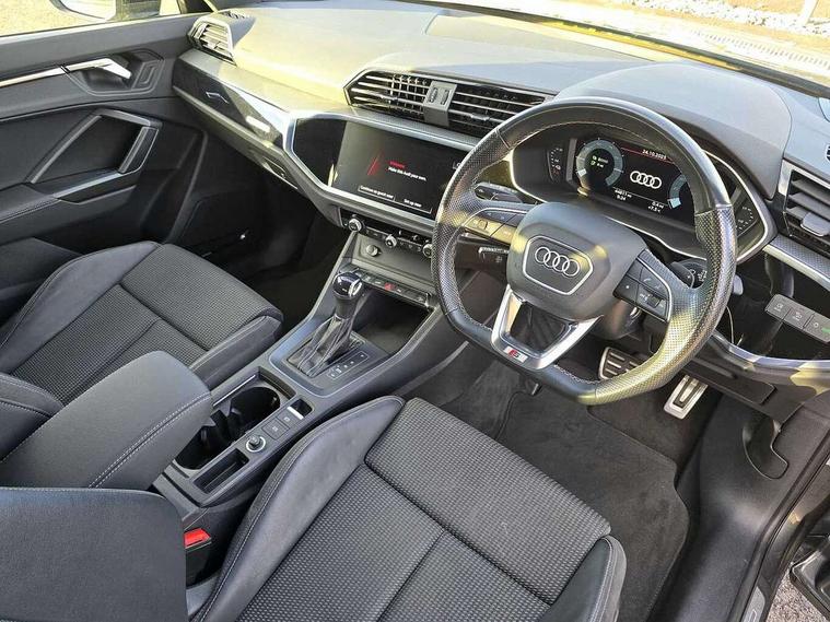 Amazon alexa Integration, Audi connect safety and service (e-call), Audi drive select, Audi lane departure warning, Audi Virtual Cockpit - 10.25" display, Bluetooth interface, Camera based traffic sign recognition, MMI Navigation Plus with high resolution 10.1 inch touchscreen colour display, Power operated tailgate, Progressive steering, Service interval indicator, Smartphone interface includes wireless Apple carplay/Android Auto, Start stop system with recuperation, Voice control system with natural language interaction, 3 pin 10 amp domestic charging cable, Type 2 mode 3 32 amp charging cable, Type 2 socket for AC charging, 2 USB-C ports with charge and data functions, 6 passive loudspeakers, DAB digital radio module, Acoustic windscreen, Auto dimming frameless rear view mirror, Black roof rails, Electrically folding, adjustable and heated door mirrors with integrated LED side indicators and kerb view function for passenger side, Front and rear electric windows, Front fog lights, Grille vertical bars in aluminium silver/Matt, High gloss black finish B and C pillars, LED headlights with LED daytime running lights and dynamic rear indicator, LED rear lights, Privacy glass dark tinted rear and rear-side windows (from B-pillar backwards), Rain and light sensors, Rear diffuser strip in matt titanium black, S line bumpers in contrasting Manhattan grey, 12V socket in rear centre console, 40:20:40 folding with manual adjustment for 60:40 forwards/backwards position and backrest angle, Adjustable rear seat bench/backrest with centre armrest and cupholder, Black cloth headlining, Dual zone electronic climate control, Front and rear black floor mats with contrast stitching in rock grey, Front and rear headrests, Front and rear roof module including reading lights, Front centre armrest, Glove compartment lighting, Height and reach adjustable steering wheel, Illuminated door sill trims with S logo, ISOFIX child seat mounting for front passenger with airbag deactivation and outer rear seat including top tether attachment point for outer rear seats, Luggage compartment light, Manual front seats with height adjustment, Perforated leather gearknob, Stainless steel luggage compartment sill finisher, Stainless steel pedals, Black styling pack - Q3, Non smoking pack - Q3, 3x3 point rear seatbelts, 6 airbags - Driver, front passenger, curtain and side windows, Audi pre-sense front with pedestrain and cyclist recognition, Electrically operated child locks on rear doors, Electromechanical parking brake, Electronic stabilisation control including ABS, ASR and EDL, Hill descent control, Hill hold assist, Pre sense basic, Seatbelt monitoring, Tyre pressure warning, Warning triangle and first aid kit, Anti theft alarm, Anti theft wheel bolts, Remote central locking, Detail dashboard around MMI touch colour display in glass look, black with surround in aluminium look, Leatherette door armrest, Piano black inlay,