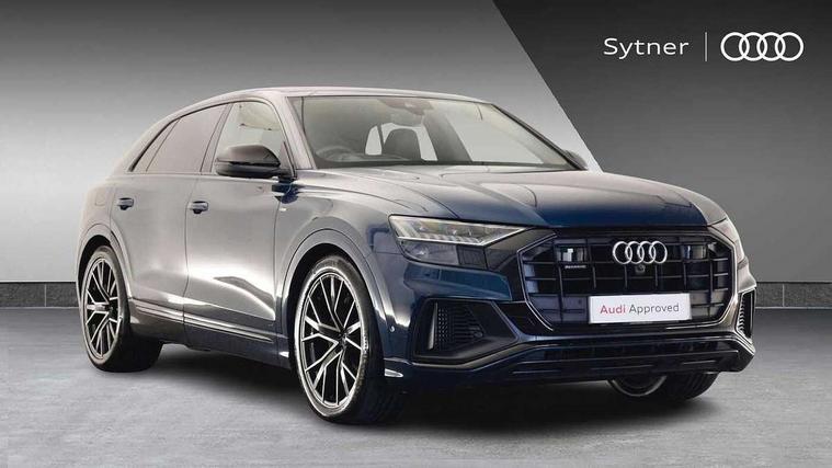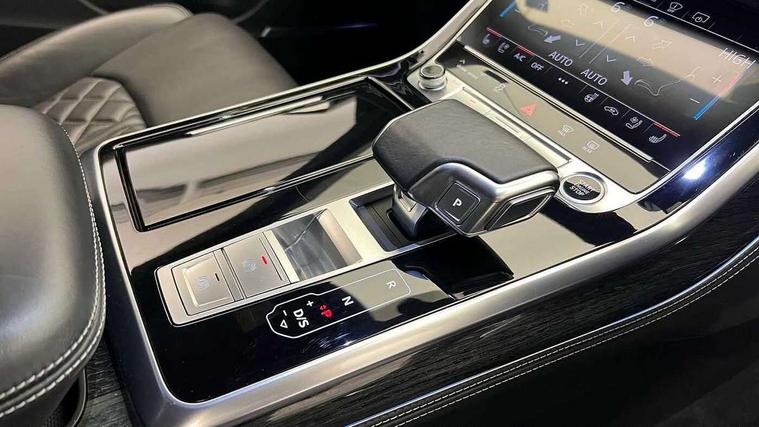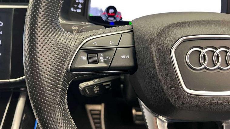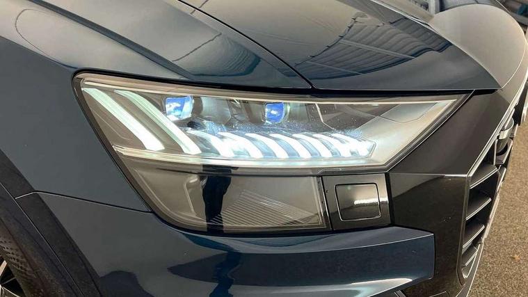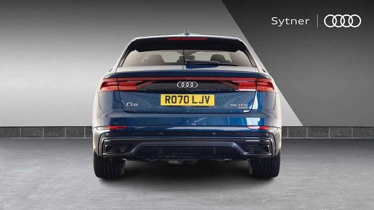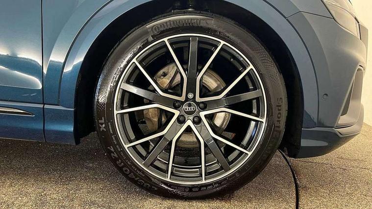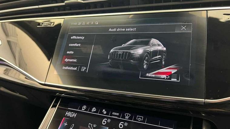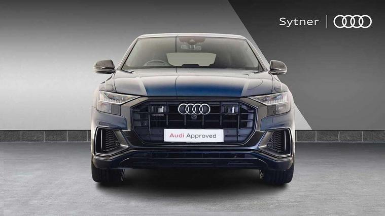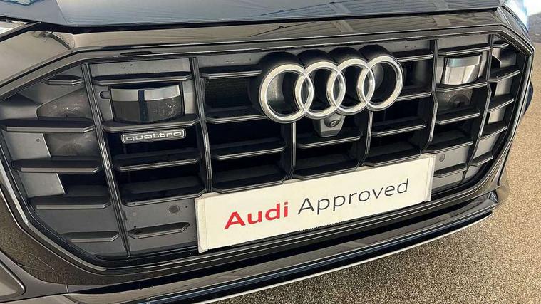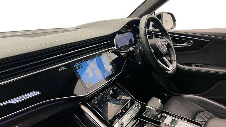 10.1" and 8.6" Dual colour touchscreens, All wheel steering, Audi connect safety and service (e-call), Audi drive select, Audi phone box with wireless charging, Audi smartphone interface with wireless Apple CarPlay, Audi virtual cockpit plus, Automatic start/stop system, Electro-mechanical PAS, Head up Display, Low washer fluid indicator, MMI - Multi Media Interface control system, MMI navigation plus with MMI touch, Natural voice recognition, On board computer, Operating buttons in black, glass look with haptic feedback, Power door closure, Power operated tailgate, Service interval indicator, 48V Mild hybrid technology, 85 litre fuel tank, Adaptive sport air suspension, Quattro all wheel drive with self locking centre differential, Audi music interface with 2 USB ports with charge and data functions, Audi music interface with 2 USB ports with charge and data functions in the rear, Aux-in socket, DAB Digital radio, Acoustic windscreen, Adaptive windscreen wipers with integrated washer jets, Audi Beam uses LEDs to project Vorsprung logo, Audi HD Matrix LED headlights with dynamic front and rear indicators, Auto dimming frameless rear view mirror, Coming/leaving home lighting function, Electric front+rear windows, Electric panoramic glass sunroof, Electrically adjustable/heated/folding/auto dimming door mirrors with integrated LED indications + kerb view function for passenger side, Headlight washers, Heat insulating glass in windshield, LED signature daytime running lights, Platinum grey front spoiler lip and diffuser insert with honeycomb grille in black, Privacy glass - dark tinted rear and rear side windows from B-pillar backwards, Rain and light sensors, Rear wiper, 3 spoke heated leather multi-function sport steering including paddle shift, 4 zone deluxe automatic climate control, 4-way lumbar support for front seats, 40:20:40 split folding rear bench seat, Black Alcantara headlining, Comfort front centre armrest, Double sun visor with illuminated vanity mirror on driver and passenger side extendable, Driver and front passenger seat memory function for electrically adjustable front seats, Electric adjustable steering column with memory functionality, Electric sunblind for the rear side windows and manual sunblind for the rear window, Front head restraints, Front/rear floor mats, Heated front and outer rear seats, ISOFIX child seat mounting for front passenger seat and 2 outer rear seats with top tether child seat mounting for all 3 rear seats, Luggage compartment sill protection in stainless steel, Massage and ventilation function for front seats, Rear centre armrest with 2 cupholders, Rear headrests, Rear seat bench plus, Stainless steel pedals, Valcona leather upholstery + super sports seats with S embossed logo, City assist pack - Q8, Comfort and Sound pack - Q8, Extended leather pack - Q8, Titanium Black Styling Pack - Q8, Tour pack - Q8, 3 point seatbelts on all seats, Audi pre sense front, Driver and front passenger, front side and curtain airbags, Electromechanical parking brake, Electronic Stability Control (ESC) including ABS, ASR and EDL, Front passenger airbag deactivation, Hill descent control, Hill hold assist, Predictive pedestrian protection, Seatbelt monitoring, Traction control, Tyre pressure loss indicator, Warning triangle and first aid kit, Anti theft alarm with tow away protection, Anti-theft wheel bolts and wheel loosening detection, Immobiliser, Keyless go with remote central locking, Polished oak trim with grey finish inlay, Tool kit, Tyre repair kit,