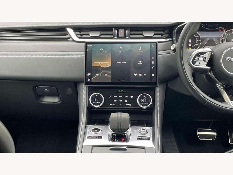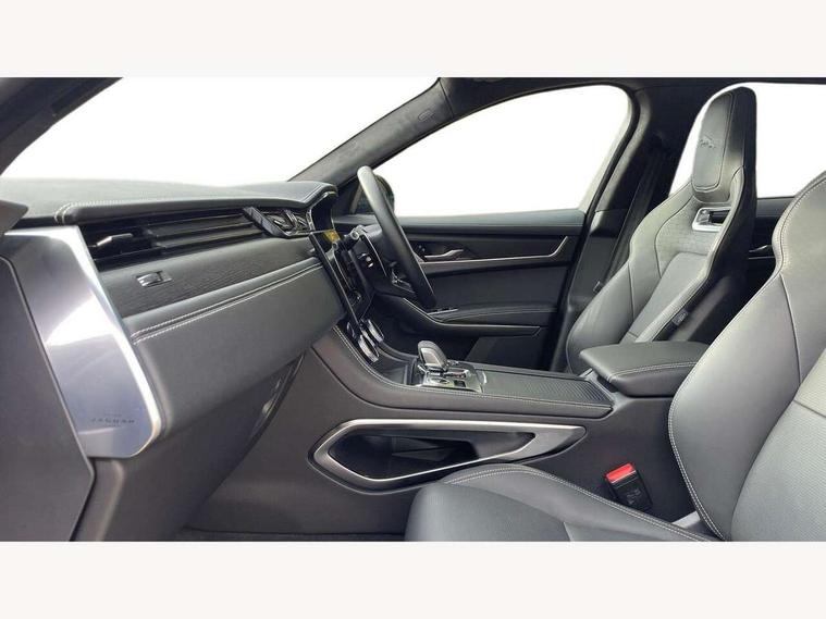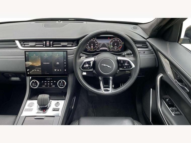11.4" touchscreen, Adaptive cruise control with steering assist, Android Auto, Apple car play, Blind spot assist, Bluetooth connectivity, Clear exit monitor, Driver alert system, Driver condition monitor, eCall emergency call system, Eco driving style assistant, Electric power assisted steering, InControl remote, Interactive driver display digital with 12" TFT display, Jaguar Toggle shift selector, Lane departure warning system, Lane keep assist, Outside temperature gauge, Personalisation profile management, Pivi pro connected navigation system with app interface and media storage, Pro services and wifi hotspot, Push button starter, Rear collision monitor, Rear traffic monitor, Service interval indicator, Speed proportional steering, Start up sequence with movement in dials and lighting, Traffic sign recognition with adaptive speed limiter, Trip computer, Voice control system, Wireless device charging, 7 kW onboard charger, 8 speed automatic transmission, AC/DC charging, Adaptive dynamics, All terrain progress control, All Wheel Drive (AWD), Configurable dynamics, Home charging cable, Open differential with torque vectoring by braking, Public charging cable, AM/FM radio, Bluetooth streaming, DAB Radio (Digital Audio Broadcasting), Dynamic volume control, InControl apps, InControl protect, iPod integration, 3 flash lane change indicators, Animated directional indicators, Approach Illumination, Auto dimming rear view mirror, Auto high beam assist, Automatic headlights, Electric heated/power fold memory door mirrors with approach lights and auto dimming driver side, Electric windows with one touch open/close and anti trap, F-Pace and R Dynamic badge, Green tinted glass, Heated front windscreen + heated washer jets, Heated rear window with timer, Illuminated metal tread plates with Jaguar script, Jaguar script and leaper, LED High level third brake light, LED tail lights, Metal load space scuff plates, Non acoustic front windscreen, P400e AWD badge, Privacy glass, R Dynamic badge on side door, Rain sensor windscreen wipers, Rear fog lights, Rear metal tread plates, Rear side wing doors, Rear wiper, Trailer stability assist, Variable front intermittent wipers, 12V power point front, 3 rear headrests, 3 seat bench in 2nd row, Additional power sockets - Two additional USB sockets in rear centre console and one 12V socket in trunk, Air distribution speed, Bright metal foot pedals, Centre armrest console, Centre console with side storage, Configurable cabin lighting, Deletion loadspace storage rails, Door sill tread plates, Ebony suede cloth headlining, Electrically adjustable steering column, Fold flat front seats, Front centre armrest with storage compartment, Front door storage space, Glovebox finisher with jaguar script, Heated steering wheel, Hooks in loadspace, Illuminated glovebox, Interior front door handles with separate locking switches, ISOFIX on outer rear seats, Jaguar sense, Leather steering wheel, Luggage tie downs in loadspace, Mist sensing, Multifunction steering wheel, Overhead lighting console, Overhead stowage for sunglasses, Passive front head restraints, Premium carpet mats, Rear air vents, Rear armrest with twin cupholders, Rear centre headrest, Rear door storage space, Reversible boot floor, Satin chrome gearshift paddles, Shopping bag hook, Single front passenger seat, Sunvisors with illuminated vanity mirrors, Twin front cupholders with cover, Online Pack with data plan - F-Pace, 380mm front brakes and 325mm rear brakes, 3x3 point rear seatbelts, ABS, All surface progress control (ASPC), Brake pad warning light, DSC - Dynamic Stability Control, Electric parking brake (EPB), Emergency brake assist, Front airbags with passenger seat occupant detector, Front and rear seatbelt reminder, Front side airbags, Full length side window curtain airbag, Hill launch assist, Power operated child locks, Traction control, Tyre pressure monitoring system, Immobiliser, Keyless entry, Keyless Start, Locking wheel nuts, Perimeter alarm, Remote central locking, Valet mode,