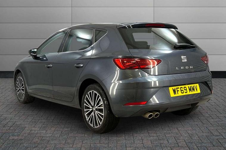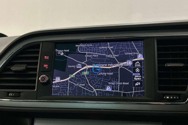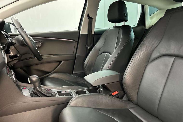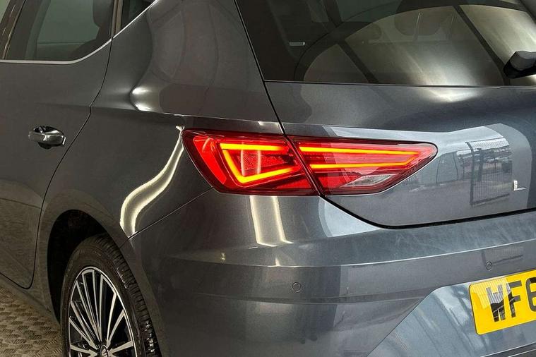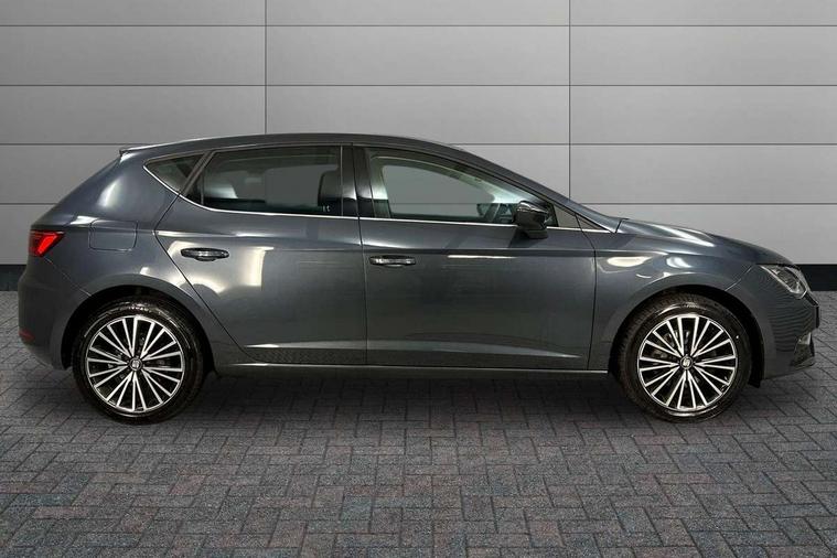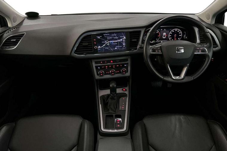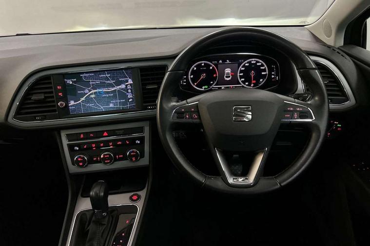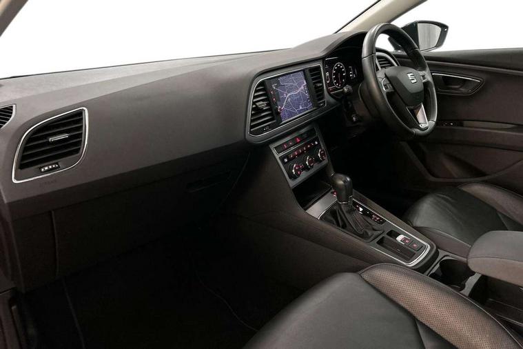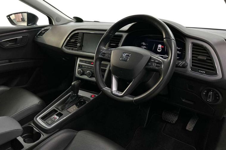 Digital cockpit, Electro-mechanical power steering, Front and rear parking sensors, Front assist with pedestrian protection, Full Link Smartphone Integration with Mirror Link, Apple Car Play, Google Android Auto with USB Type C cable for Apple and Android compatibility, Media system plus with 8" display, 4 USB, 8 speakers, CD, voice control, DAB, bluetooth and handsfree, steering wheel mounted audio and phone control, Navigation system 3D map display, high resolution colour driver display, two SD card slots, Rear view camera, RPM, trip computer, outside temp gauge, instrument light brightness, low fuel warning light, lights on reminder, gearshift indicator, SEAT logo boot release, Service interval indicator, Comfort suspension, XDS electronic differential lock, Auxiliary input socket, SEAT USB media cable, Body colour door handles, Body coloured bumpers, Body coloured exterior mirrors with integrated LED indicators, Chrome window trim, Dark tinted rear windows, Electric folding door mirrors, Electric front/rear windows, Electrically adjustable and heated door mirrors, Front grille frame in chrome, Front grille hot stamping, Full LED headlights with LED day time running lights + LED rear tail lights + LED licence plate lights and LED front and rear fog lights, High gloss black finish B and C pillars, Illuminated aluminium front door sill with XCELLENCE logo, Rear wash/wipe, Visible twin exhaust tailpipes, 12v power point in centre console, 60/40 split folding rear seat with armrest, Additional heating and ventilation outlet in rear of centre console, Boot storage net, Cargo rings in boot, Driver and passenger seat height adjust, Driver and passenger sun visor, covered and illuminated mirror, driver sun visor with card holder, Driver seat lumbar adjustment, Dual zone climate control, Dust/pollen filter, Front centre armrest with storage compartment, Front cupholders x 2, Front passenger seat lumbar adjustment, Front seatback storage pockets, Front sport seats in leather, Front/rear floor mats, Height adjustable front and rear headrests and third rear headrest, Height/reach adjust steering wheel, High centre console with integrated box & cup holder, rear air outlet, with armrest in front seats, ISOFIX points in outer rear seats with top tether anchorage points, Leather steering wheel with XCELLENCE logo and leather gear knob, Luggage tie-down hooks, Multi-colour ambient interior lighting, Storage box under drivers and passenger seat, Convenience pack+ - Leon, Driving assistance pack with adaptive cruise control - Leon, Safety pack - Leon, Winter pack - Leon, 3 point seatbelts on all rear seats, ABS, traction control system, electronic stability control, Child proof door locks, Driver and front passenger airbags with front passenger airbag de-activation, front side, curtain, driver knee airbags, EBA, Electric handbrake, Electronic parking brake with auto hold, Front seatbelt pretensioners, Front seatbelt reminder, Hill hold control, Multi-Collision braking, Tyre pressure monitoring system, 2 folding remote keys with window open/close function and boot opening/door mirror folding function, Central locking fuel filler cap, Engine immobiliser, Keyless entry and go with wireless phone charger, Locking wheel bolts, Remote central locking + deadlocks, Volumetric alarm with back up horn, Chrome interior detailing, 17" Dynamic machined atom grey alloy wheels 30/4,