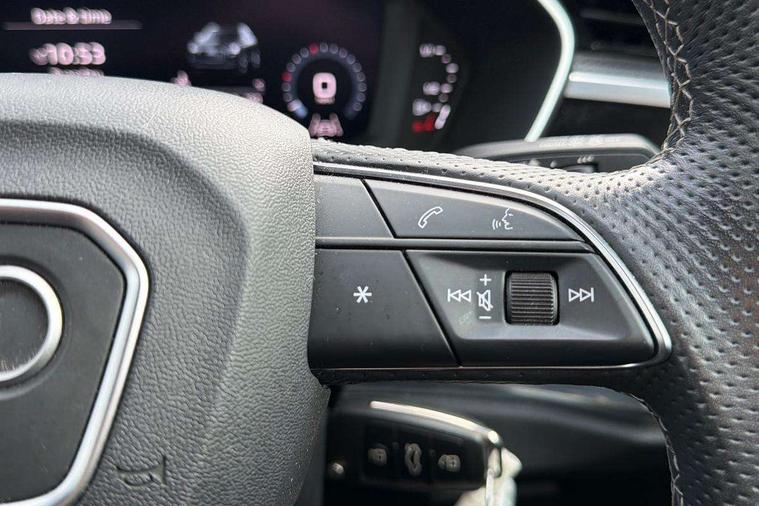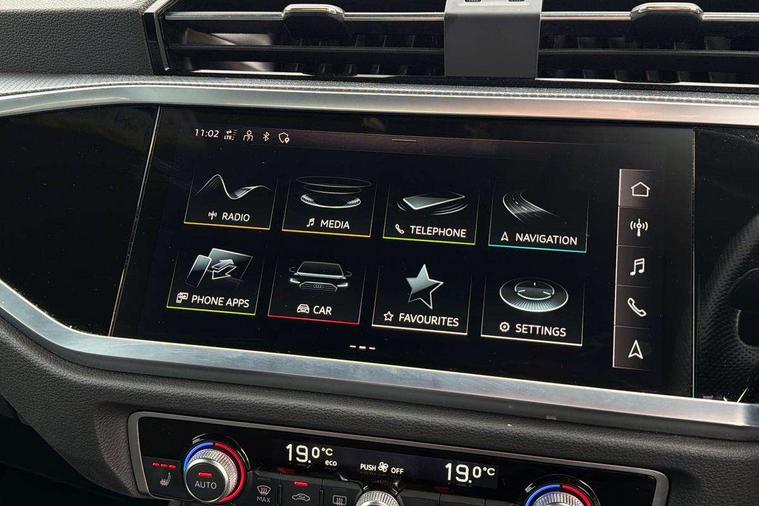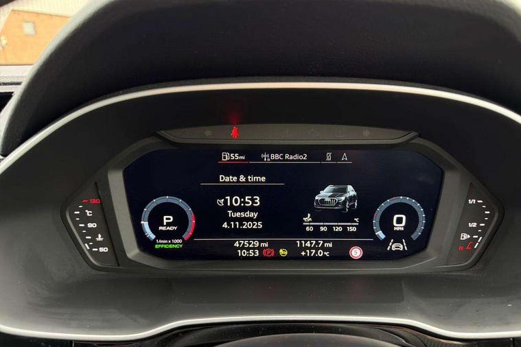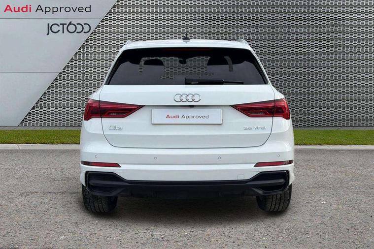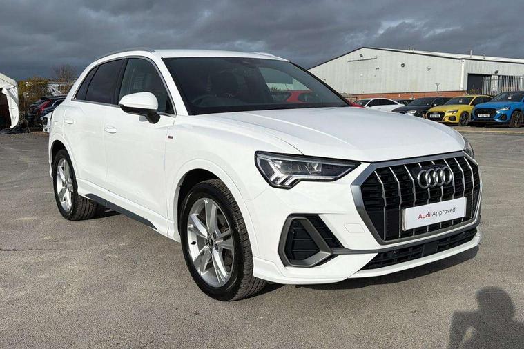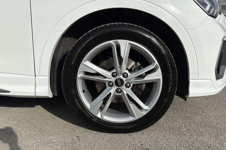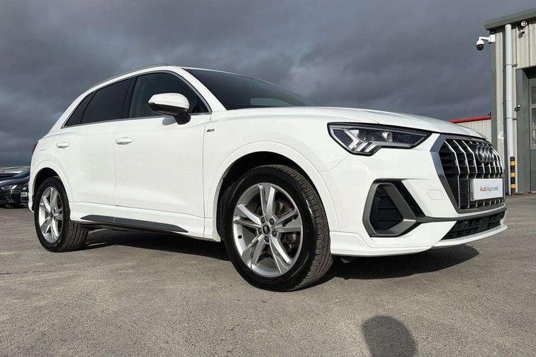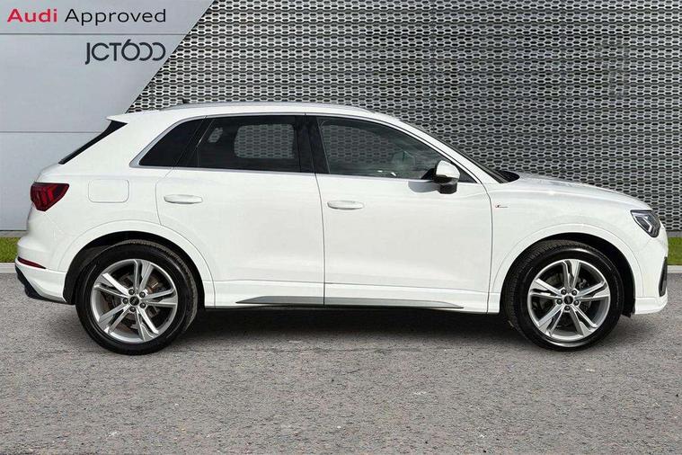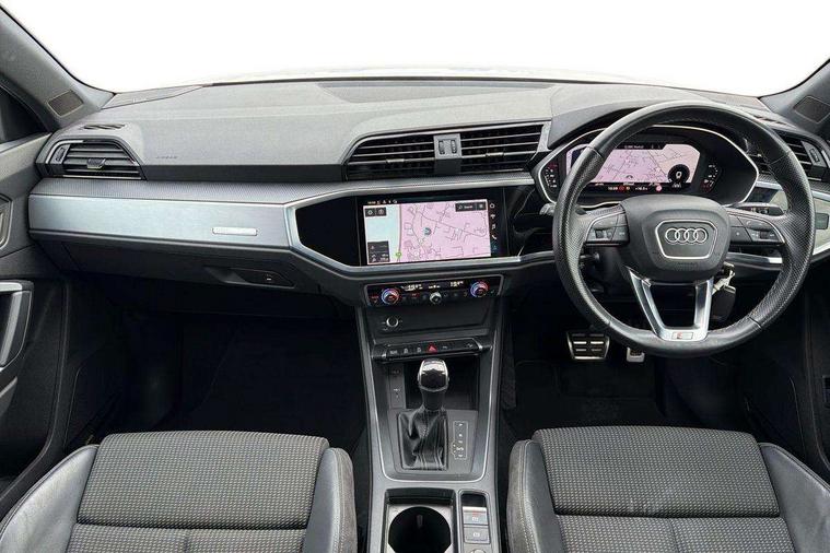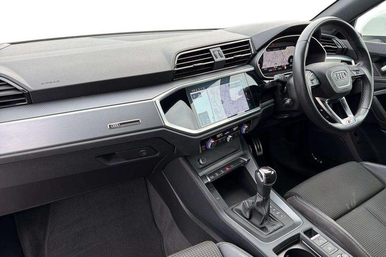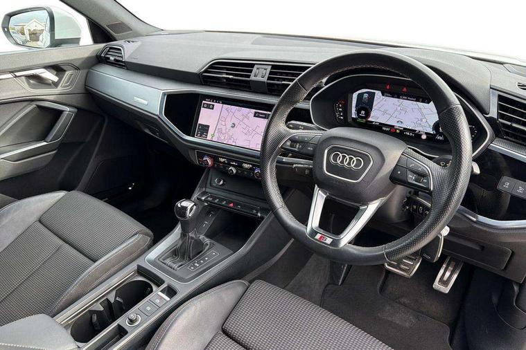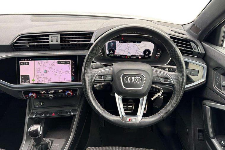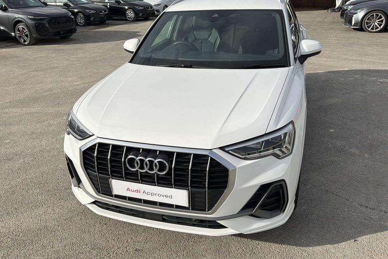 Amazon alexa Integration, Audi connect safety and service (e-call), Audi drive select, Audi lane departure warning, Audi Virtual Cockpit - 10.25" display, Bluetooth interface, Camera based traffic sign recognition, MMI Navigation Plus with high resolution 10.1 inch touchscreen colour display, Power operated tailgate, Progressive steering, Service interval indicator, Smartphone interface includes wireless Apple carplay/Android Auto, Start stop system with recuperation, Voice control system with natural language interaction, 48V Mild hybrid technology, Sports suspension, 2 USB-C ports with charge and data functions, 6 passive loudspeakers, DAB digital radio module, Acoustic windscreen, Aluminium roof rails, Aluminium window trim, Auto dimming frameless rear view mirror, Body coloured bumpers, Electrically folding, adjustable and heated door mirrors with integrated LED side indicators and kerb view function for passenger side, Front and rear electric windows, Front fog lights, Front side air inlets in matt platinum grey, Front spoiler blade in matt platinum grey, Grille vertical bars in aluminium silver/Matt, High gloss black finish B and C pillars, LED headlights with LED daytime running lights and dynamic rear indicator, LED rear lights, Privacy glass dark tinted rear and rear-side windows (from B-pillar backwards), Rain and light sensors, Rear diffuser strip in matt titanium black, S line badges on front wings, S Line front and rear bumpers, Side skirt insert in matt Platinium grey, Silver chrome grille surround, Titanium black radiator grille, 12V socket in rear centre console, 40:20:40 folding with manual adjustment for 60:40 forwards/backwards position and backrest angle, Adjustable rear seat bench/backrest with centre armrest and cupholder, Black cloth headlining, Dual zone electronic climate control, Front and rear black floor mats with contrast stitching in rock grey, Front and rear headrests, Front and rear roof module including reading lights, Front centre armrest, Glove compartment lighting, Height and reach adjustable steering wheel, Illuminated door sill trims with S logo, ISOFIX child seat mounting for front passenger with airbag deactivation and outer rear seat including top tether attachment point for outer rear seats, Luggage compartment light, Manual front seats with height adjustment, Perforated leather gearknob, Stainless steel luggage compartment sill finisher, Stainless steel pedals, Non smoking pack - Q3, 3x3 point rear seatbelts, 6 airbags - Driver, front passenger, curtain and side windows, Audi pre-sense front with pedestrain and cyclist recognition, Electrically operated child locks on rear doors, Electromechanical parking brake, Electronic stabilisation control including ABS, ASR and EDL, Hill descent control, Hill hold assist, Pre sense basic, Seatbelt monitoring, Tyre pressure warning, Warning triangle and first aid kit, Anti theft alarm, Anti theft wheel bolts, Remote central locking, Dark matt brushed aluminium inlay, Detail dashboard around MMI touch colour display in glass look, black with surround in aluminium look, Leatherette door armrest, Tool kit, Tyre repair kit,