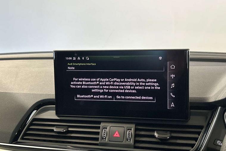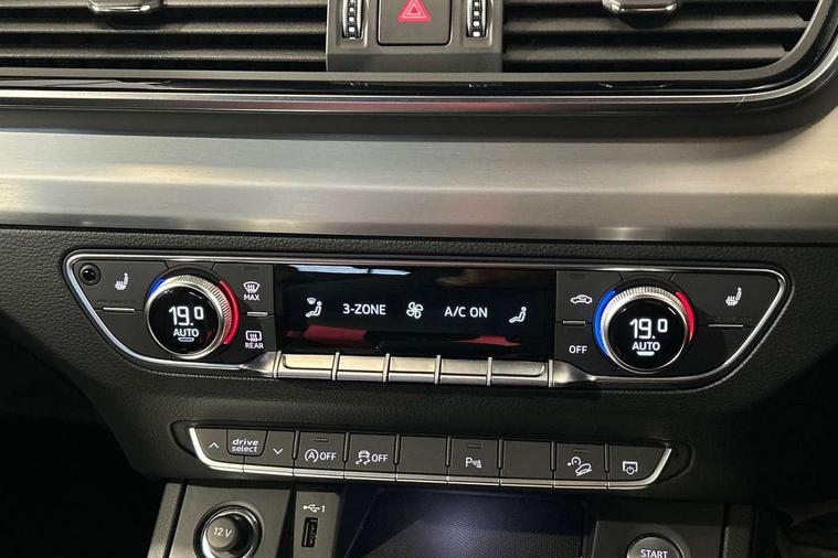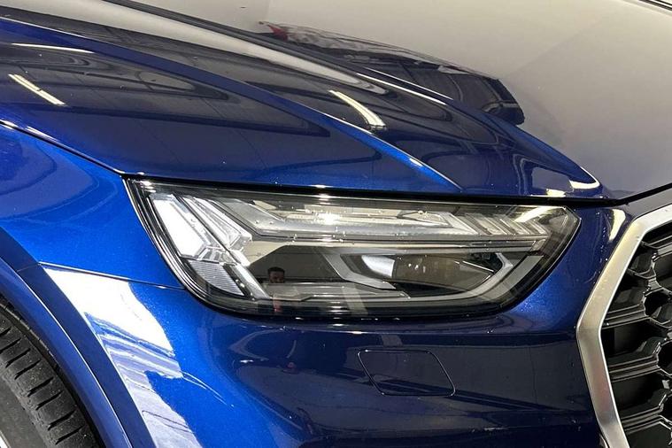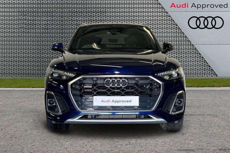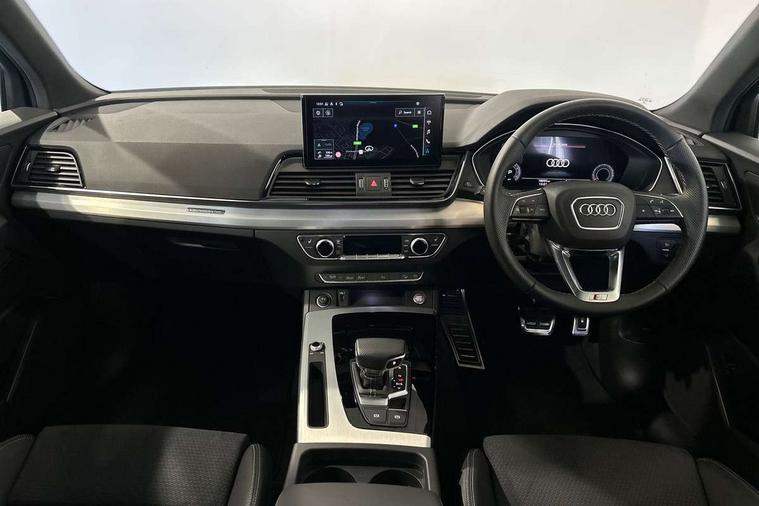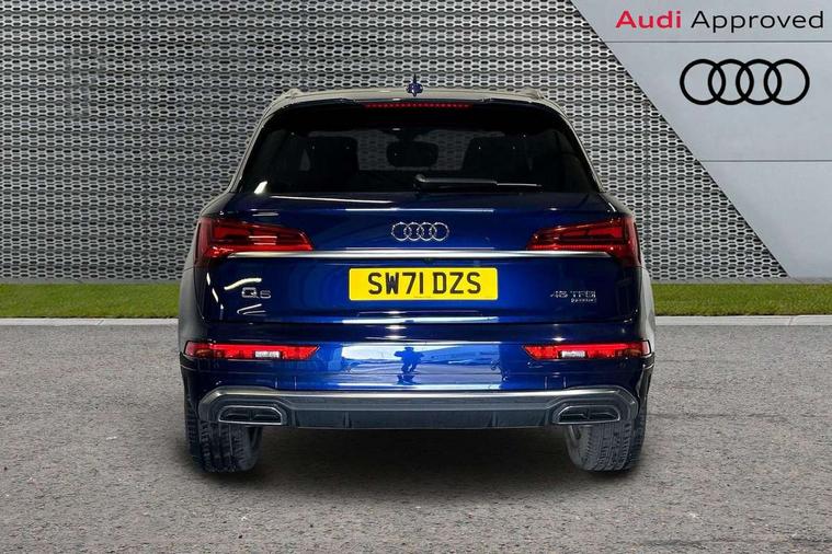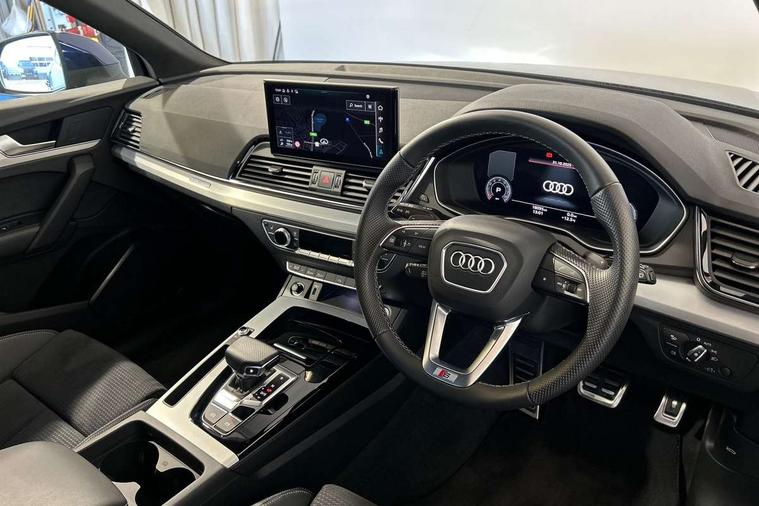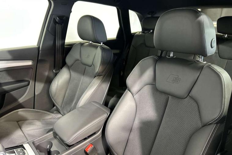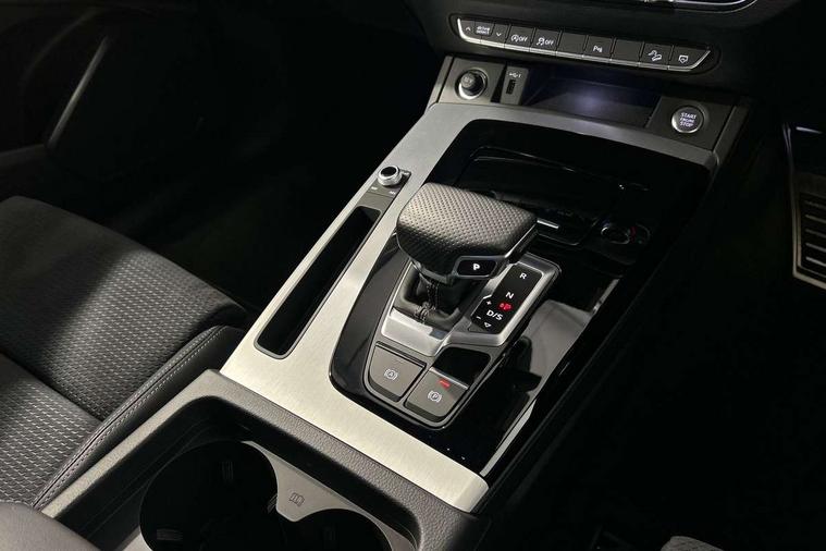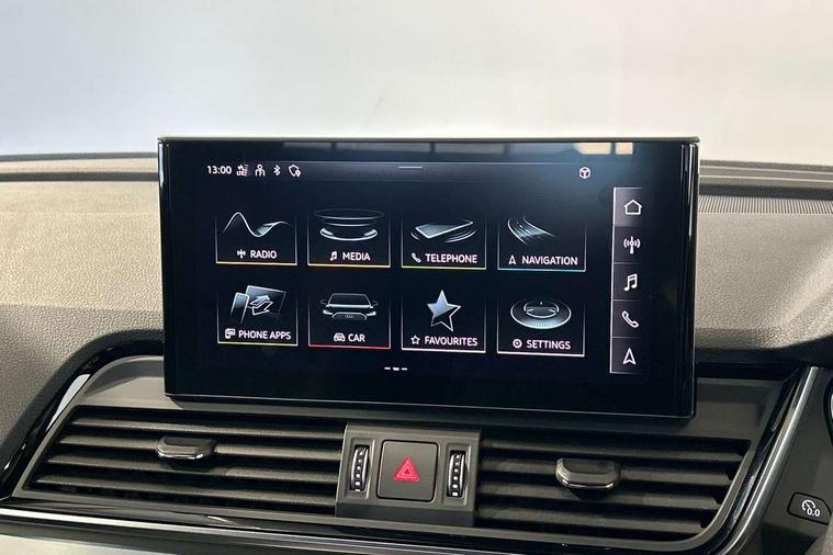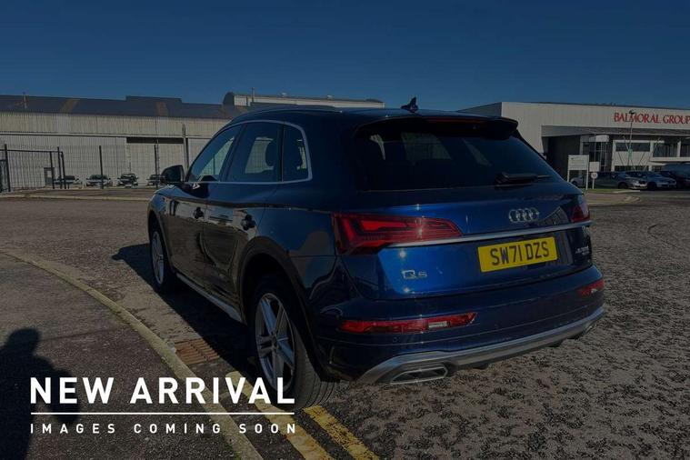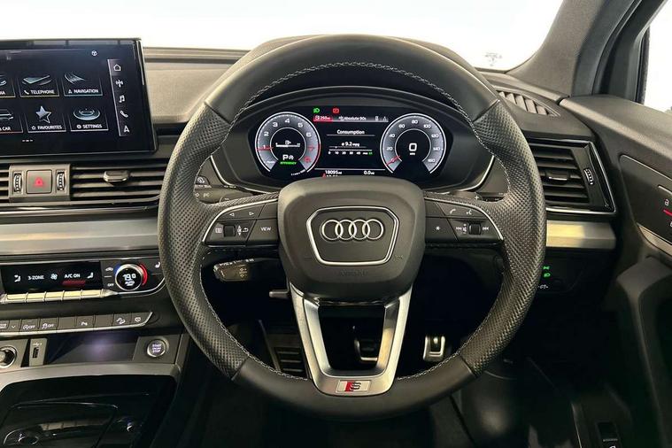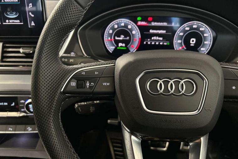 Audi connect safety and service (e-call), Audi connect with Amazon Alexa Integration, Audi drive select, Audi virtual cockpit plus with 12.3" screen and three different layout designs, Audi wireless smartphone interface, Automatic start-stop system with coasting functionality and efficiency programme, Bluetooth interface, Electro - mechanical power assisted steering, MMI navigation plus with 10.1" touch screen, Power tailgate, Reversing camera, Service interval indicator, Voice control system with Audi hotword activation "Hey Audi", Quattro on demand, S line sports suspension, 2 x USB charging port with aux input socket, DAB Digital radio, 3rd brake light, Acoustic windscreen, Aluminium roof rails, Audi matrix LED headlights with dynamic front and rear indicators, Auto dimming rear view mirror, Automatic headlights and windscreen wipers, Body colour bumpers, Body colour door mirrors, Body colour rear diffuser with matt aluminium silver surrounds, Body colour underbody protection, Chrome plated exhaust trims, Daytime running lights, Door sills in Selenite silver, Electric adjustable/heated/folding door mirrors, Front air inlet surrounds in aluminium, Front and rear electric windows, Front radiator grille in honeycomb design, Headlight washers, Lower bumpers painted in contrast Manhattan grey, Rear chrome trim strip below lights, Rear privacy glass and rear side windows, Rear side wing doors, Rear spoiler, Rear wiper, Roof bars, S Line badges on the front wings, S Line front and rear bumpers, S Line side skirts, 3 rear headrests, 40:20:40 split folding 3 rear bench seat in 2nd row with rear centre armrest, Black cloth headlining, Comfort front centre armrest, Contrast stitching on seats, steering wheel and gear lever gaiter, Deluxe 3 zone electronic climate control, Front/rear floor mats, Gear lever in black leather, Heated front seats, Height adjustable front head restraints, Height/reach adjustable steering column, Illuminated door sill trims with S logo, ISOFIX child seat mounting and top tether, Luggage compartment cover, Manual seat adjustment with 4-way electric lumbar support, Removable luggage compartment floor, Single front passenger seat, Stainless steel pedals, Sunvisors with vanity mirrors, High gloss pack - Q5, LED interior light pack - Q5, 3 point seatbelts on all seats, 6 airbags - Driver, front passenger, curtain and side airbags, Electrically operated child locks on rear doors, Electromechanical parking brake, Electronic stabilisation control including ABS, ASR and EDL, Front passenger airbag deactivation, Hill descent control, Hill hold assist, Multi collision brake assist, Pop-up bonnet for pedestrian protection, Pre sense city, Seat belt force limiter, Seatbelt monitoring, Tyre pressure warning, Warning triangle and first aid kit, Anti theft alarm, Anti-theft wheel bolts, Keyless Go access/ignition system, Matt brushed aluminium inlays,