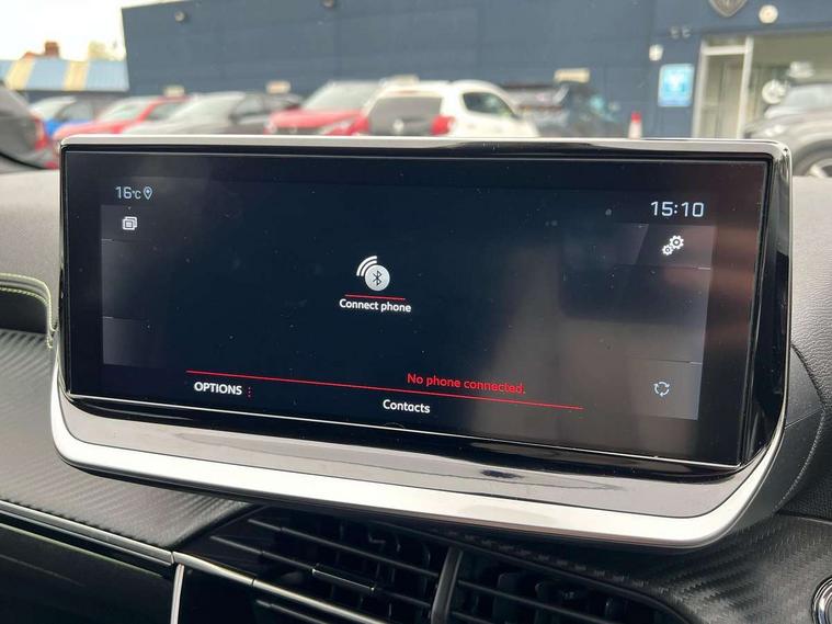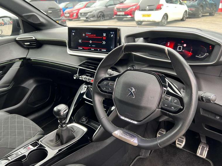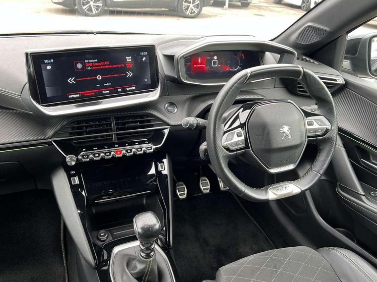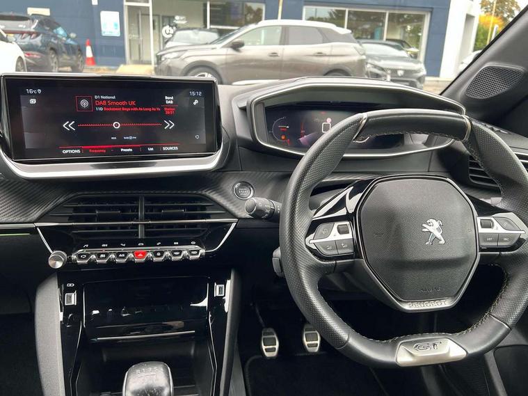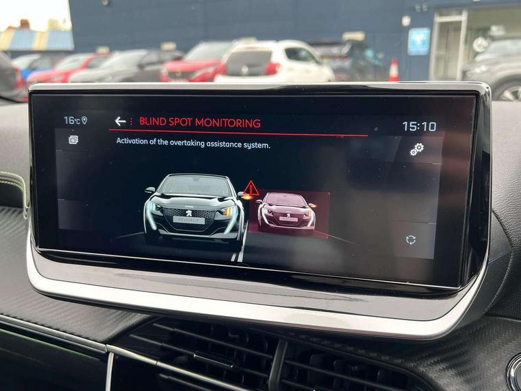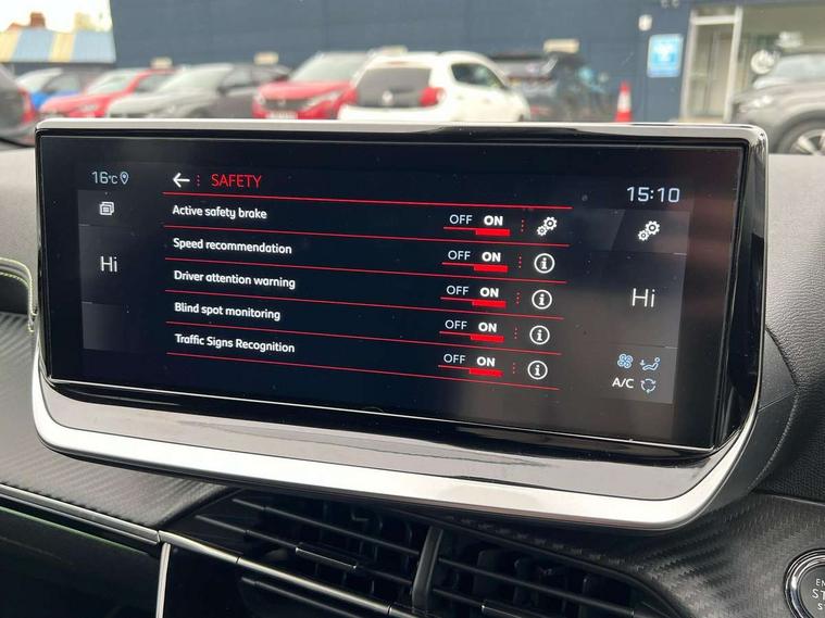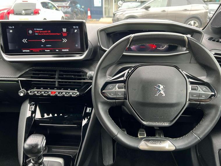 10" Capacitive colour touchscreen with connected 3D navigation, Blind spot monitoring, Bluetooth telephone facility, Driver attention warning, Exterior temperature indicator with ice warning, Lane keep assist, Mirror screen with mirror link, apple carplay and android auto, Multi function trip computer, PEUGEOT i-Cockpit with compact steering wheel, PEUGEOT i-Cockpit with configurable 3D headup instrument panel, PEUGEOT SOS and assistance, Push button start, Smart phone docking station, Speed limit recognition and recommendation, Start/stop system, Visio park assist 180 with colour reversing camera + front and rear parking sensor, 2 front USB socket with USB-C, 2x USB sockets in rear, 6 speakers radio with mp3 compatible, DAB Digital radio, Voice recognition for radio, navigation and telephony features, 2 X Rear number plate lights, Automatic hazard light activation upon heavy brake application, Automatic lights, Automatic windscreen wipers, Body coloured exterior door handles, Dark tinted rear side and tailgate windows, Diamond black rear spoiler (roof), Diamond Black roof, Electric front windows + one touch + anti-pinch, Electric rear windows with one touch/anti-pinch, Electrically adjustable, heated and power folding door mirrors, Follow me home headlights, Frameless electrochrome interior rear view mirror, Full LED headlights with smartbeam assist, Gloss black finish on B pillar, Gloss black rear cluster connecting strip, Gloss black wheel arch extensions, Gloss black window surround, GT model designation badging on C pillar, GT model designation badging on tailgate, Headlights left on audible warning, LED daytime running lights with 3 claw headlight with distinctive tooth design, LED side indicator lights integrated into door mirrors, LED third brake light, Model designation badges front and rear, Nera black door mirror shells, Peugeot scuff plates, Radiator grille - Dark chrome chequered and gloss black edge trim, Rear bumper with gloss black finish, Rear full LED 3D peugeot signature claw effect lights with daylight function, Rear lower bumper diffuser effect trim in gloss black, Rear reversing lights, Rear side wing doors, Rear windscreen wiper triggered automatically in reverse gear, Roof mounted aerial with fin design, Roof spoiler, Single exhaust tailpipe, Tailgate with heated rear windscreen and wiper blade, Variable front intermittent wipers, 1/3 to 2/3 split folding rear seats, 12V socket, 3 seat bench in 2nd row, 8 Colour personalisable ambient lighting, Aluminium pedals and foot rest, Automatic air conditioning, Driver and front passenger seat manual adjustment in longitudinal and back rest angle, Driver and front passenger seat mechanical height adjustment, Driver and front passenger sport seats, Electric power steering with reach and rake adjustable steering column, Front and rear carpet mats in black with lime green stitch detail, Front centre armrest with storage compartment, Front LED interior light with 2 reading spotlights and rear interior light with timer, Gear shift indicator, High centre console with 2 cup holders, ISOFIX child seat mounting points on passenger seat, Lime green contrast stitching to armrest, front centre console, door panels and dashboard facia, Map pockets on the backs of the front seats, Mistral full grain perforated leather steering wheel with aikinite stitch detail and satin chrome 'GT' emblem, Piano keys gloss black plated toggle switches to access main functions of the vehicle, Piano keys gloss black plated toggle switches to access touchscreen functions, Rear centre headrest, Roof lining - Mistral black, Satin chrome gear lever, Seatbelt unfastened on the move audible and visual alert for front and rear seats, Single front passenger seat, Drive assist pack - 208, 3 rear 3 point seatbelts, ABS (Anti-lock Braking System) with EBD (Electronic Brakeforce Distribution) and EBA (Emergency Braking Assistance), Active safety brake with night function/cyclists/pedestrians, Adaptive driver and front passenger airbags with passenger airbag deactivation function, Child locking functionality on rear doors, Driver/front passenger side airbags, Electric parking brake, ESP with Hill Assist, Front and rear curtain airbags, Front and rear disc brakes, Front optimised safety headrests and 3 x rear retractable headrests with height adjustable, Front three point retractable seatbelts with force limiters, Tyre pressure sensor, Acoustic vehicle alert system (AVAS), Automatic door locking when moving off, Deadlock, Electronic code immobiliser, Peugeot Open and Go System, Remote central locking, Thatcham cat. 1 alarm with anti lift sensor, Carbon effect Dashboard, front and rear door panel finish, 17" Bronx two-tone alloy wheels, Space saver spare wheel,